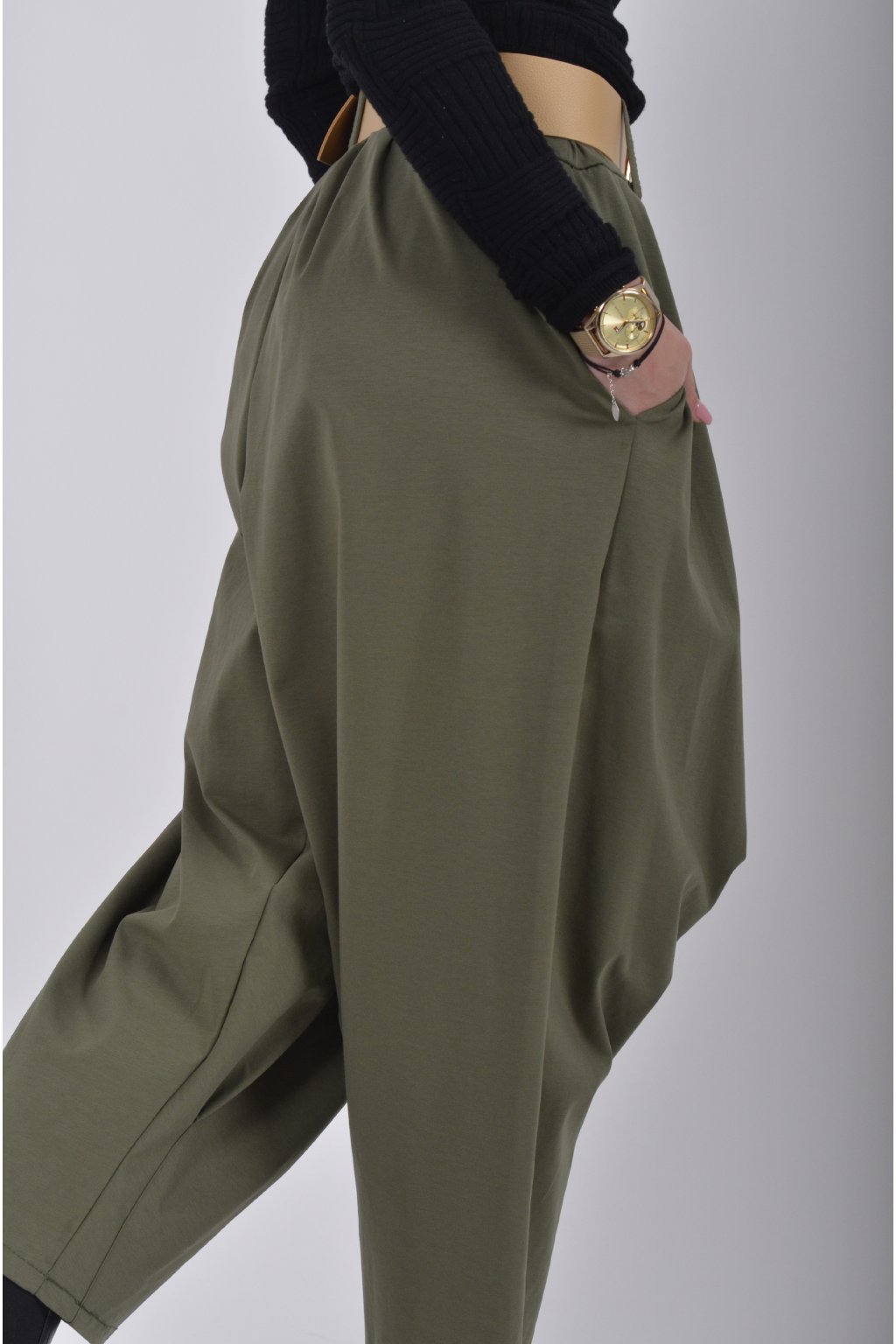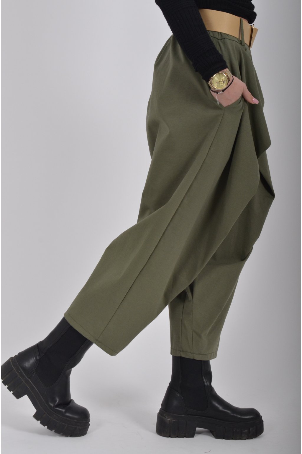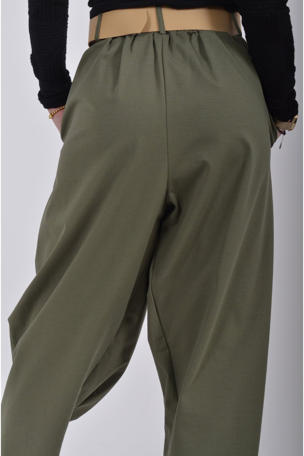 Jednobarevné kalhoty s překříženým pasem a kapsami na bocích. Krásně přizpůsobí postavě, díky podílu elastanu. Jsou vhodné pro každodenní nošení. V pase je zapracovaná guma. Ke kalhotám je jako dárek koženkový pásek, který lze odejmout a nosit na jiných kalhotách.