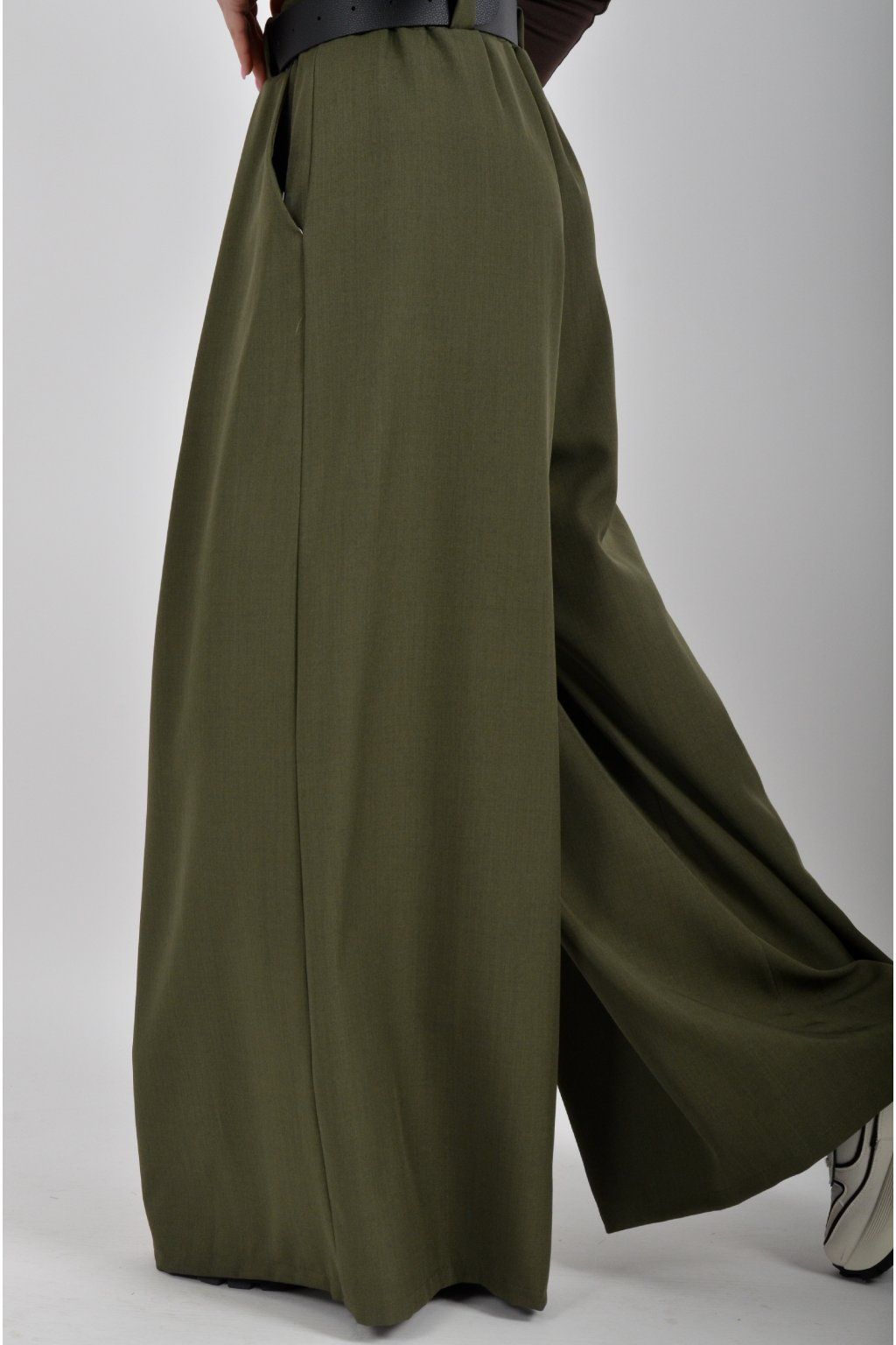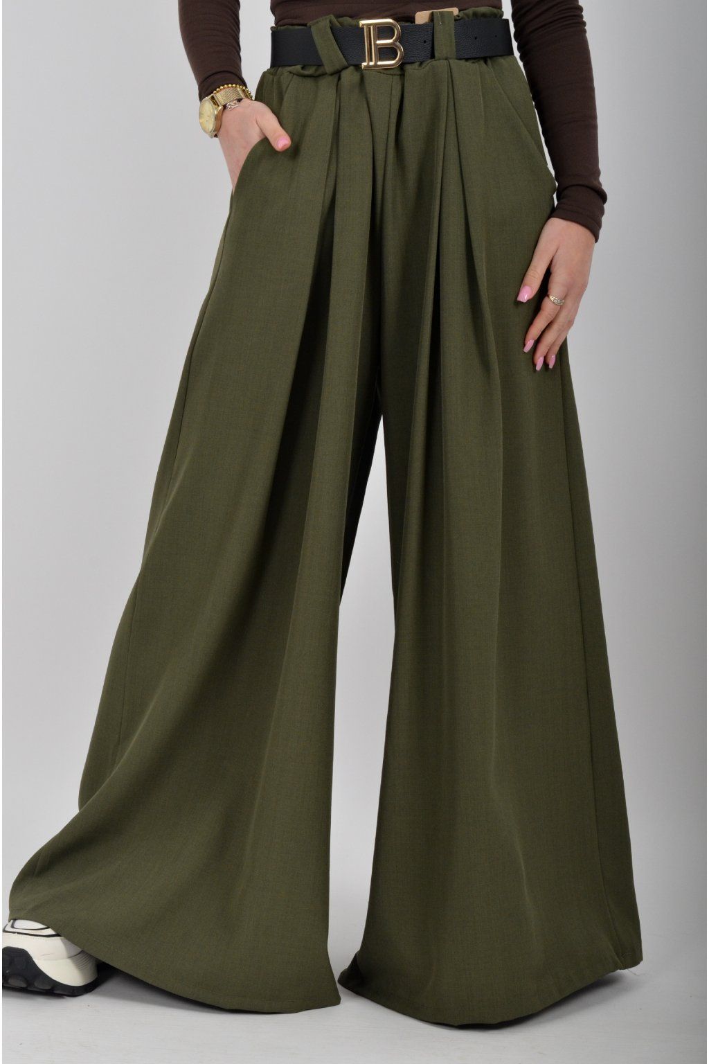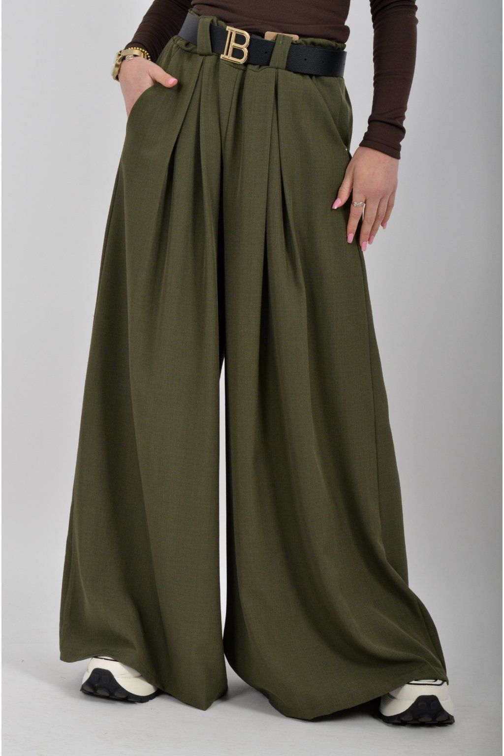 Kalhoty se širokými nohavicemi vyrobené z odlehčeného a velice příjemného materiálu. Materiál kalhot je lehce pružný. V pase mají zapracovanou gumu, na bocích jsou kapsy a jako dárek je pásek, který lze odejmout a použít pro nošení k jiným kouskům.