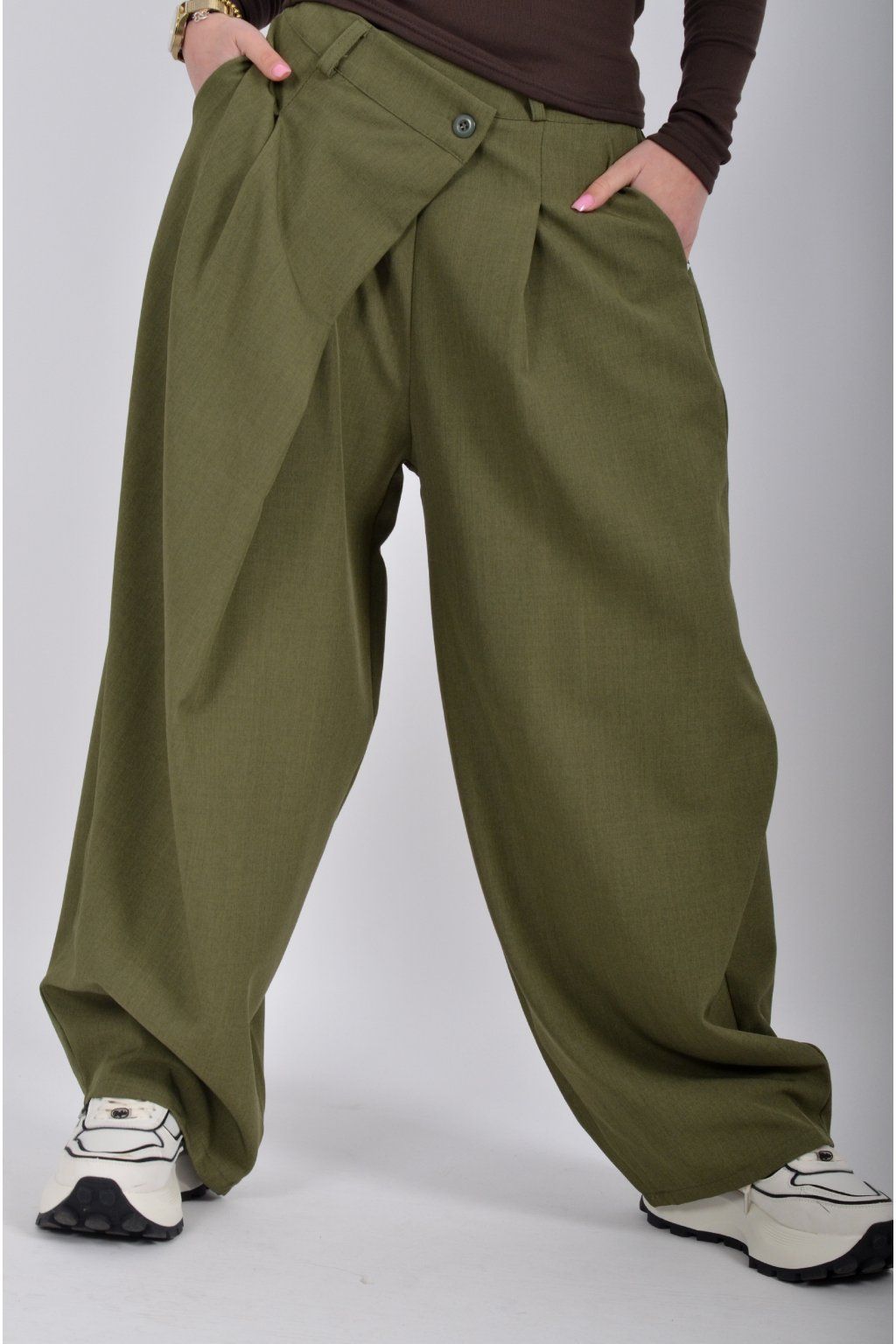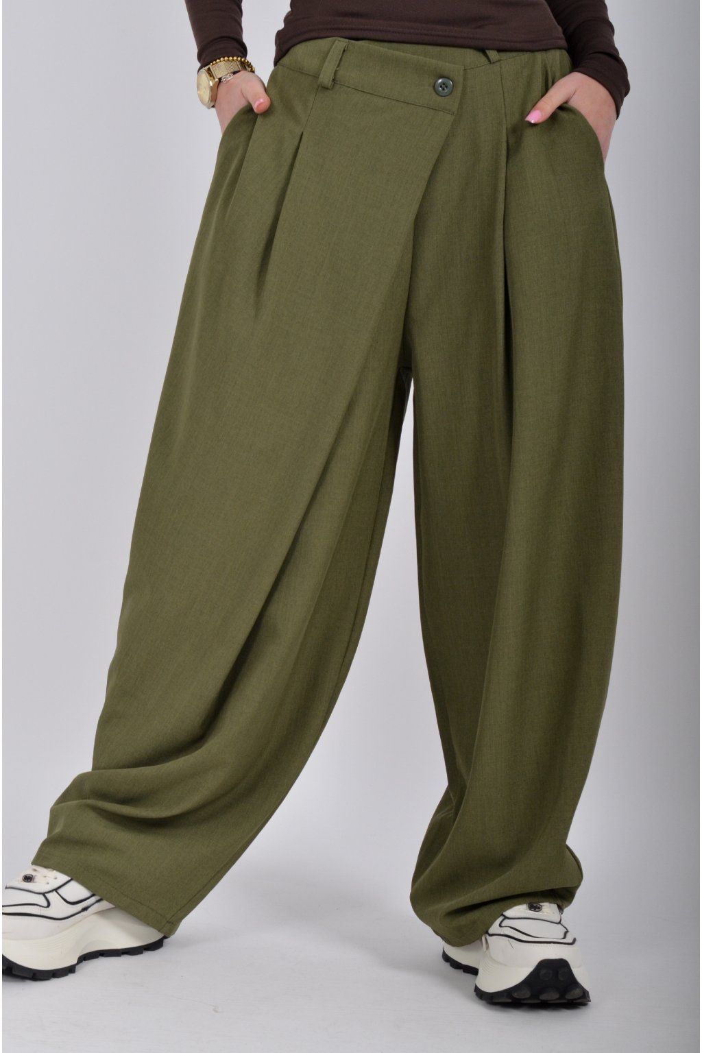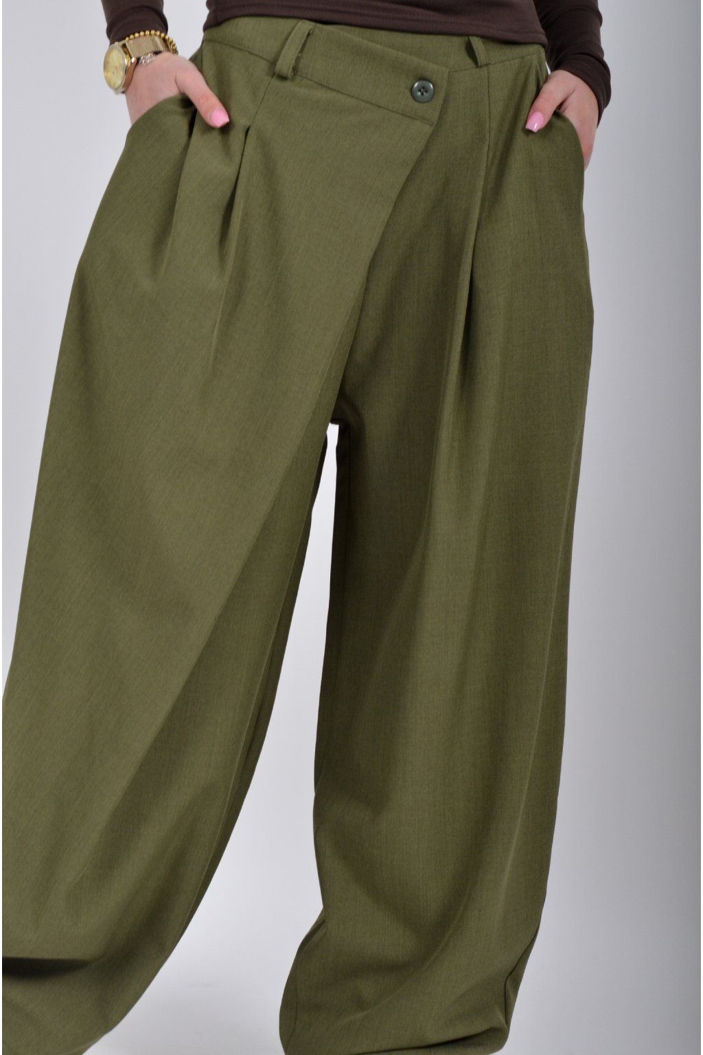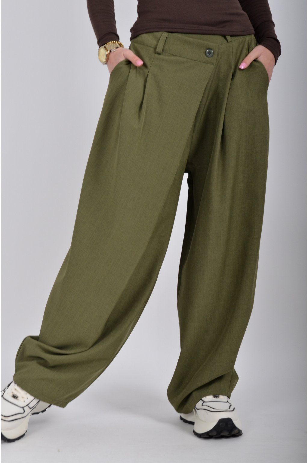 Jednobarevné kalhoty s překříženým pasem a kapsami na bocích. Krásně přizpůsobí postavě, díky podílu elastanu. Jsou vhodné pro každodenní nošení. V pase je zapracovaná guma a jsou vyrobené z příjemného odlehčeného materiálu.