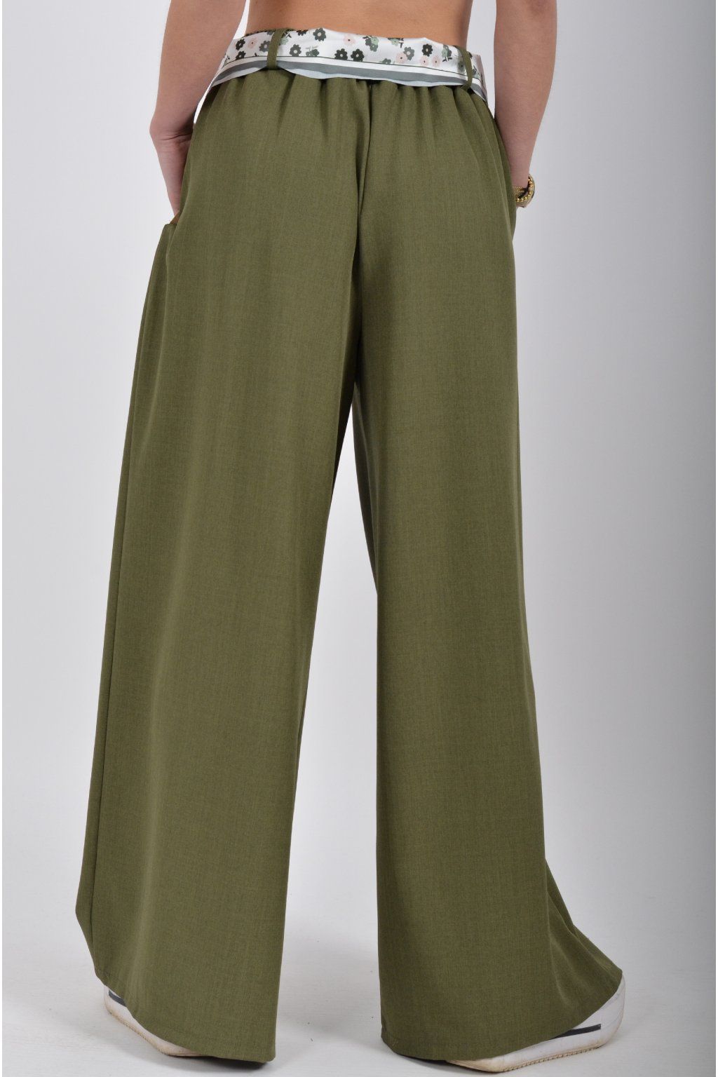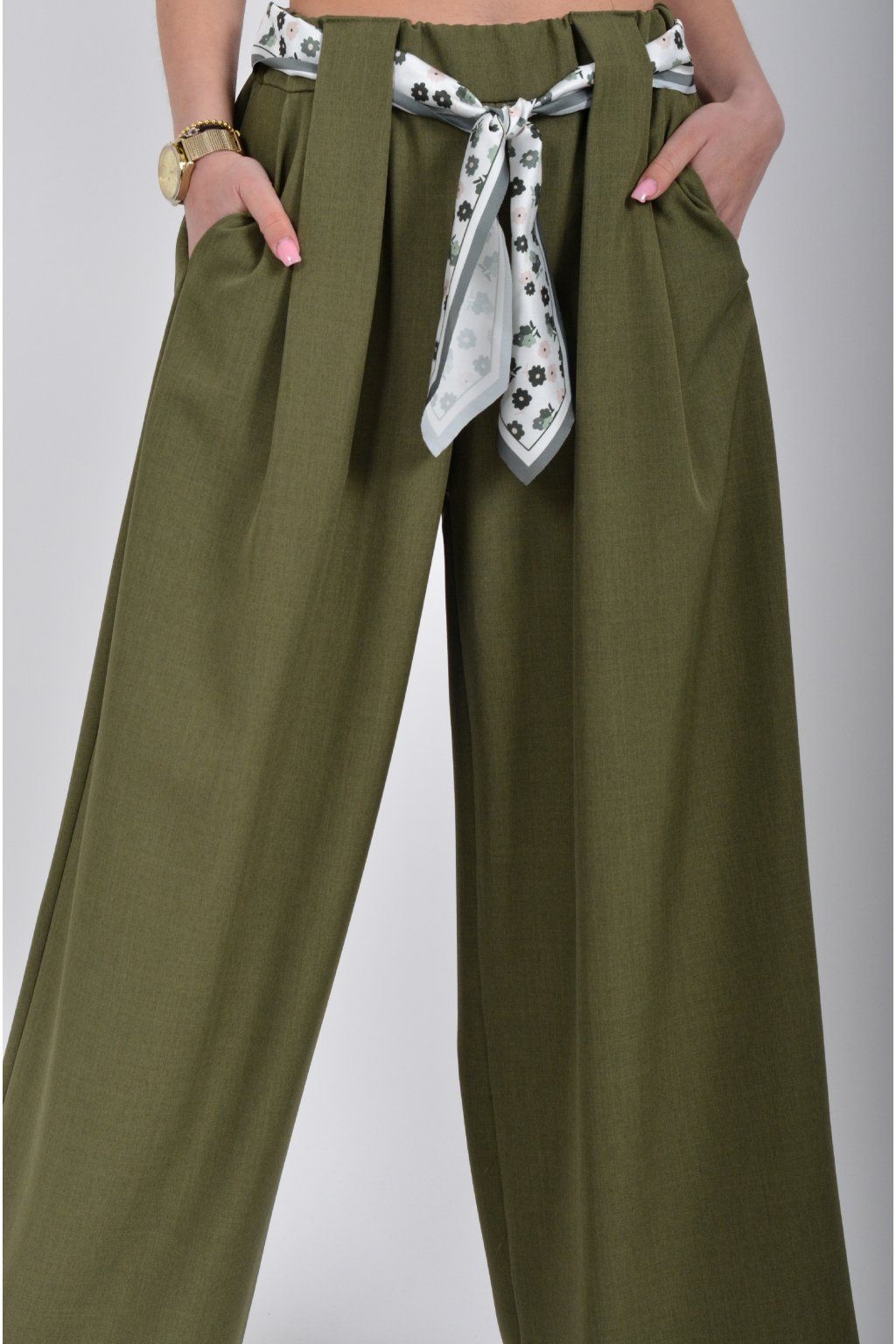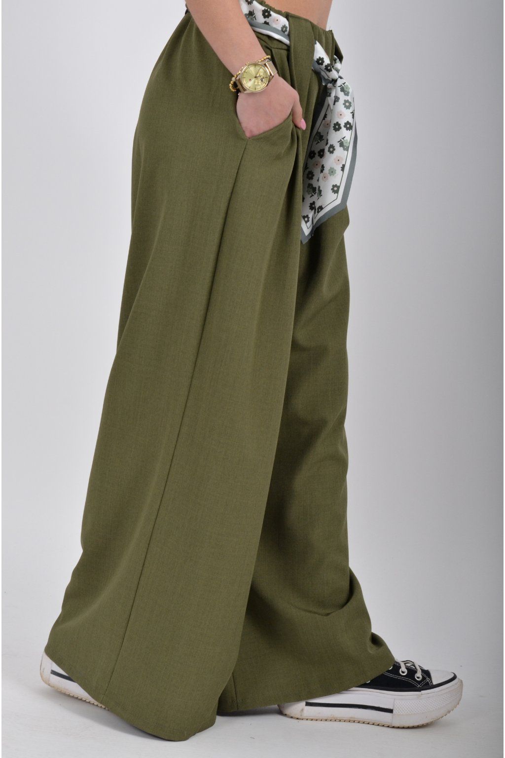 Kalhoty se širokými nohavicemi a kapsami na bocích, které se krásně přizpůsobí postavě, díky podílu elastanu. Jsou vhodné pro každodenní nošení. V pase je zapracovaná guma a pásek ve formě "šátku" pro libovolné stažení.