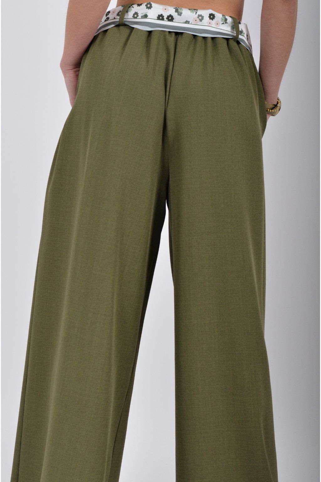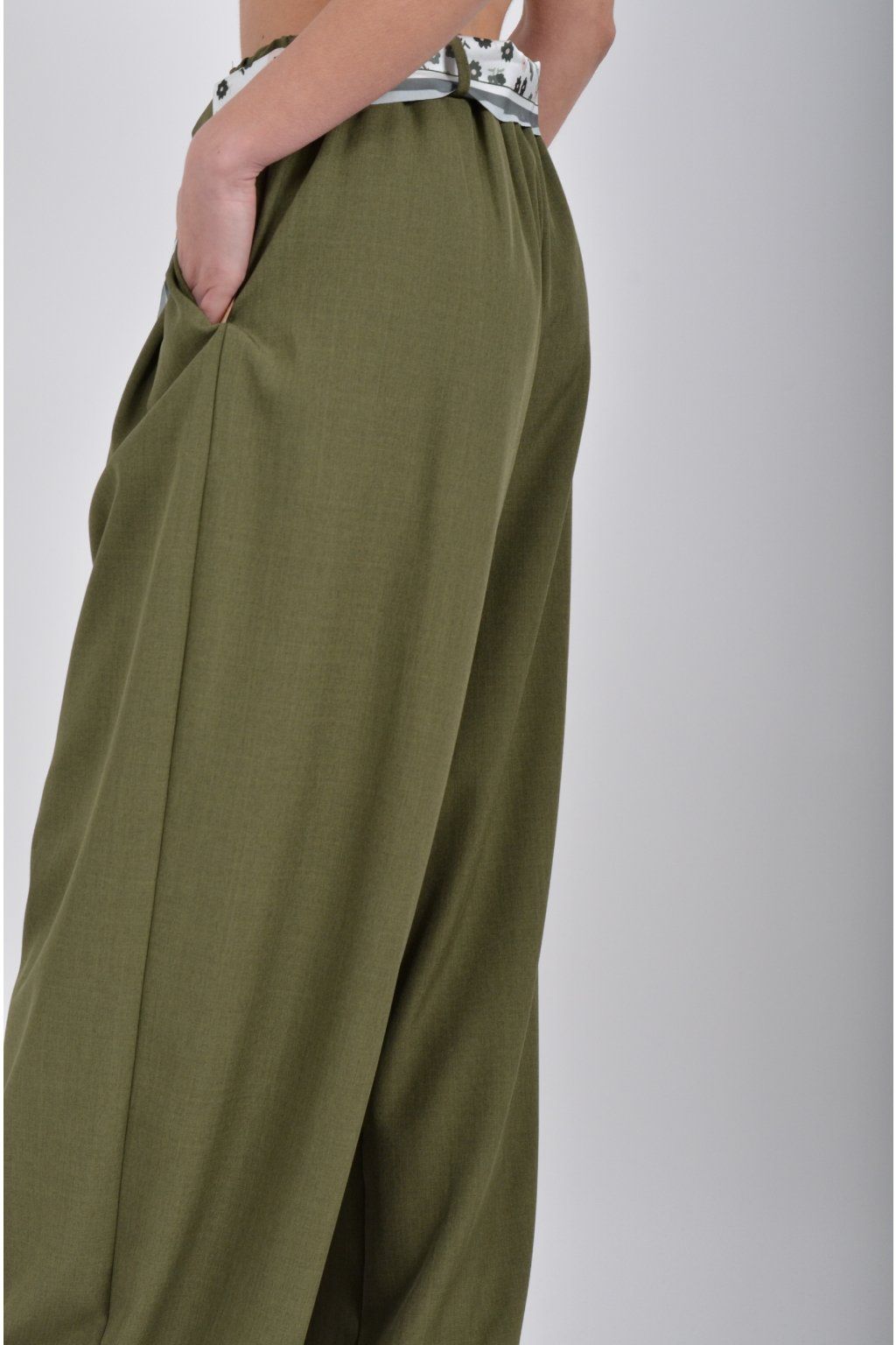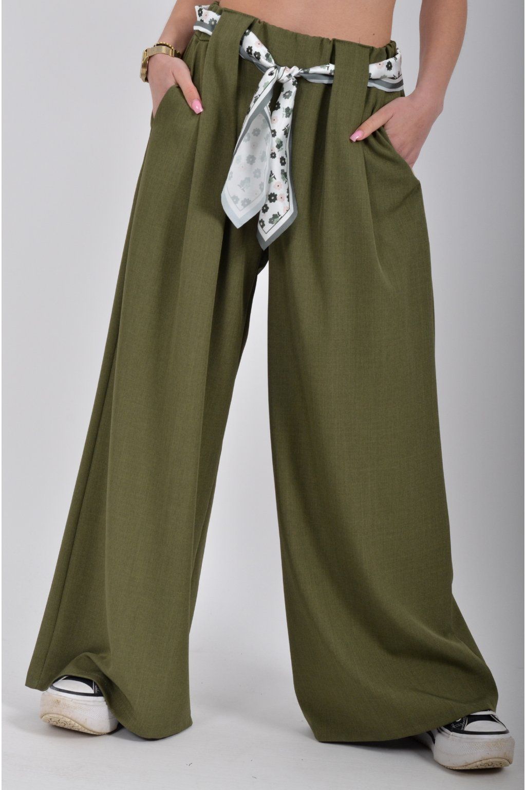 Kalhoty se širokými nohavicemi a kapsami na bocích, které se krásně přizpůsobí postavě, díky podílu elastanu. Jsou vhodné pro každodenní nošení. V pase je zapracovaná guma a pásek ve formě "šátku" pro libovolné stažení.