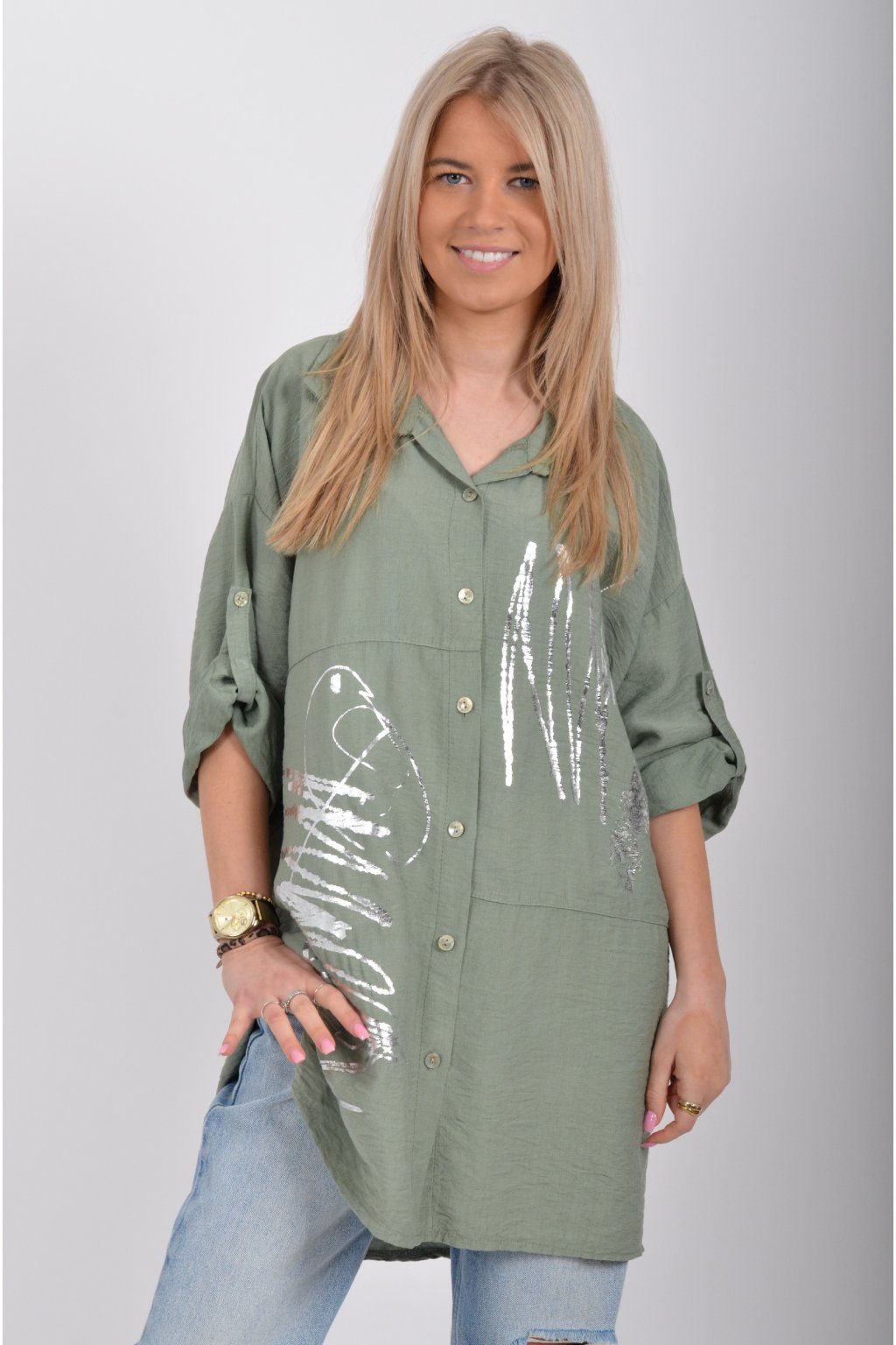 Košile s tříčtvrtečním rukávem a stříbrným potiskem vyrobená z příjemného odlehčeného materiálu. Rukáv, lze pomocí knoflíku jednoduše zkrátit. Zadní díl košile je delší než přední, čímž opticky prodlouží postavu.