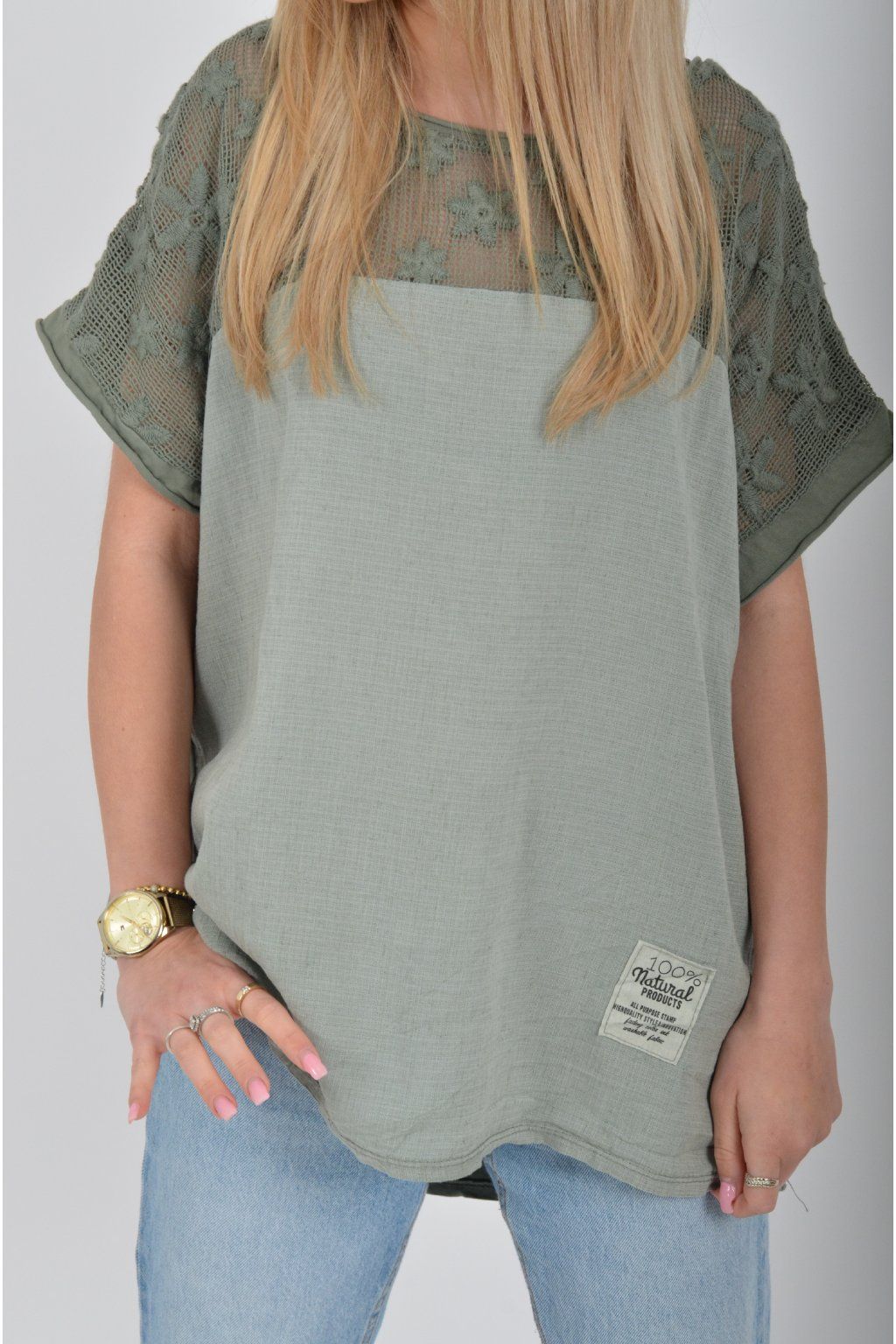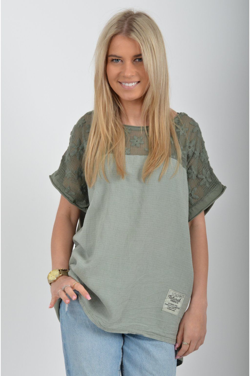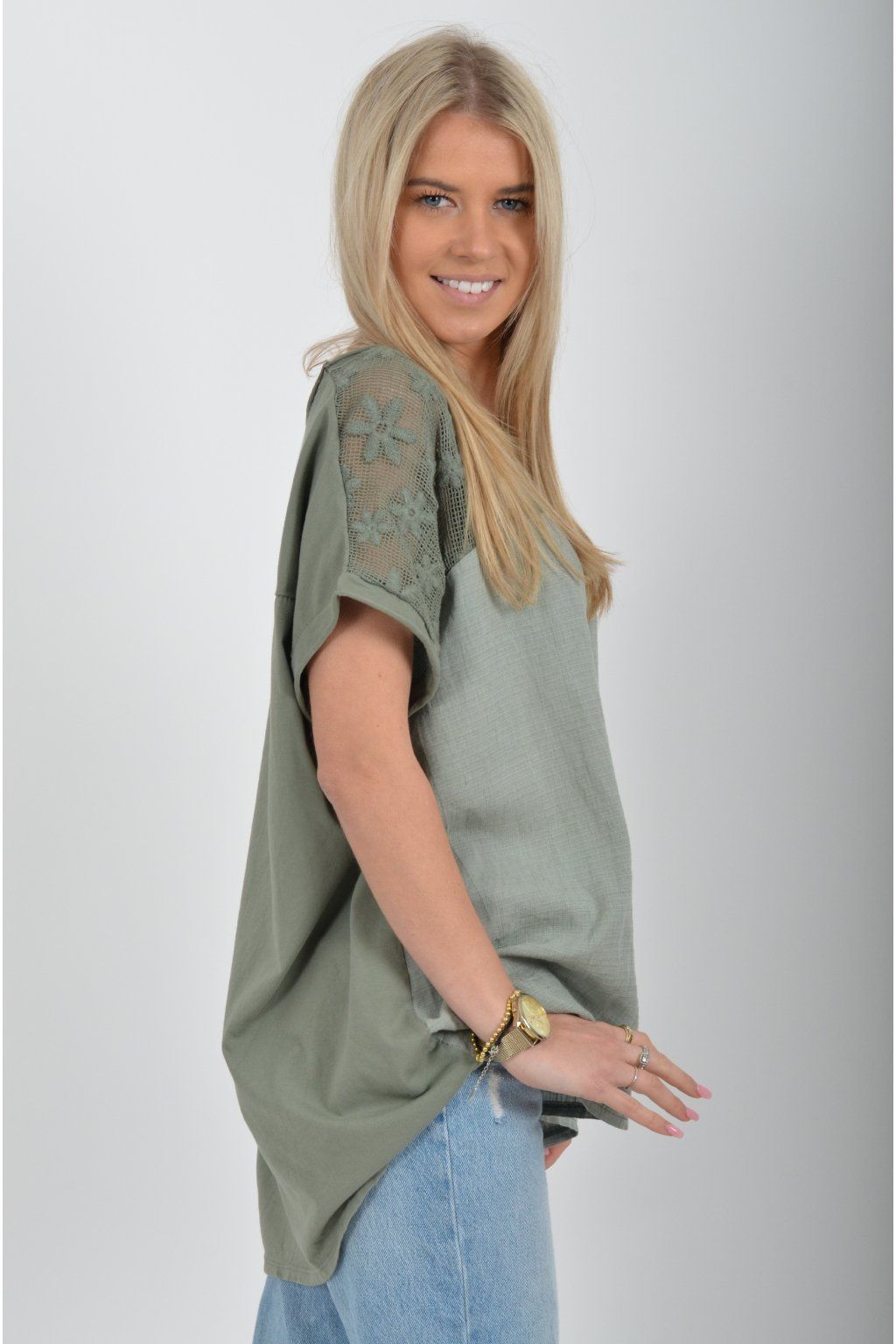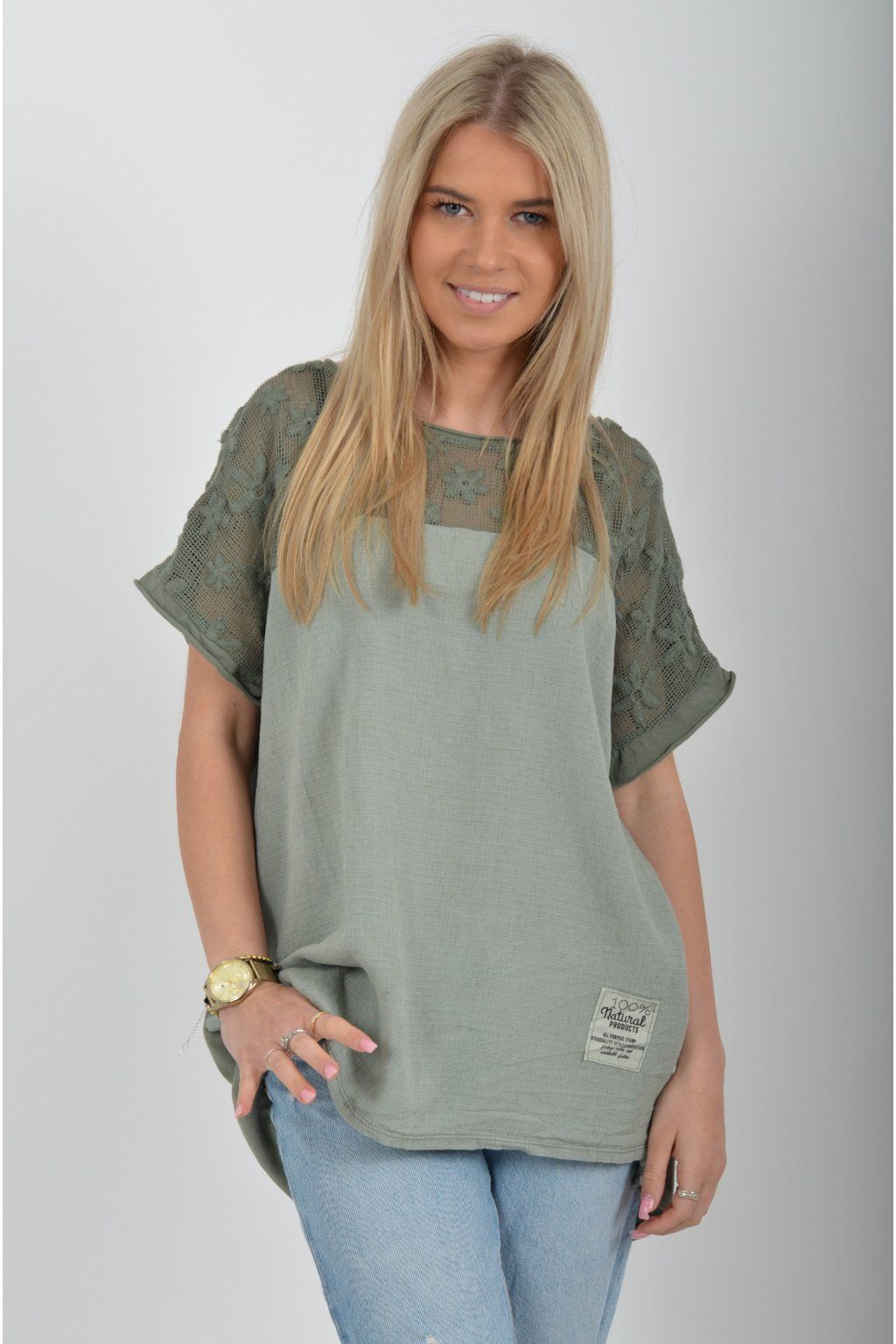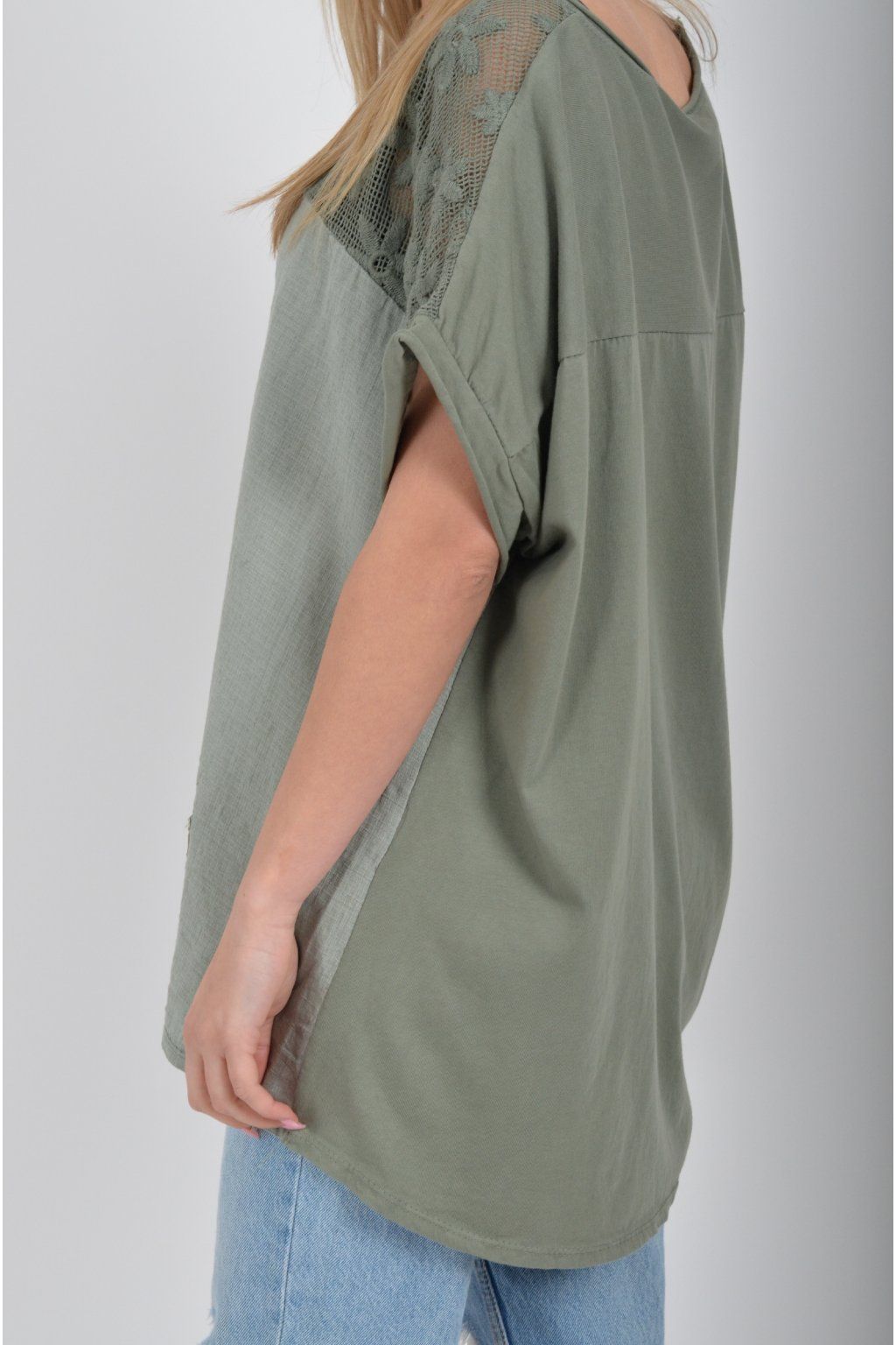 Jednobarevné tričko s krátkým rukávem a zdobené nádhernou kytičkovanou krajkou. Přední díl trička je vyrobený ze lnu, zadní díl je vyrobený z bavlny. Tato kombinace zajištuje pohodlí a lehkou pružnost trička jako celku.