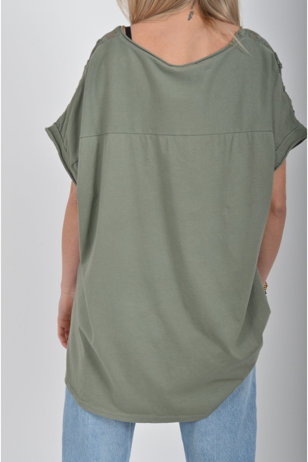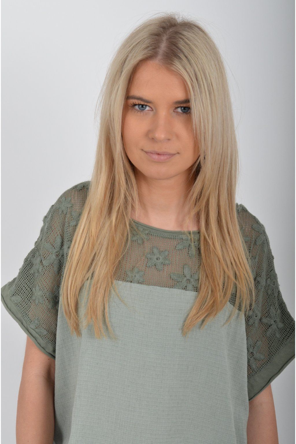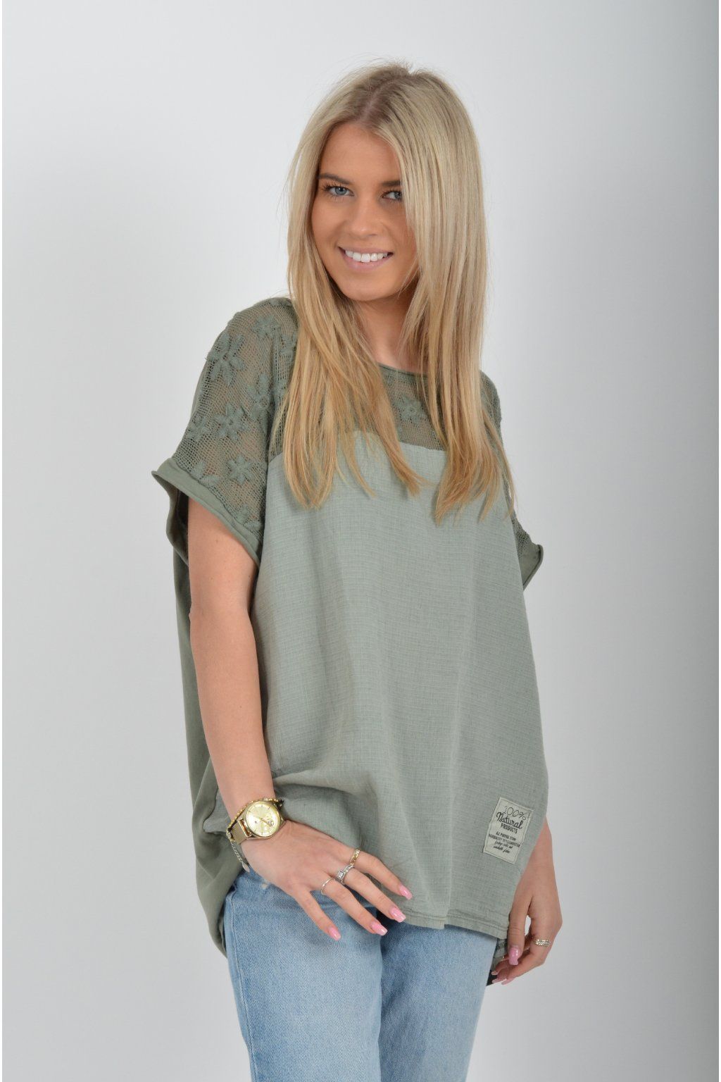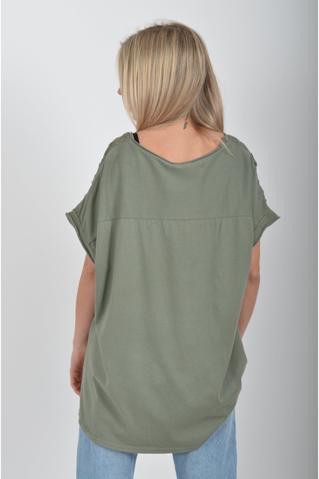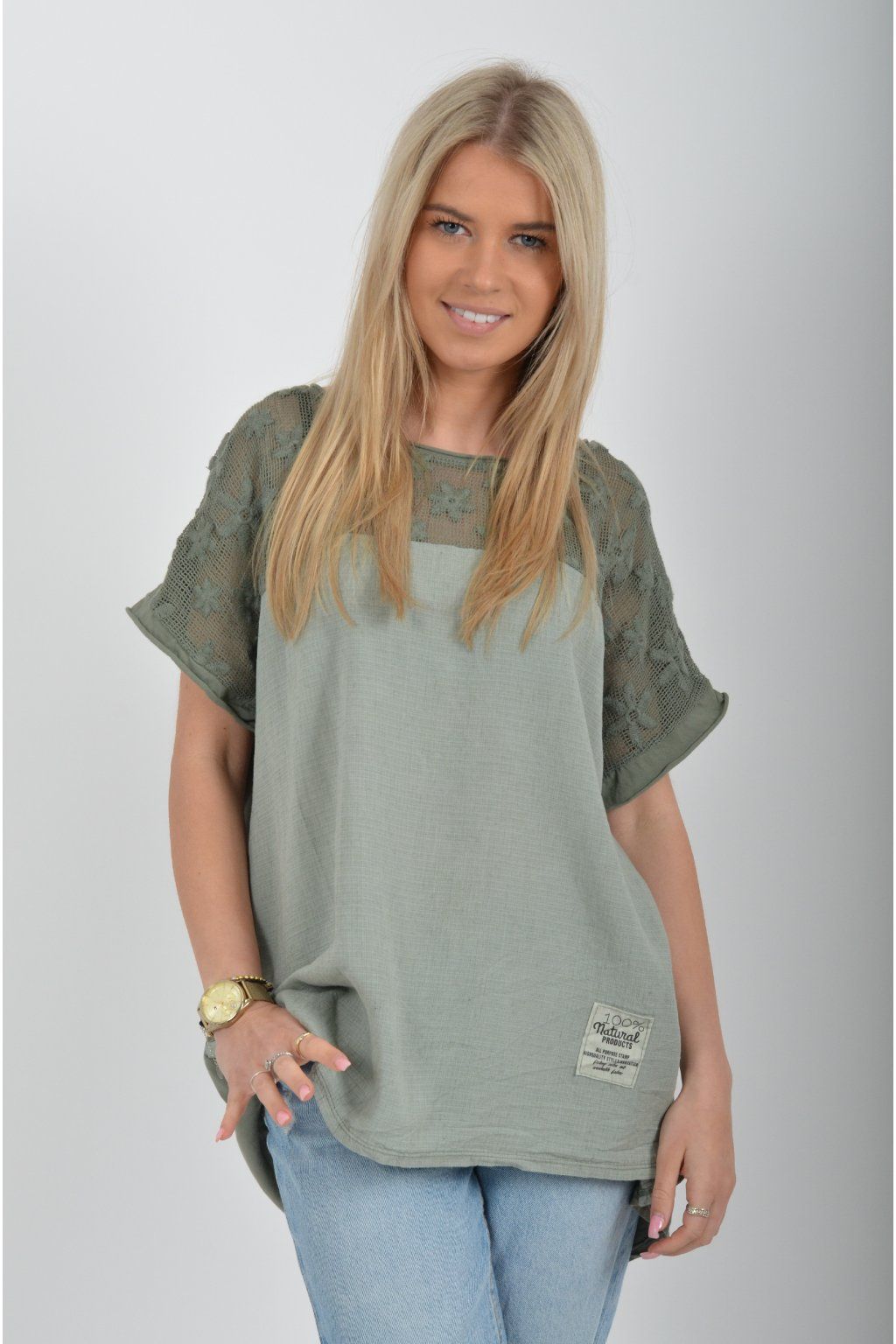 Jednobarevné tričko s krátkým rukávem a zdobené nádhernou kytičkovanou krajkou. Přední díl trička je vyrobený ze lnu, zadní díl je vyrobený z bavlny. Tato kombinace zajištuje pohodlí a lehkou pružnost trička jako celku.