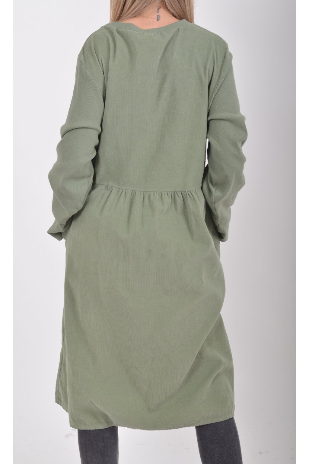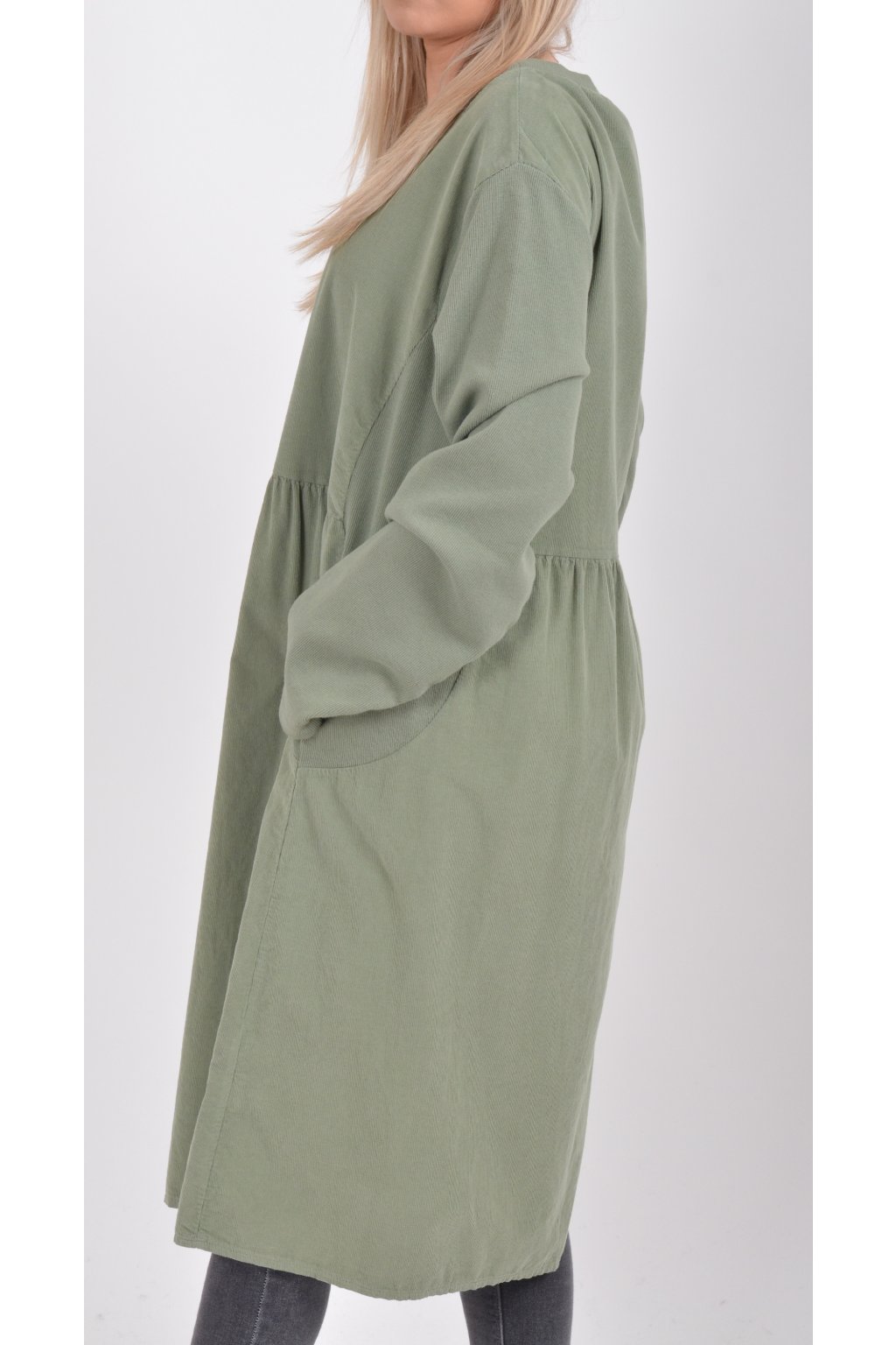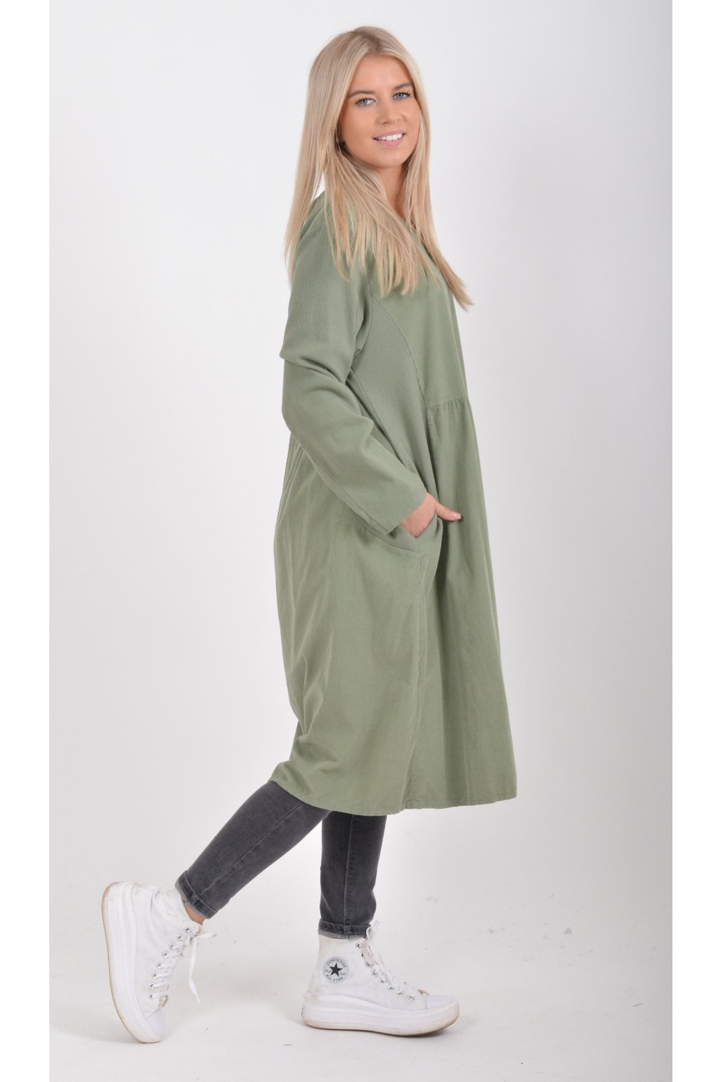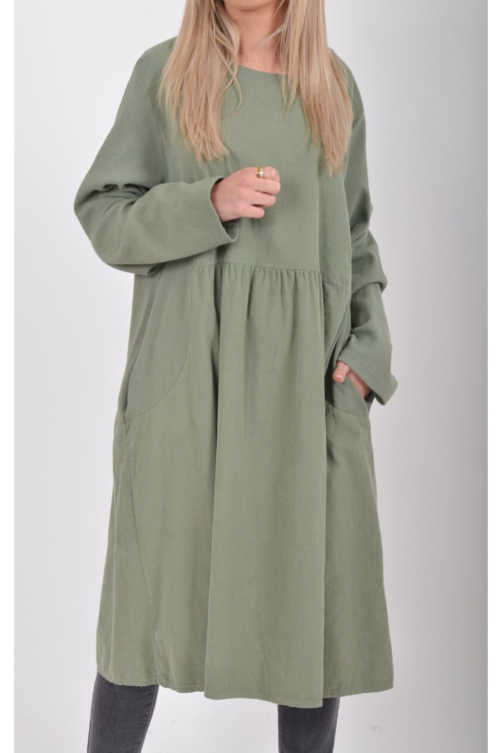 Jednobarevné manšestrové šaty s dlouhým rukávem a kapsami na bocích. Šaty jsou vyrobeny z velice příjemného a kvalitního materiálu. Jsou vhodné pro každodenní nošení a mají áčkový střih.