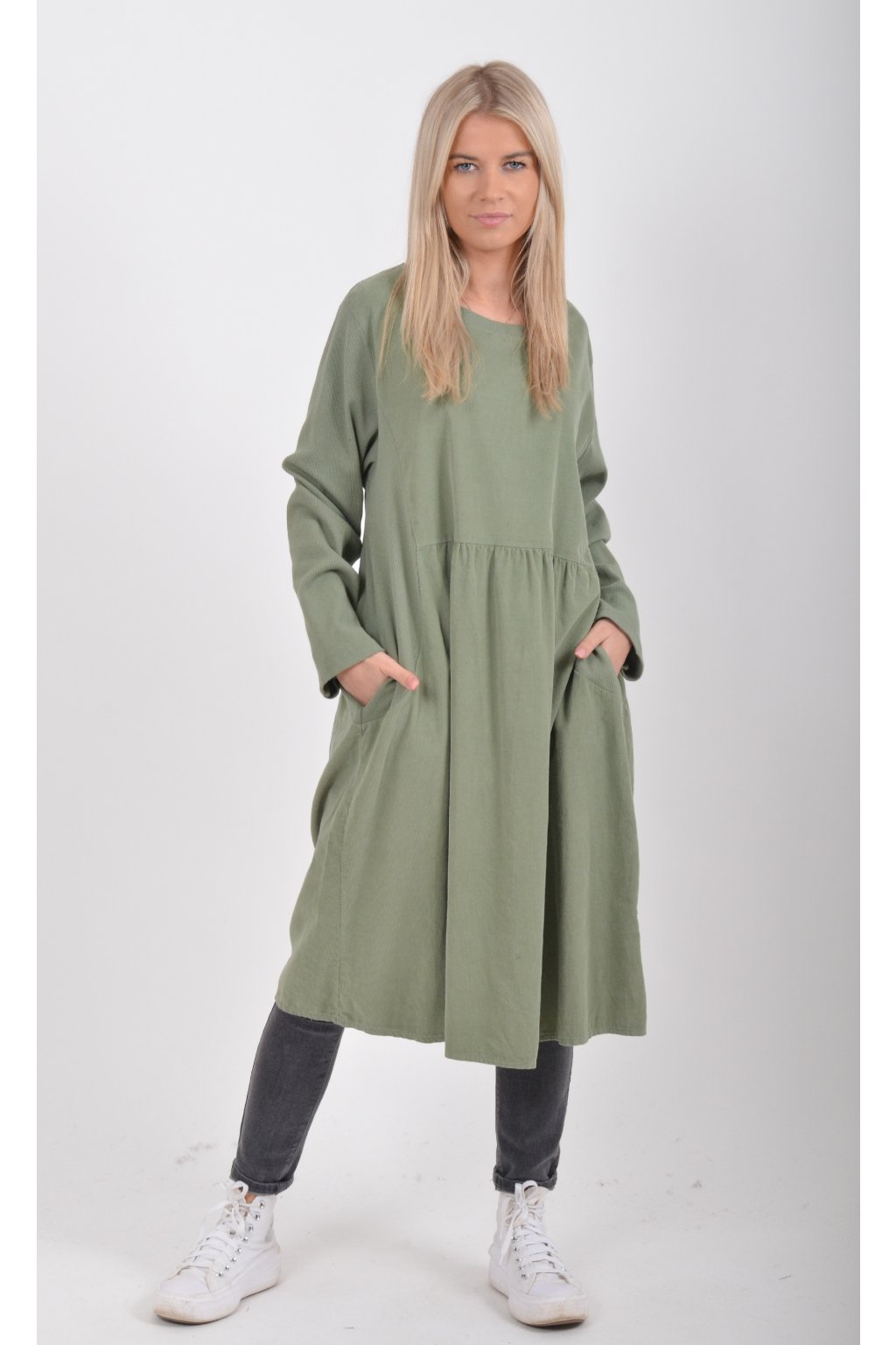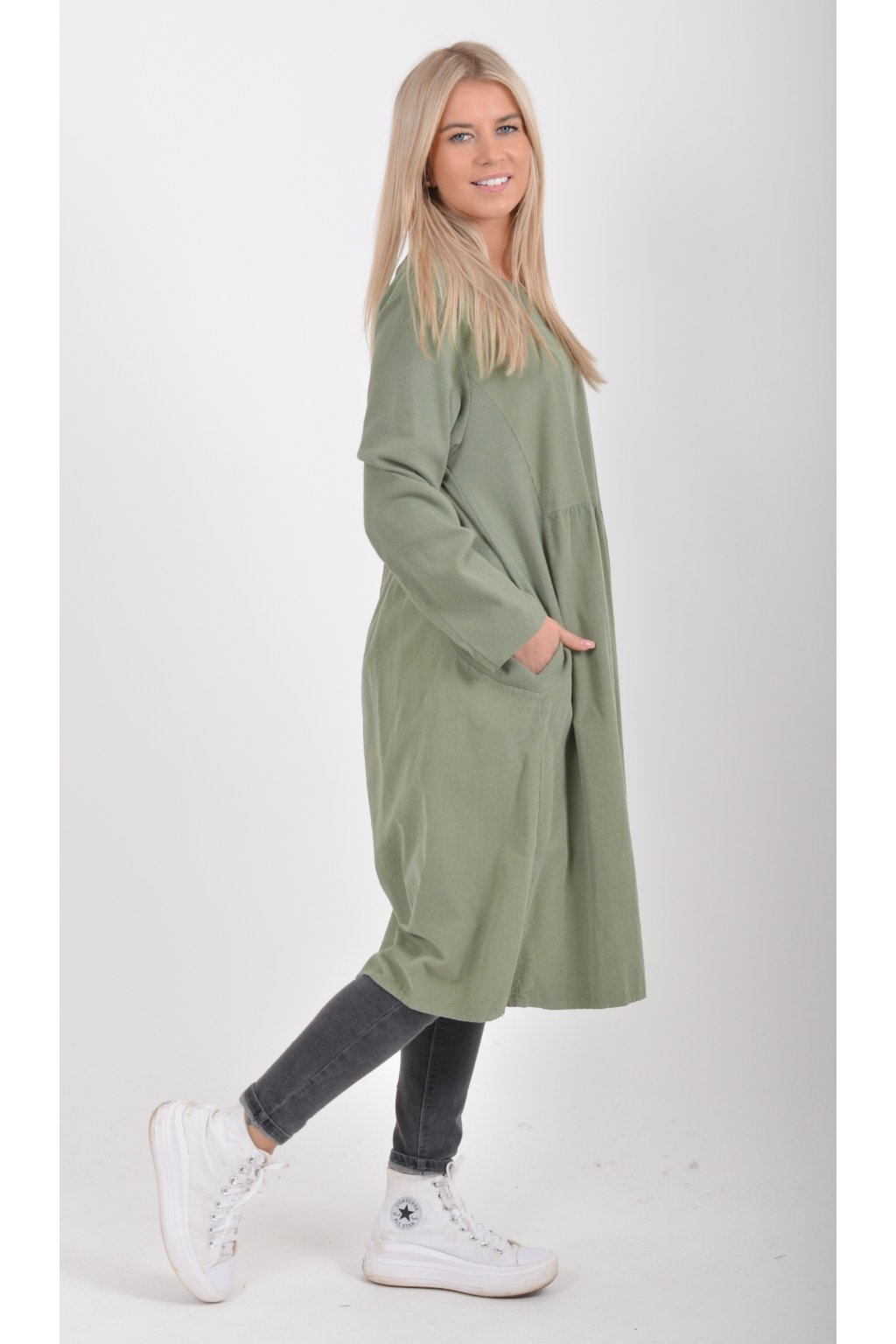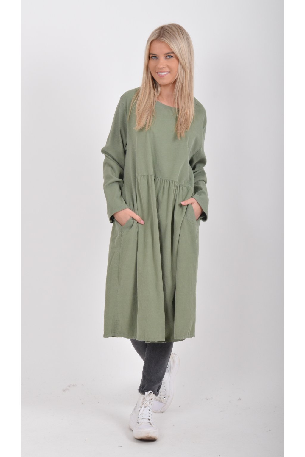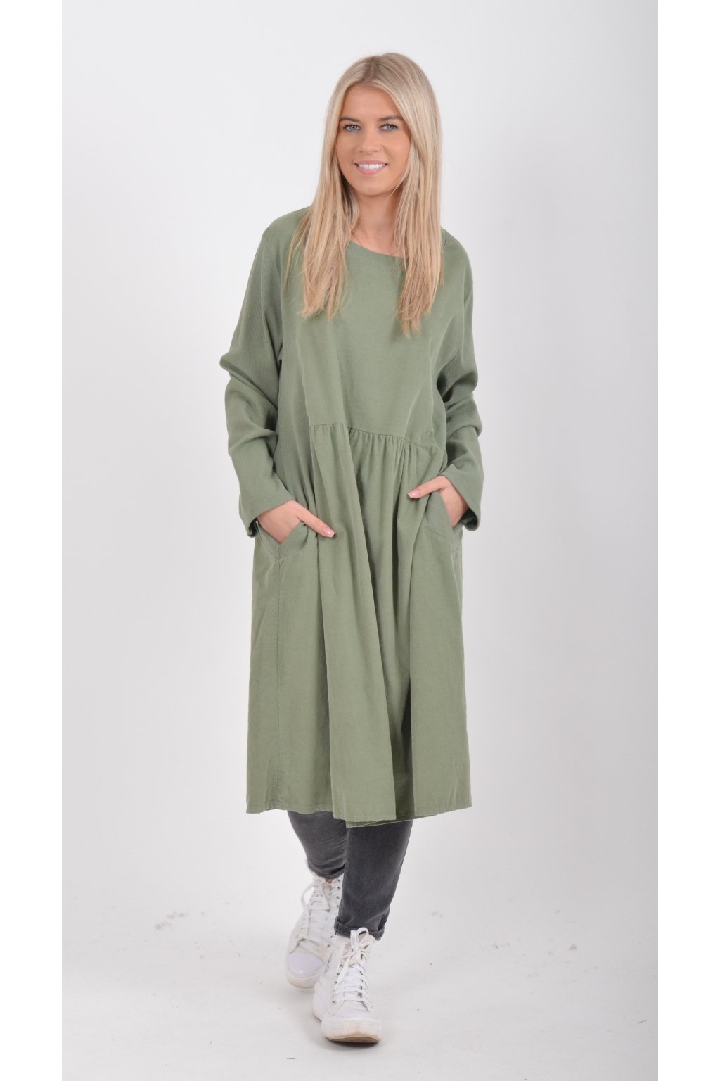 Jednobarevné manšestrové šaty s dlouhým rukávem a kapsami na bocích. Šaty jsou vyrobeny z velice příjemného a kvalitního materiálu. Jsou vhodné pro každodenní nošení a mají áčkový střih.