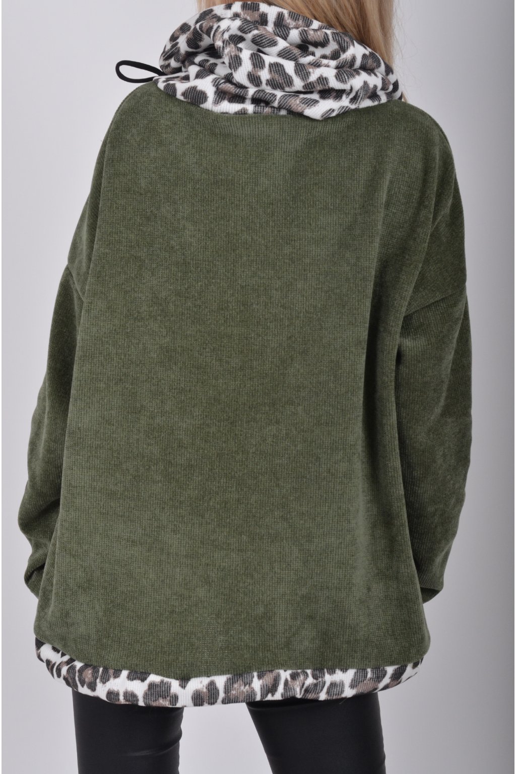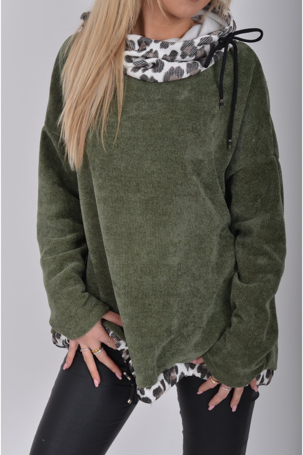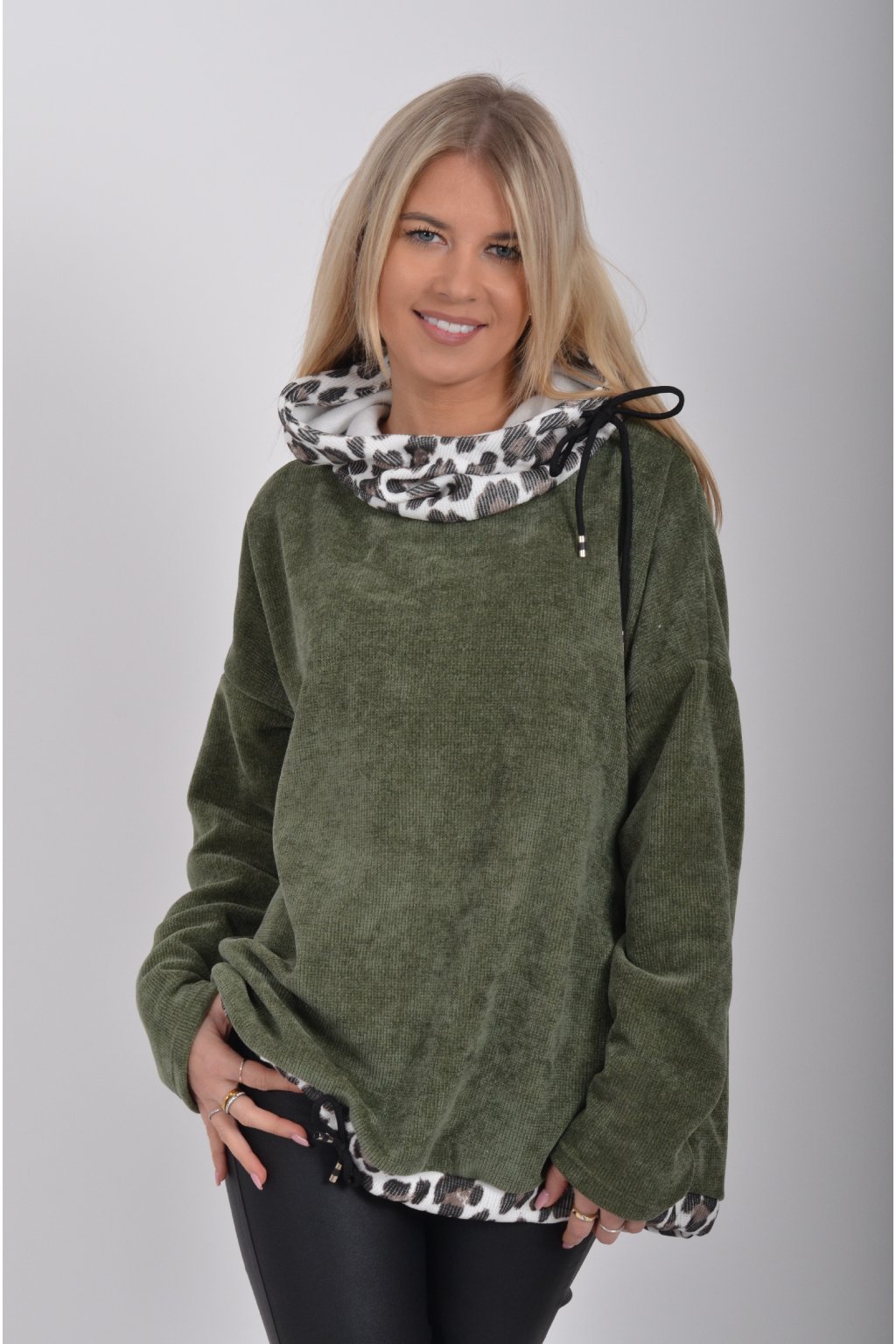 Stylová mikina s ozdobnými lemem a kapucí. Je vyrobena z velice příjemného materiálu. Ve spodní části má zapracovanou tkaničku, která slouží k libovolnému stažení. Hodí se jak k džínům, tak i k legínám. Heboučký materiál zaručí příjemně strávený den.