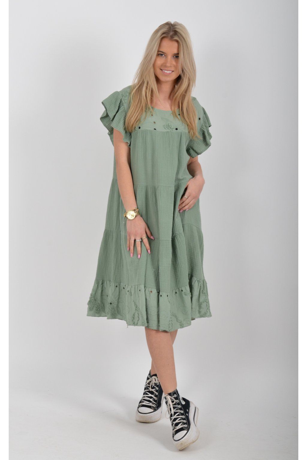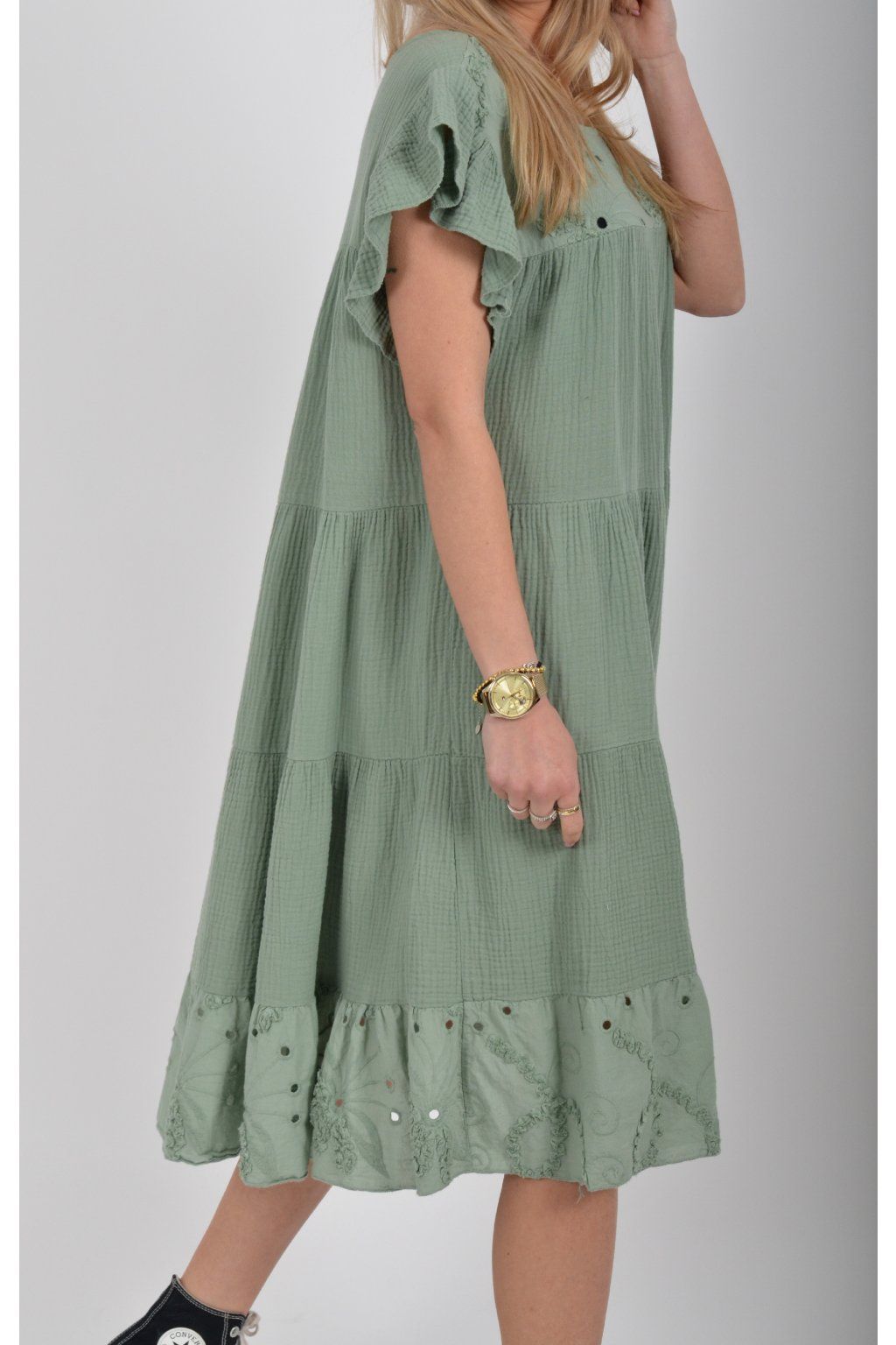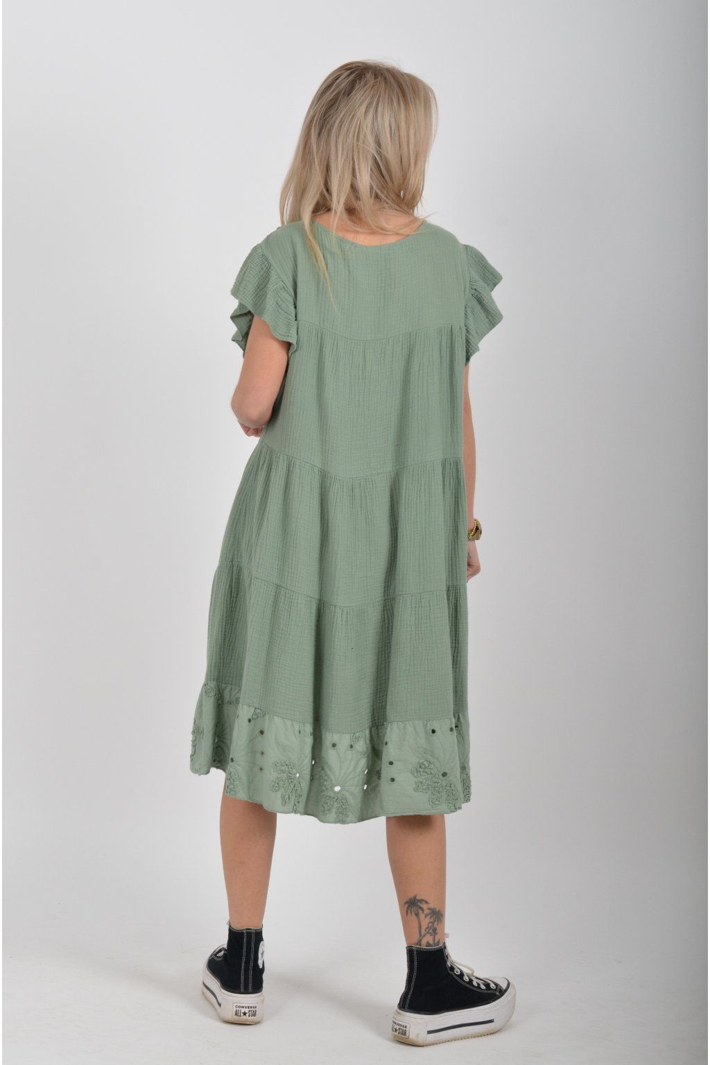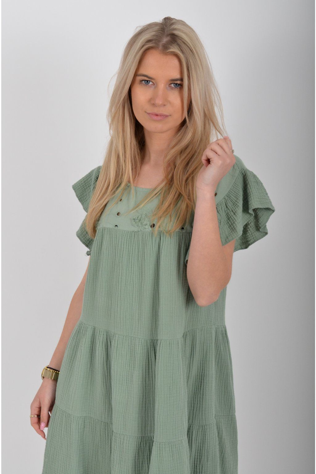 Zajímavé šaty vyrobené z velice příjemného mušelínu zdobené krajkou. Šaty mají áčkový střih a jsou bez kapes. Materiál je lehce pružný a velice příjemný.
