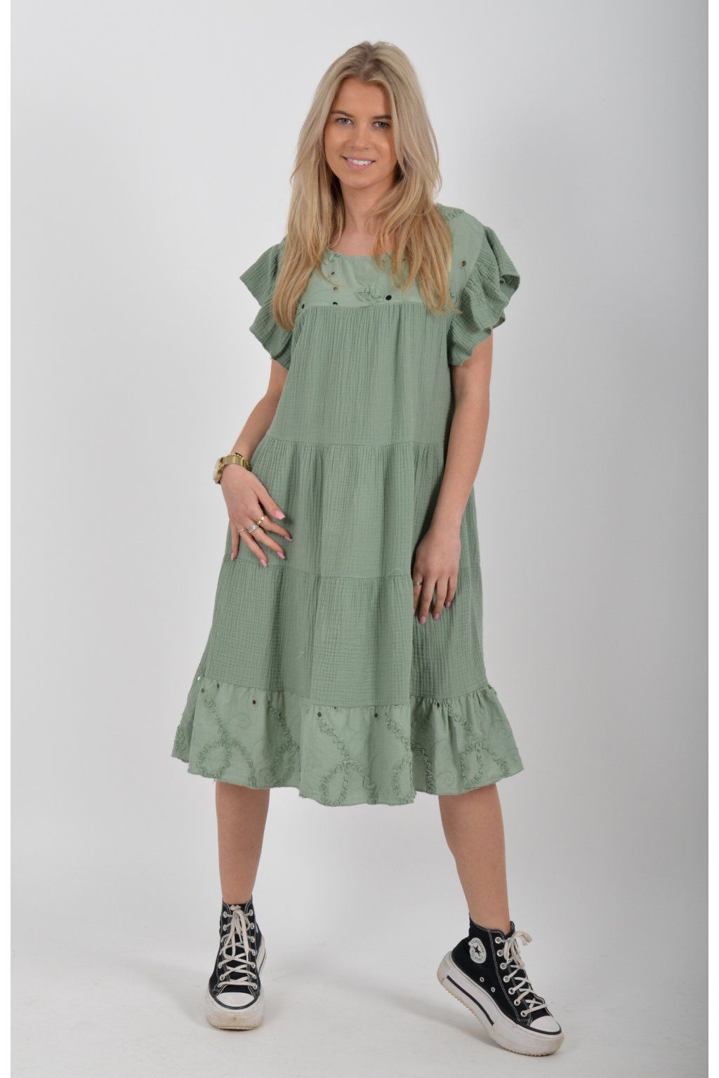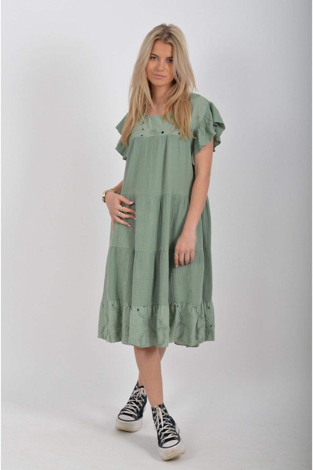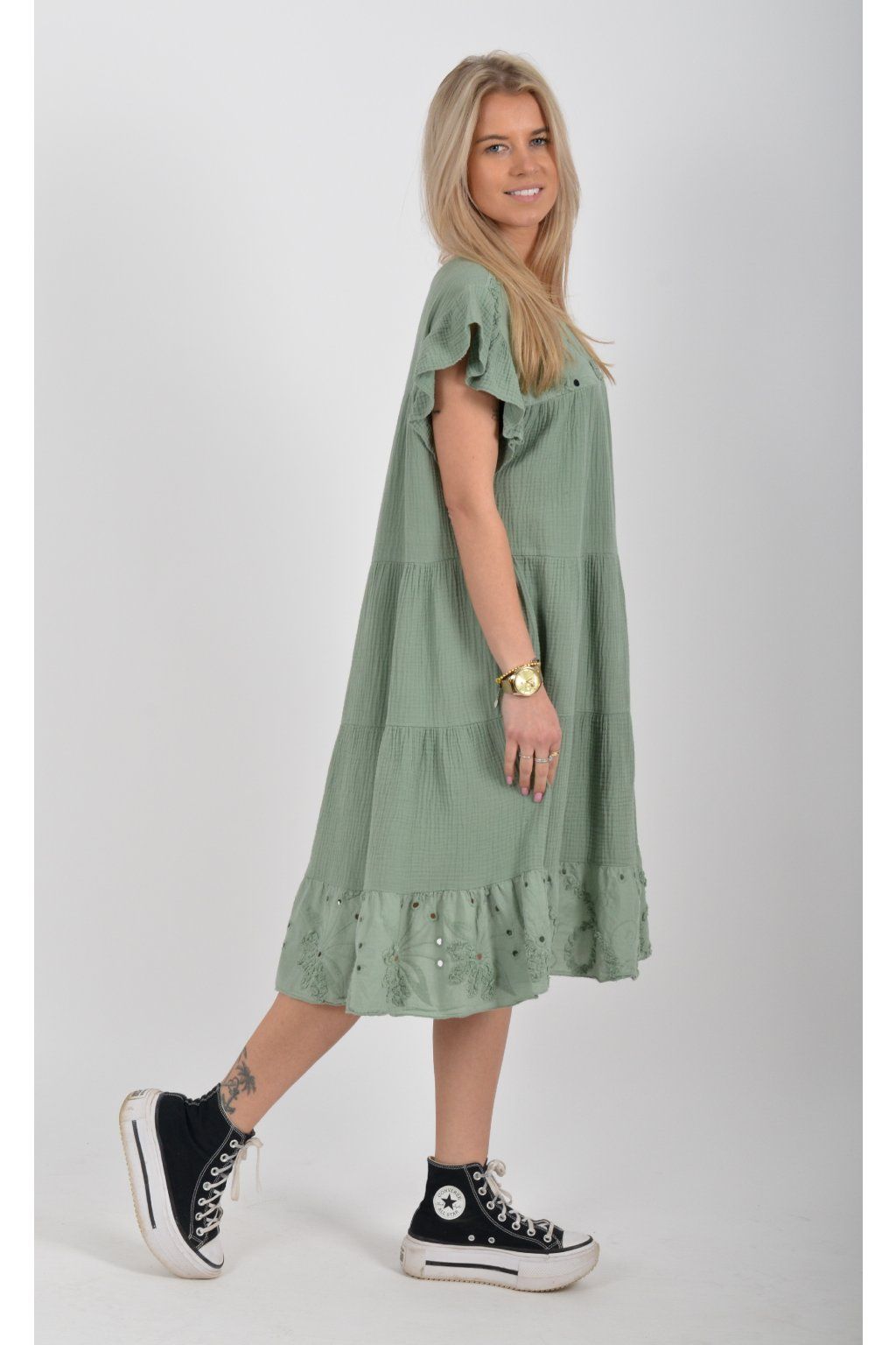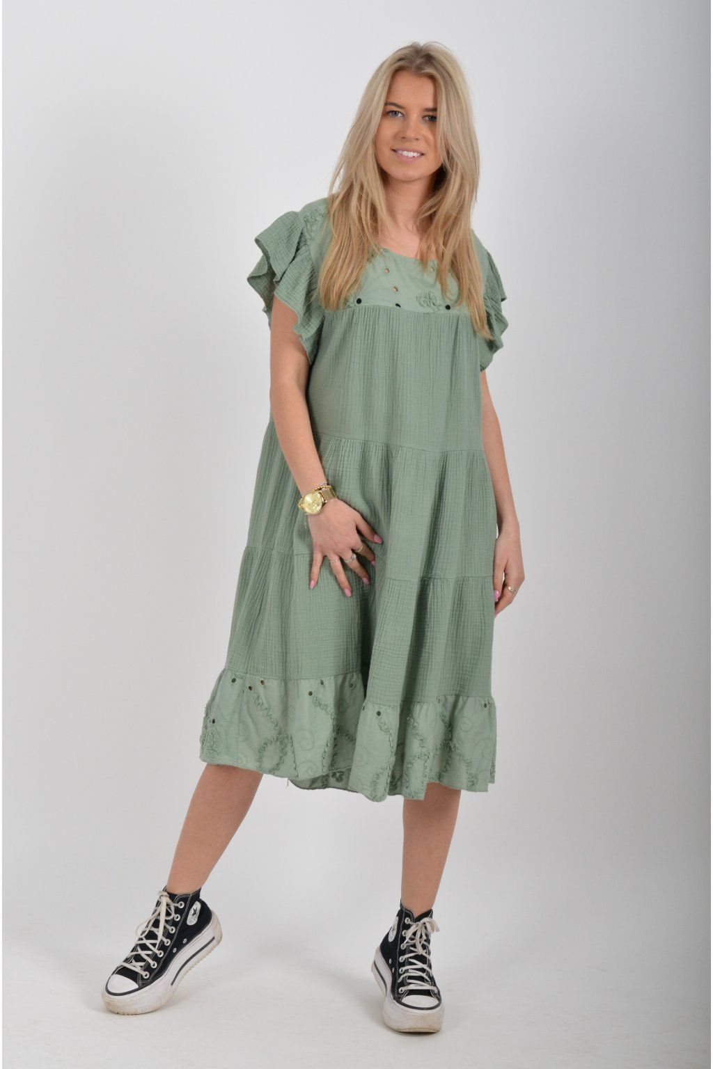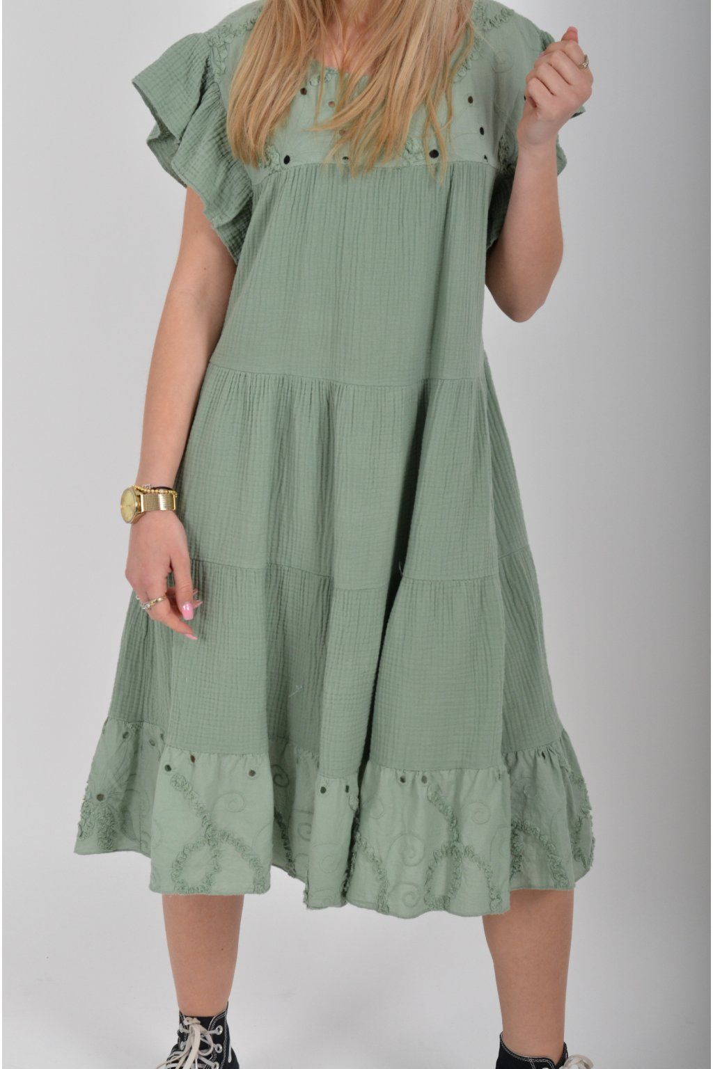 Zajímavé šaty vyrobené z velice příjemného mušelínu zdobené krajkou. Šaty mají áčkový střih a jsou bez kapes. Materiál je lehce pružný a velice příjemný.