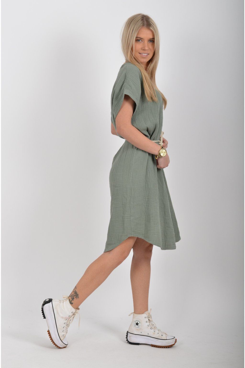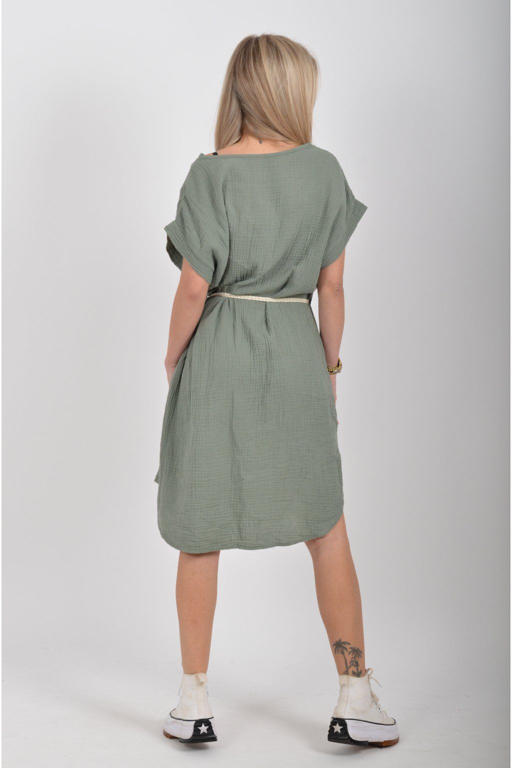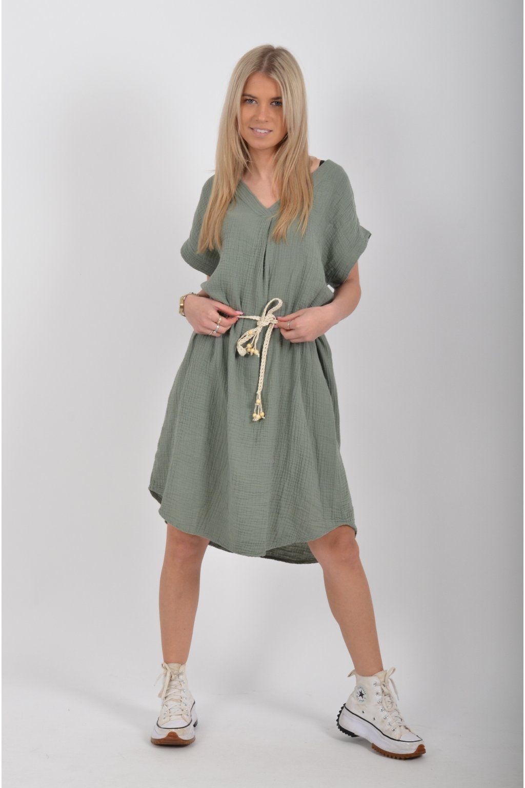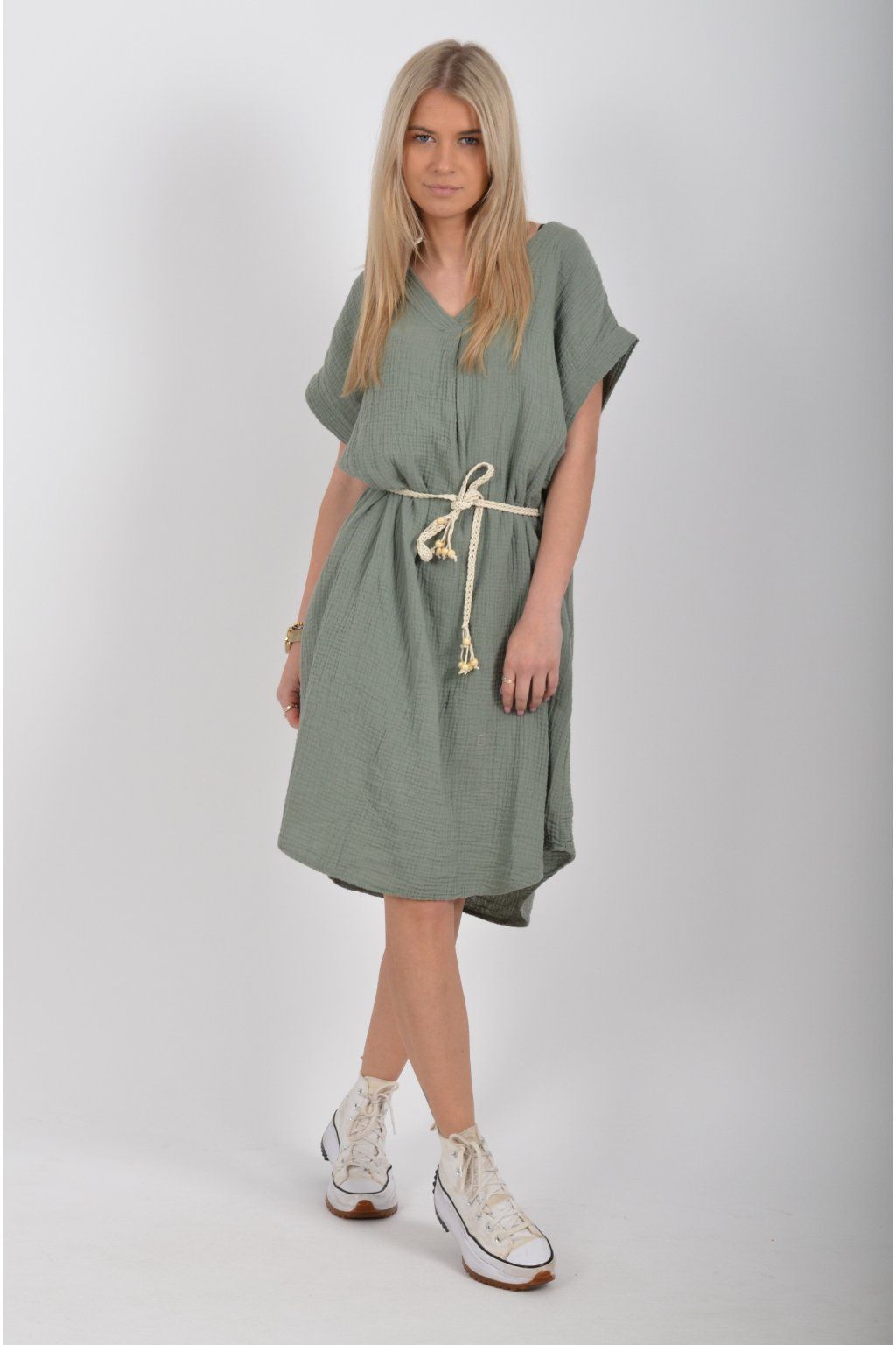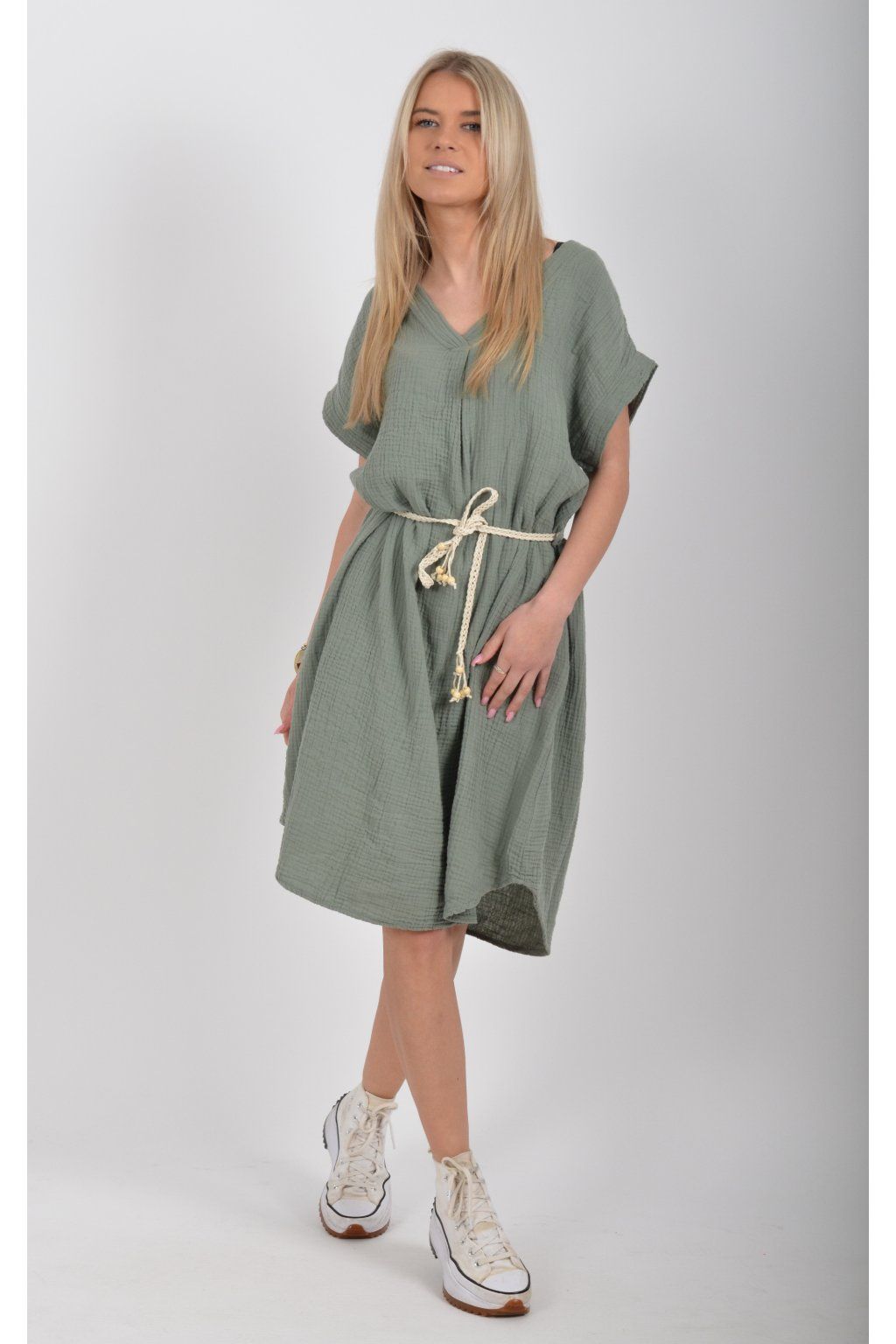 Šaty vyrobené z velice příjemného mušelínu. Šaty lehounce áčkový střih a je k nim pásek pro libovolné stažení.