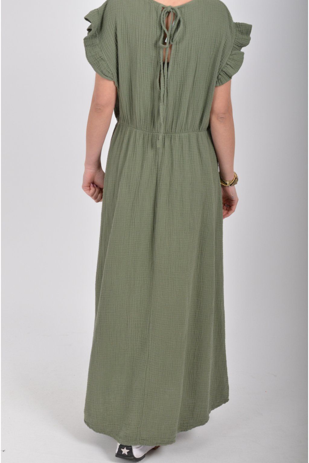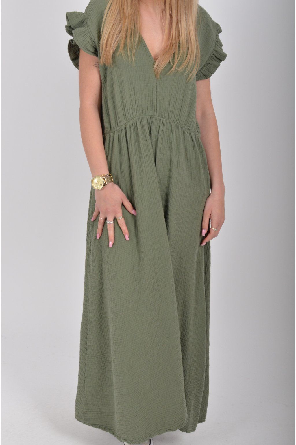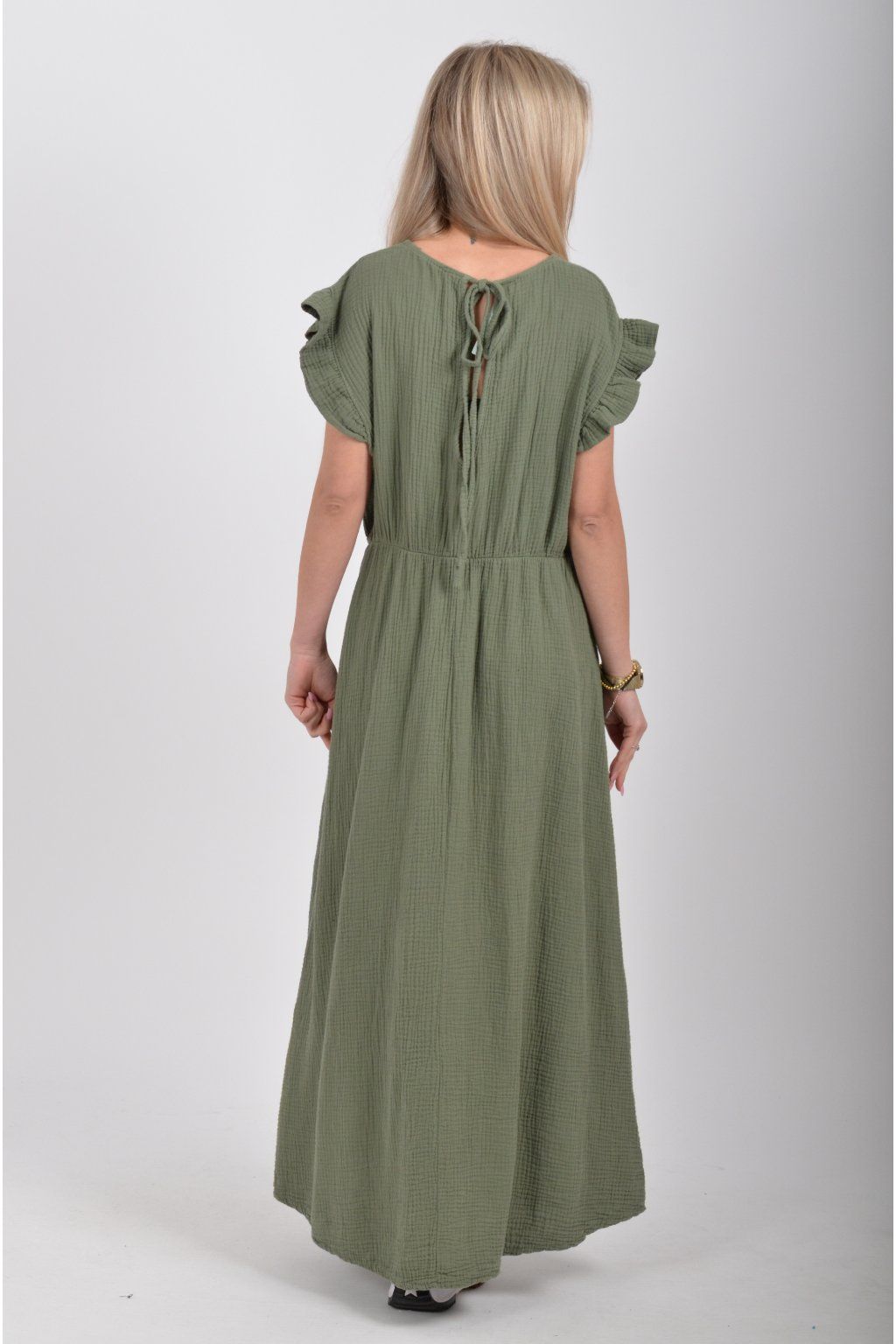 Maxi šaty vyrobené z velice příjemného mušelínu. Šaty mají áčkový střih, jsou střižené pod prsy, kde je také zapracovaná guma. V zadní části u krku mají vázání na tkaničku. Šaty krátký rukáv s volánkem.
