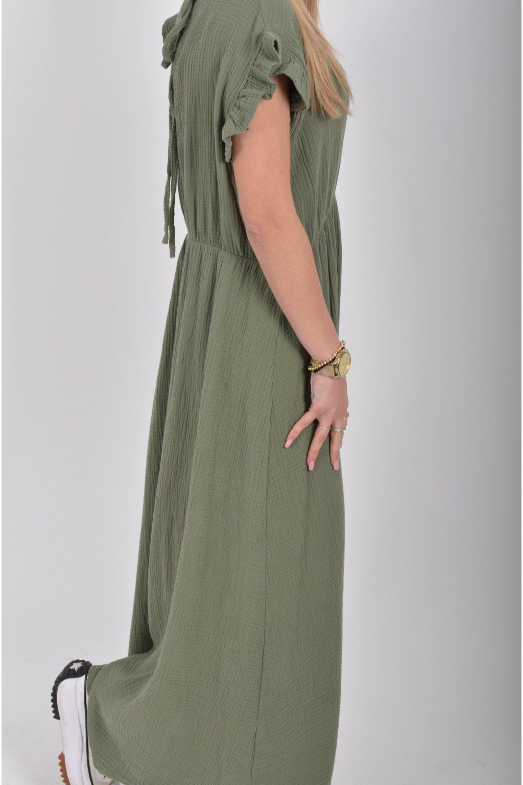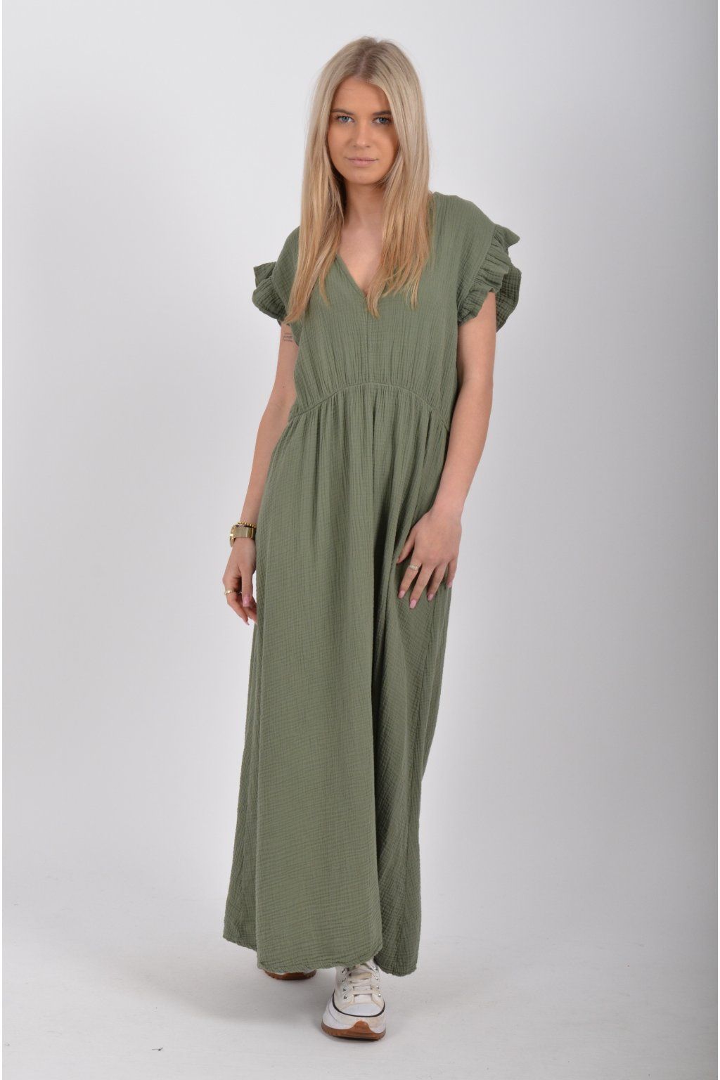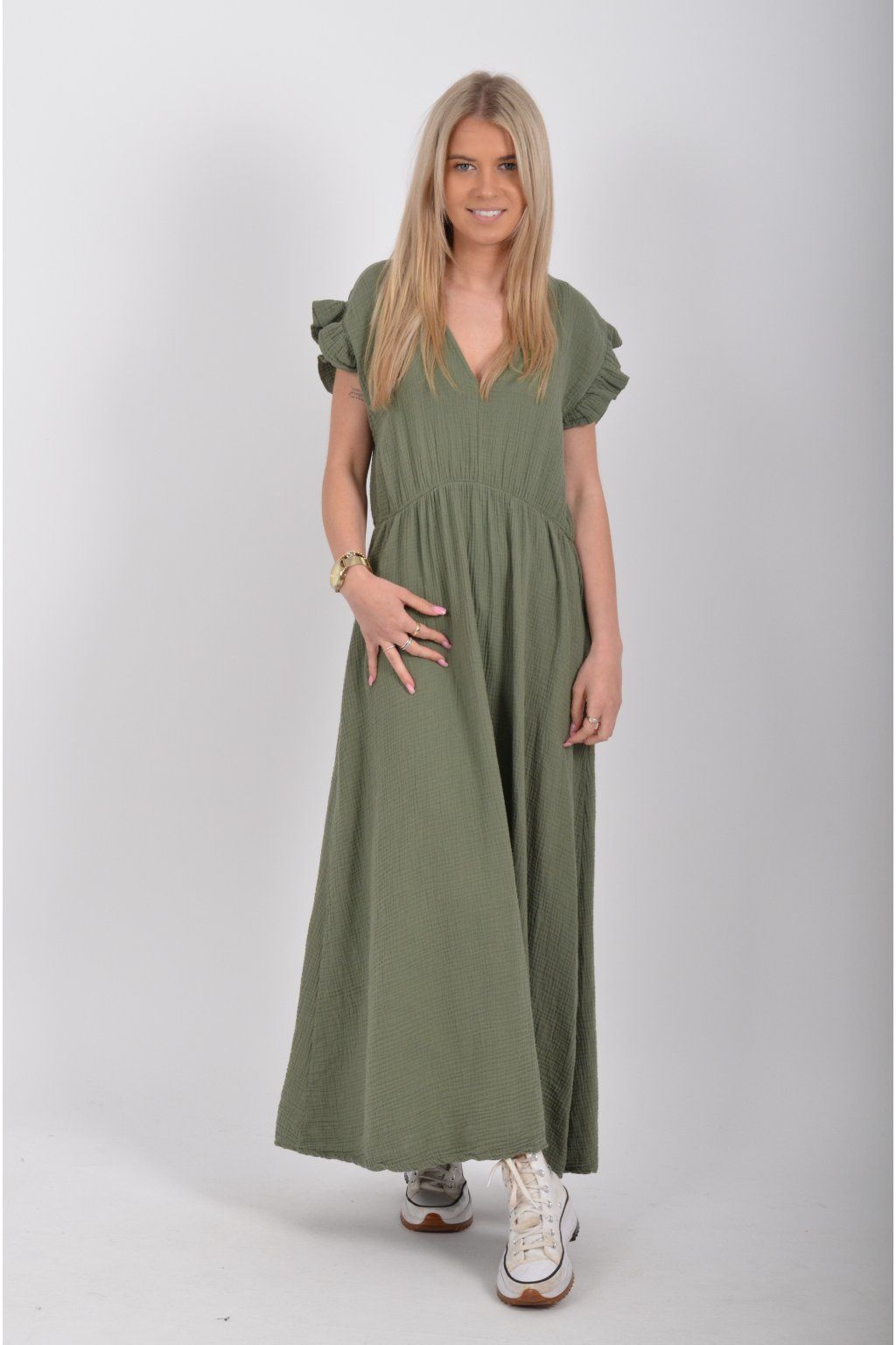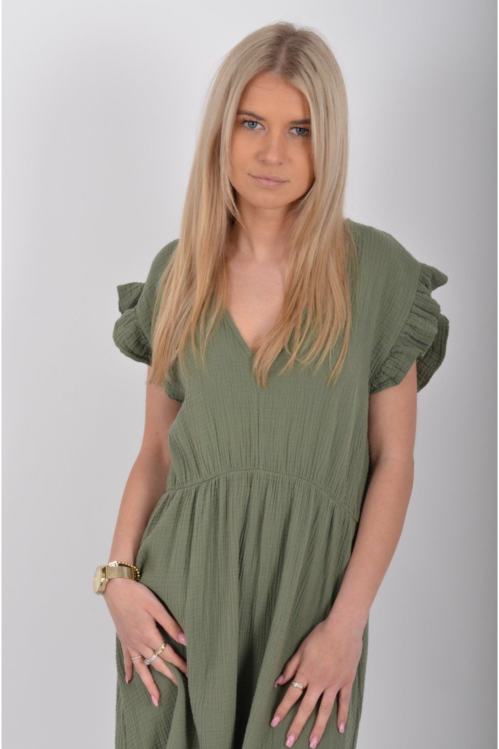 Maxi šaty vyrobené z velice příjemného mušelínu. Šaty mají áčkový střih, jsou střižené pod prsy, kde je také zapracovaná guma. V zadní části u krku mají vázání na tkaničku. Šaty krátký rukáv s volánkem.