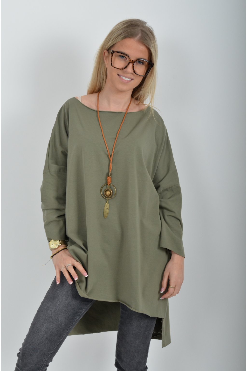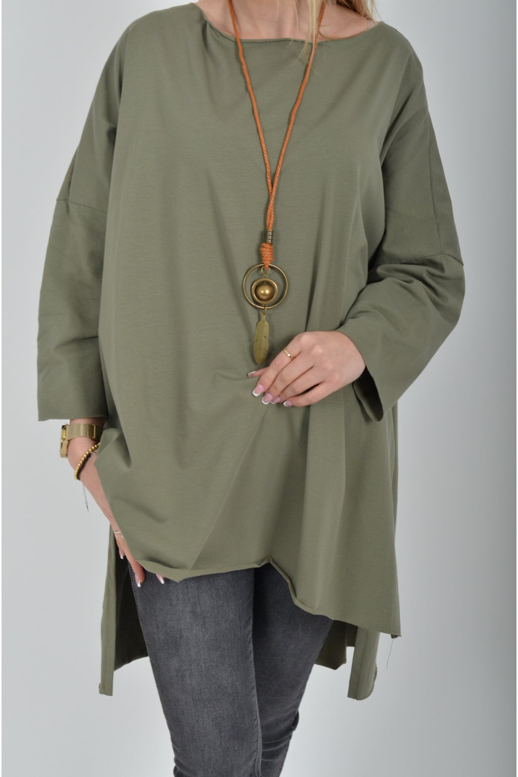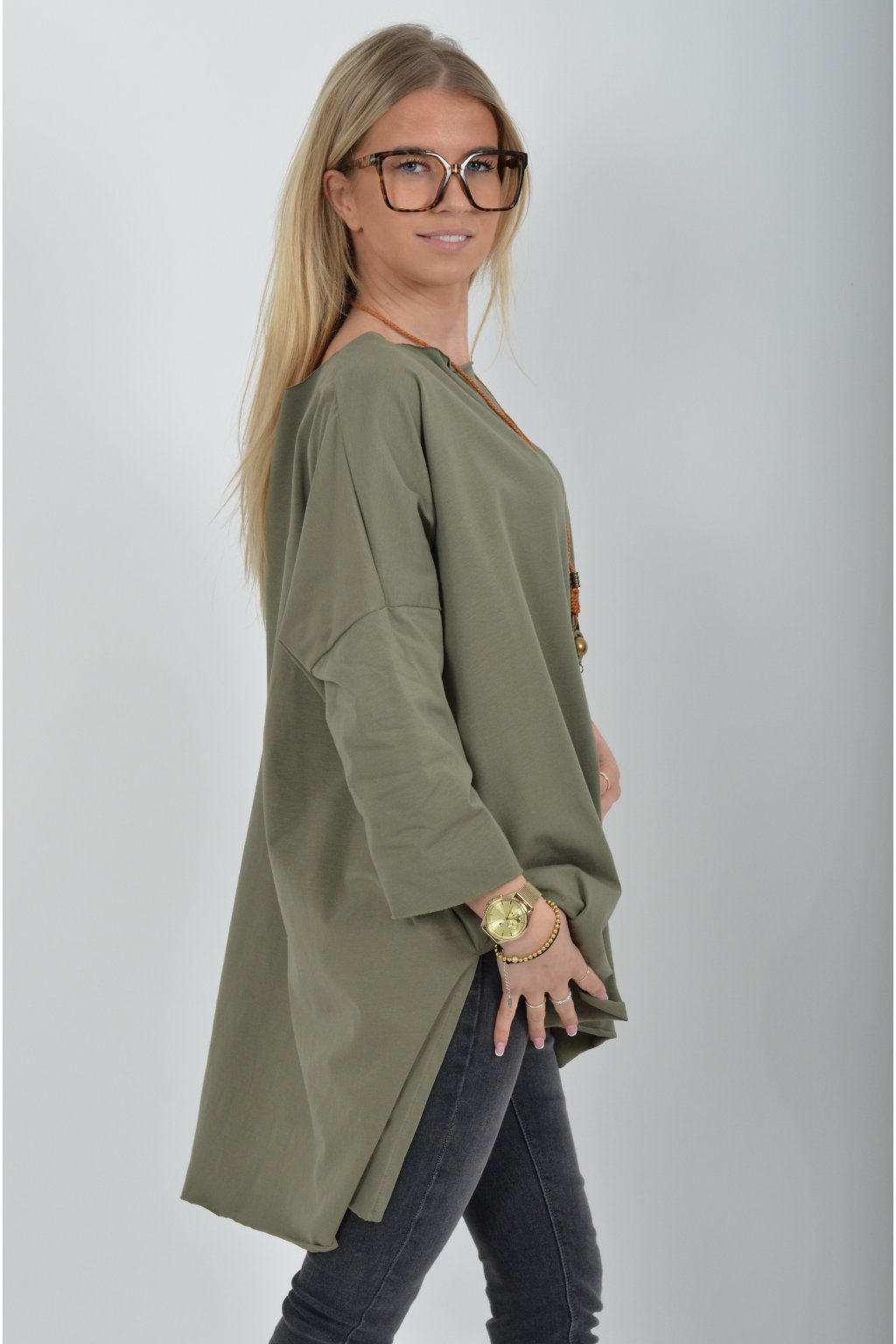 Jednobarevné oversize tričko s 3/4rukávem vyrobené z velice lehké, měkké a příjemné bavlny. Zadní část trička je delší než přední. K tričku je náhrdelník jako dárek.