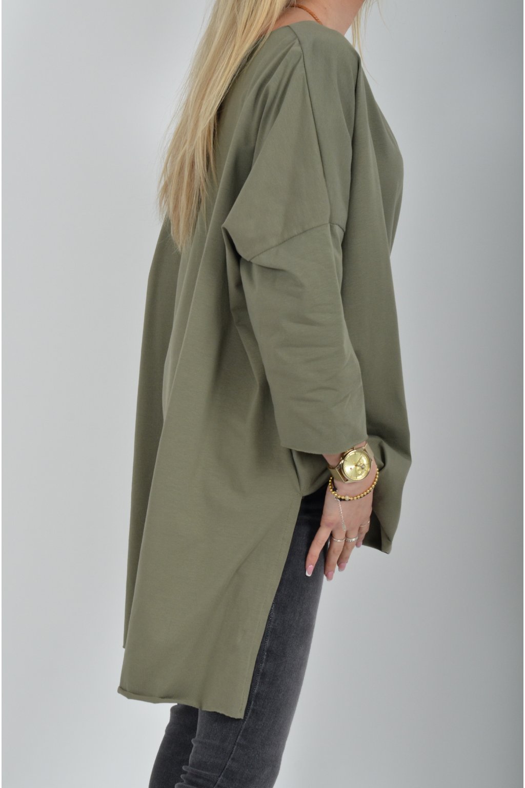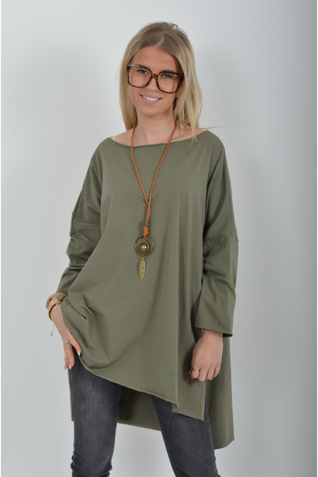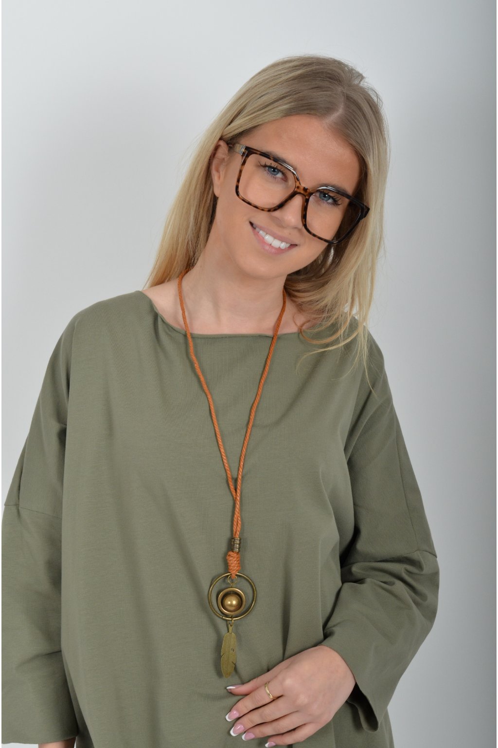 Jednobarevné oversize tričko s 3/4rukávem vyrobené z velice lehké, měkké a příjemné bavlny. Zadní část trička je delší než přední. K tričku je náhrdelník jako dárek.