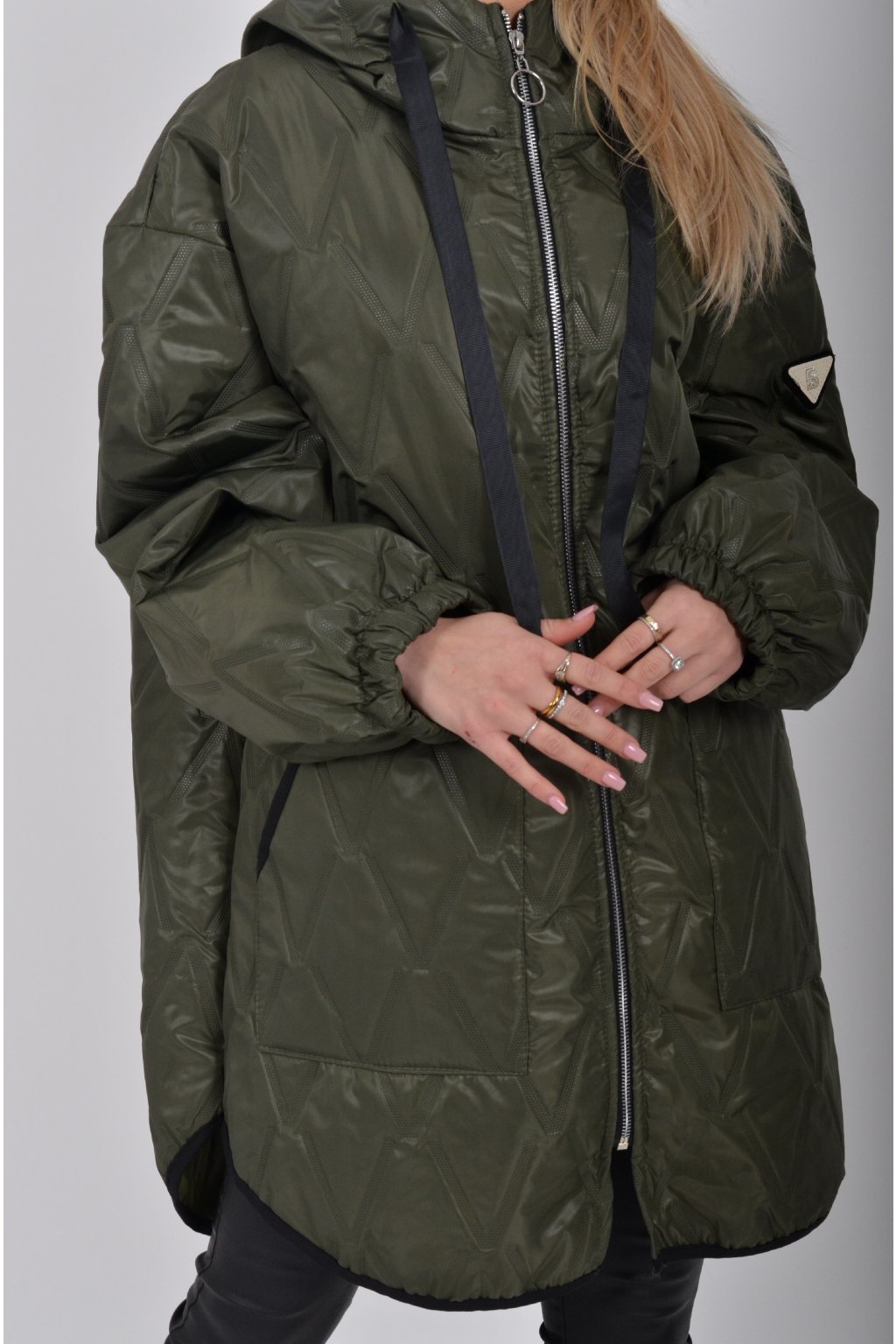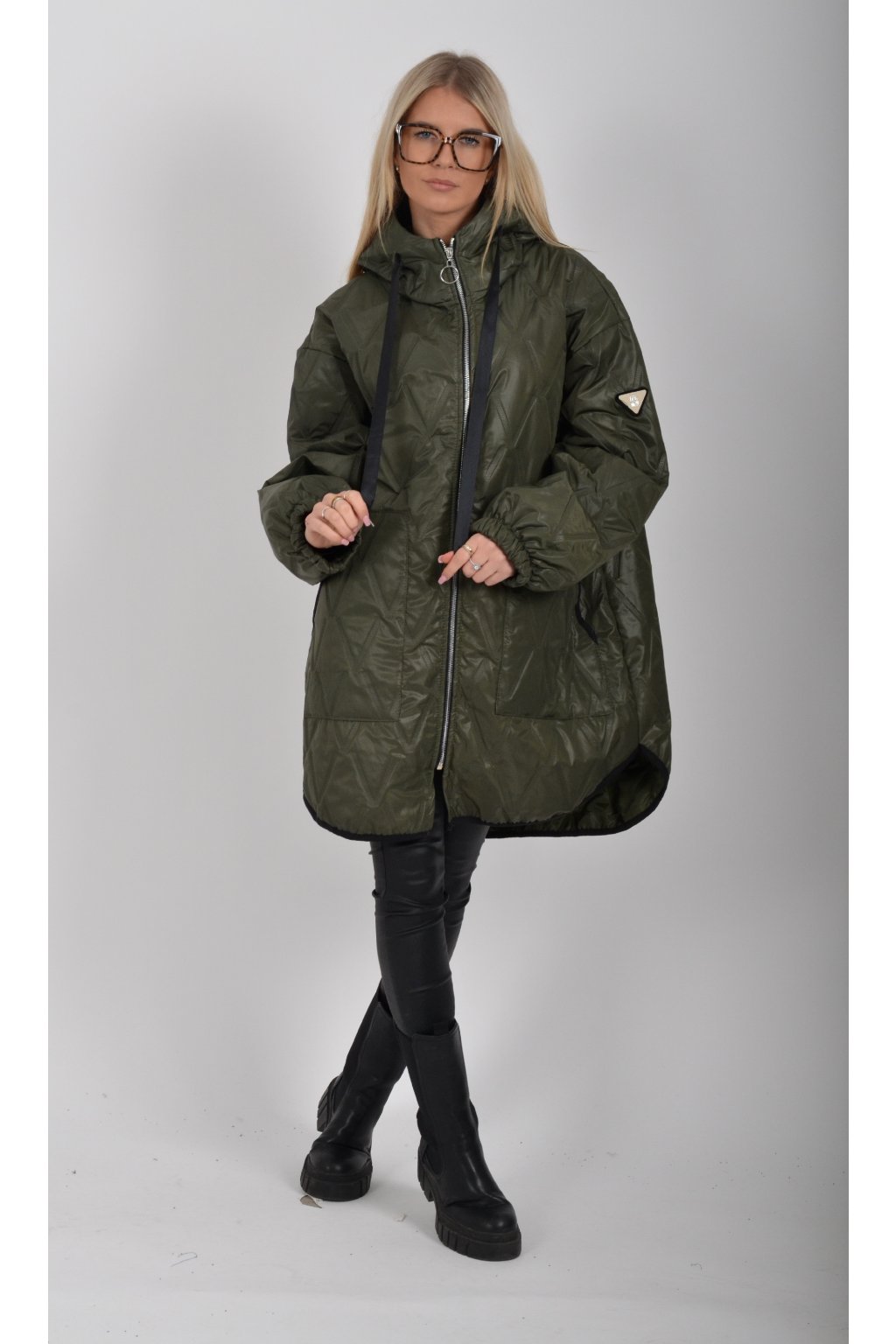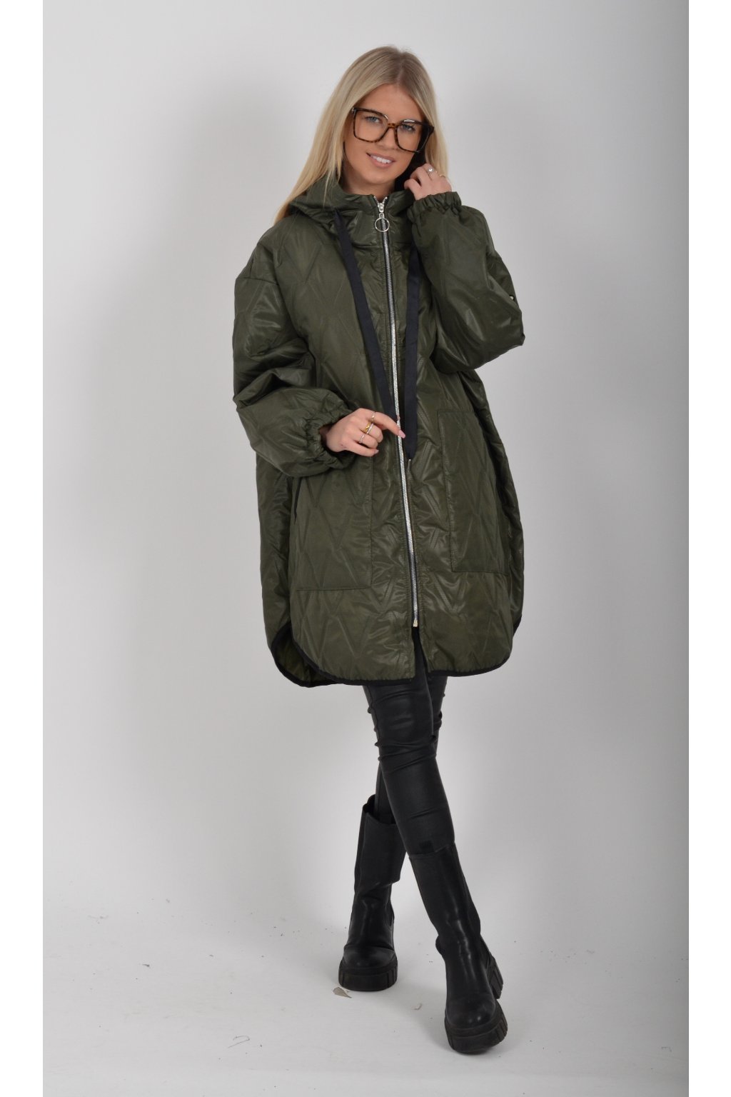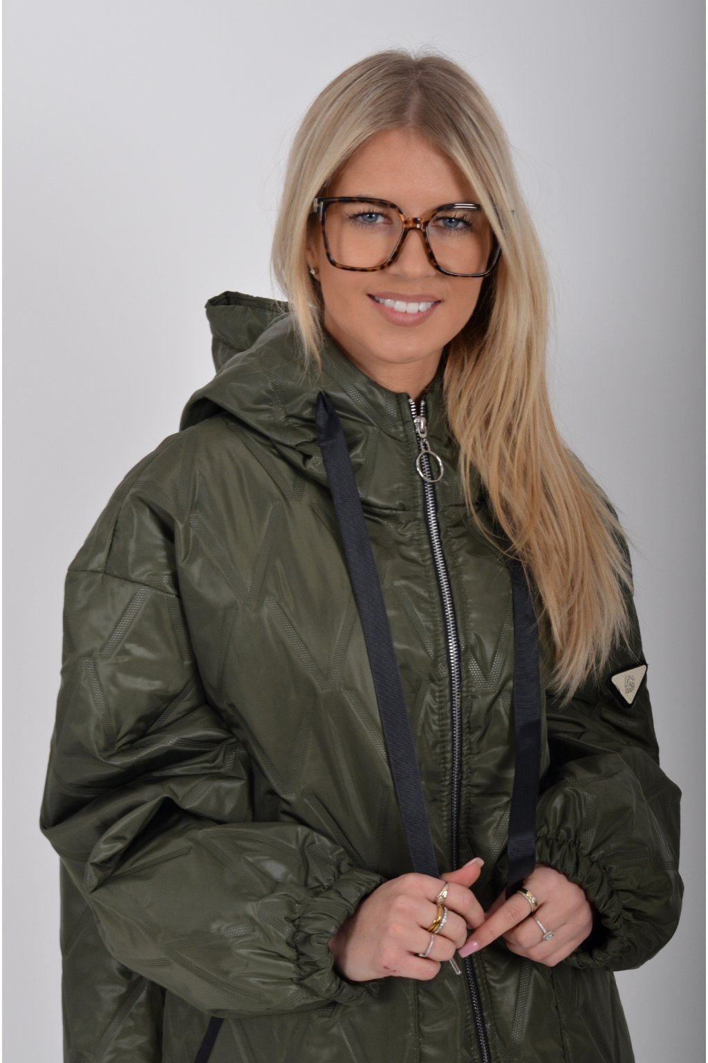 Přechodová oversize bunda s kapuci a kapsami v přední části. Je volnějšího stylu, u krku má šňurky na stažení. Velice lehký a měkký materiál.