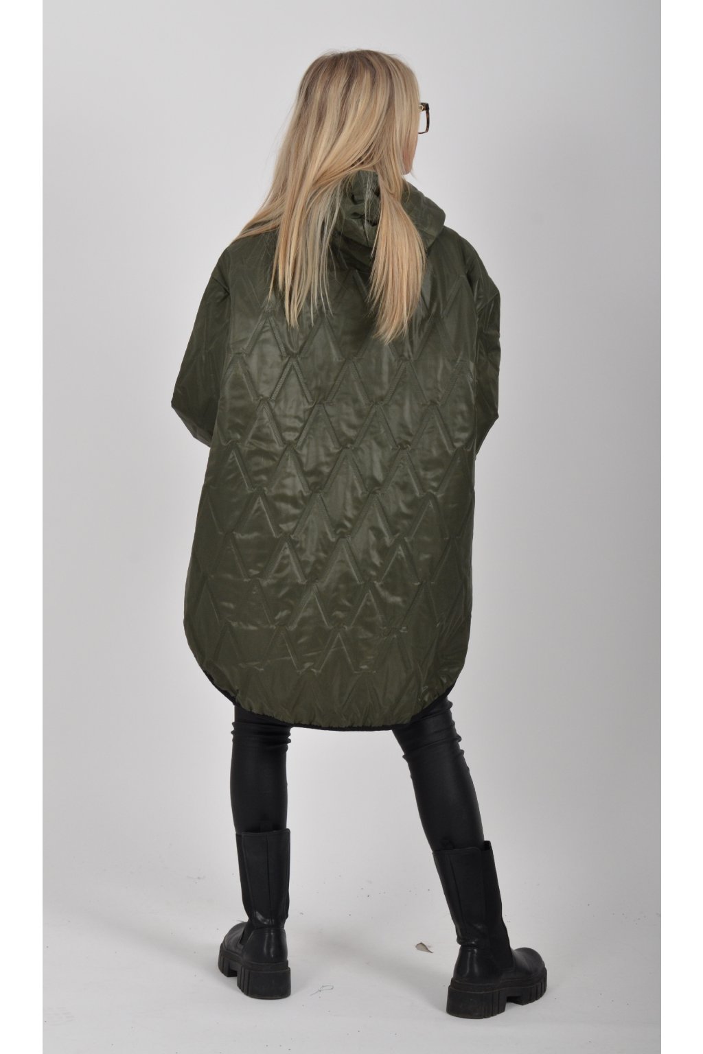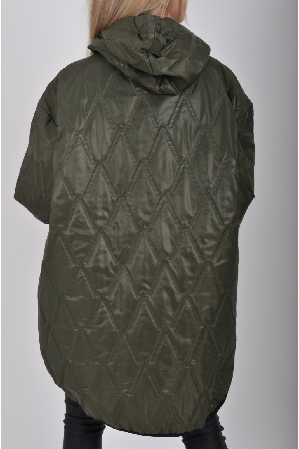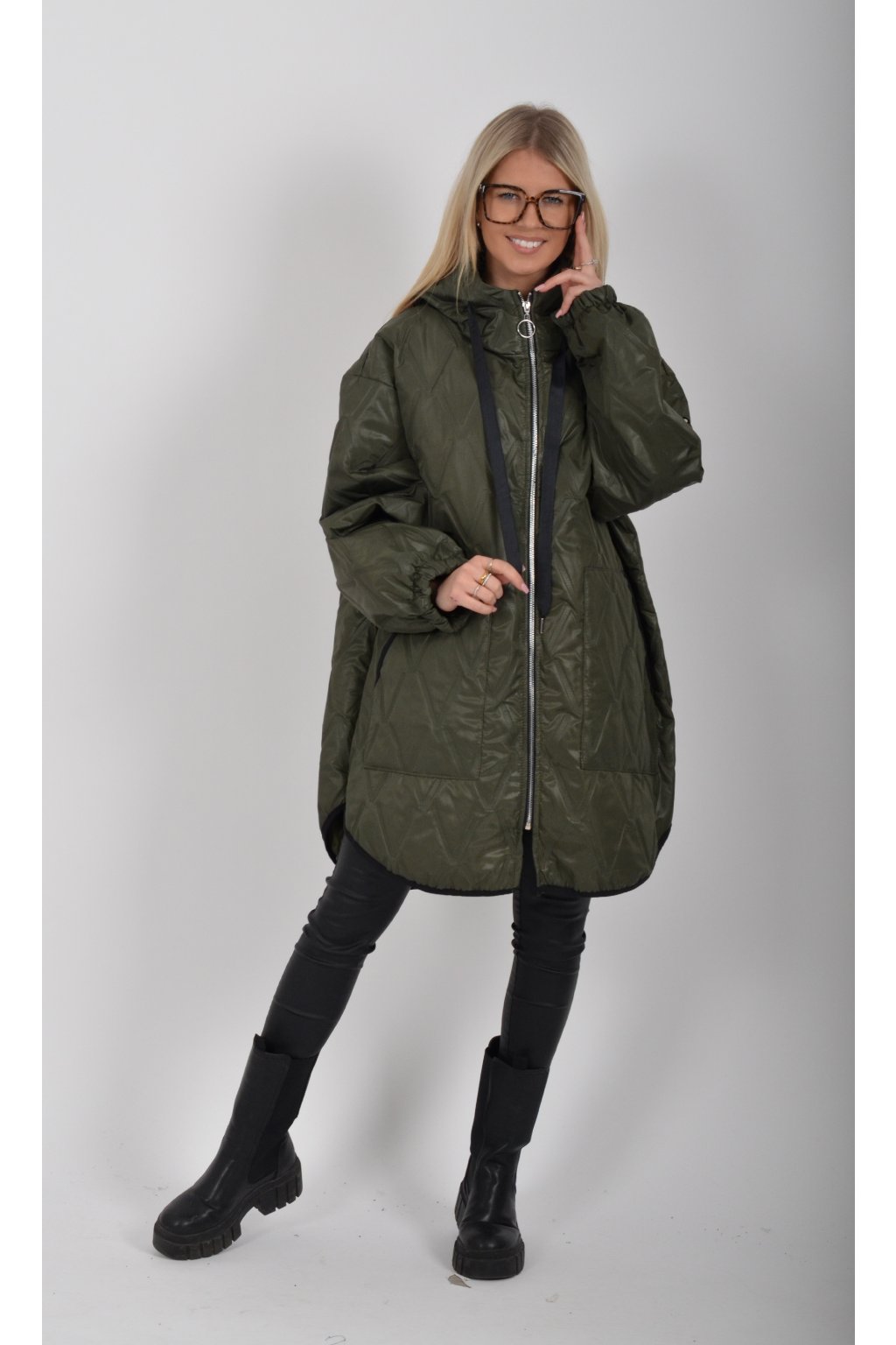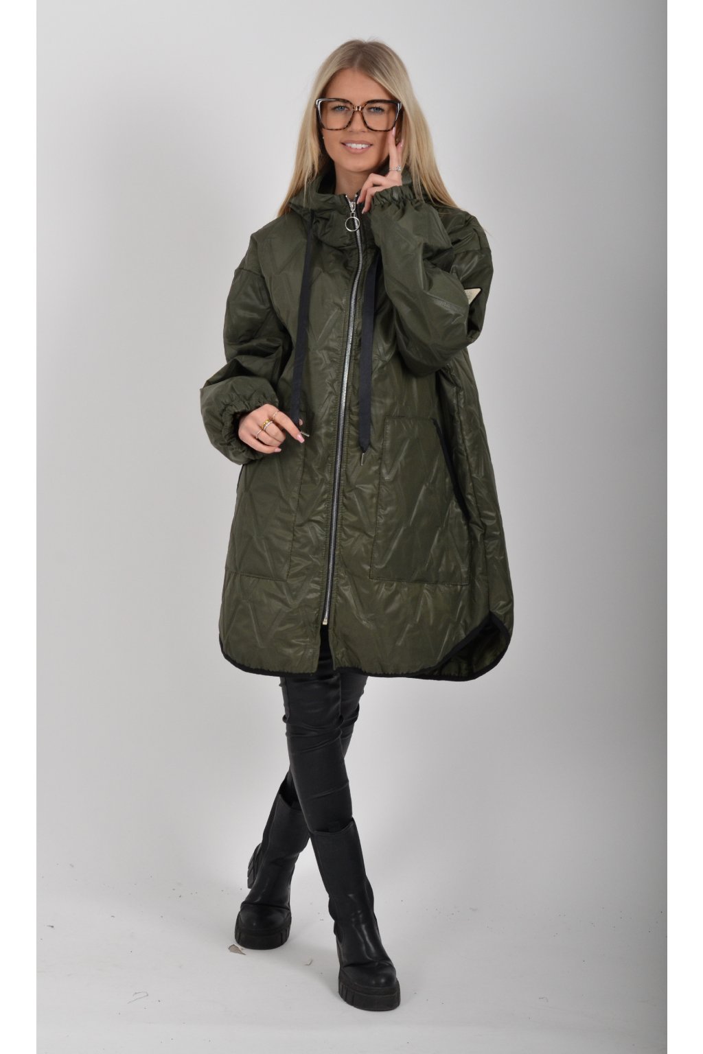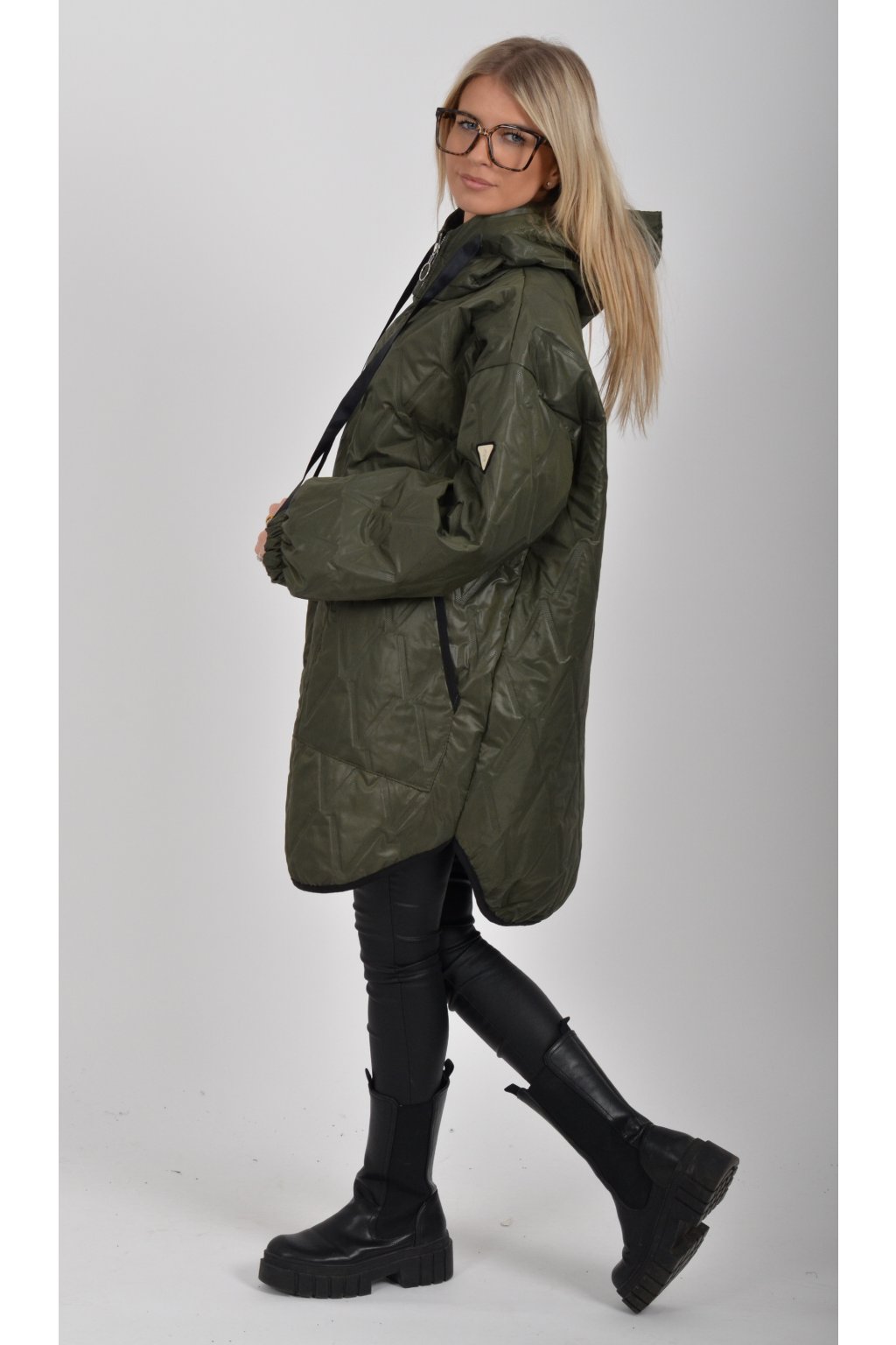 Přechodová oversize bunda s kapuci a kapsami v přední části. Je volnějšího stylu, u krku má šňurky na stažení. Velice lehký a měkký materiál.