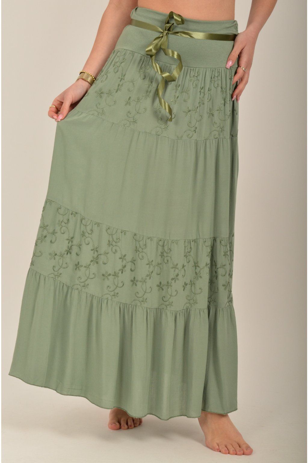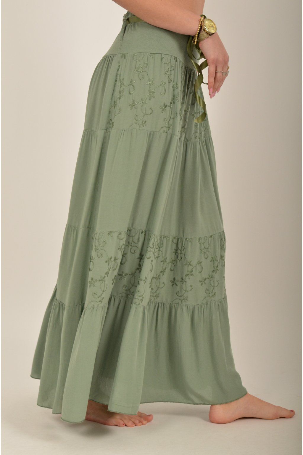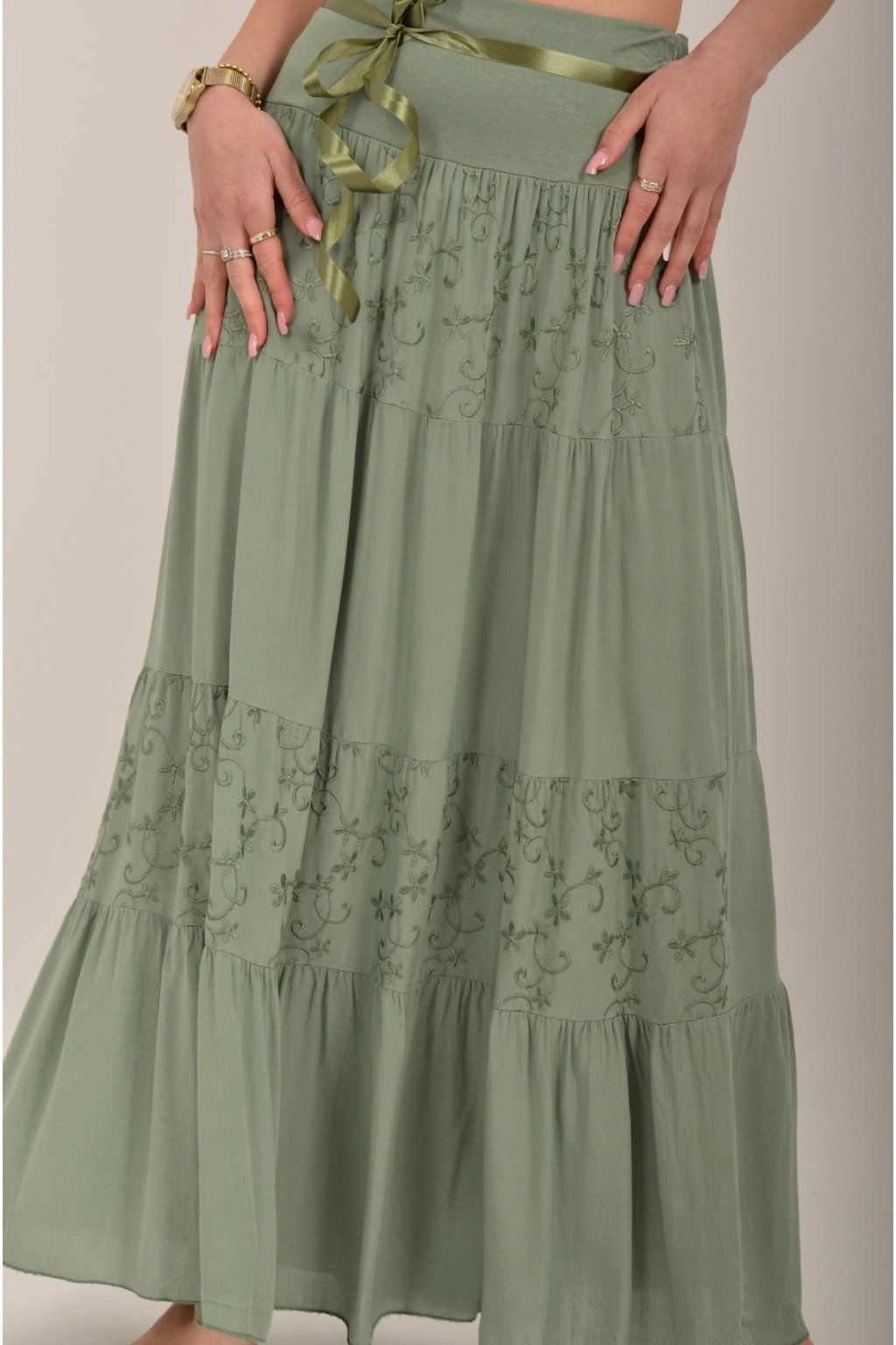Sukně z velice příjemného a lehounkého materiálu s vyšívaným vzorem. V pase je zapracovaná guma a stužka pro libovolné stažení.