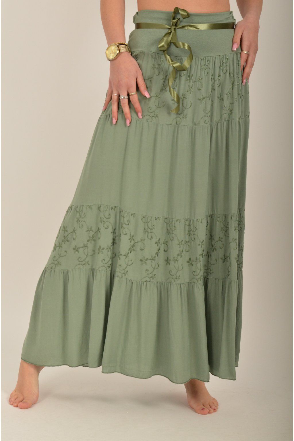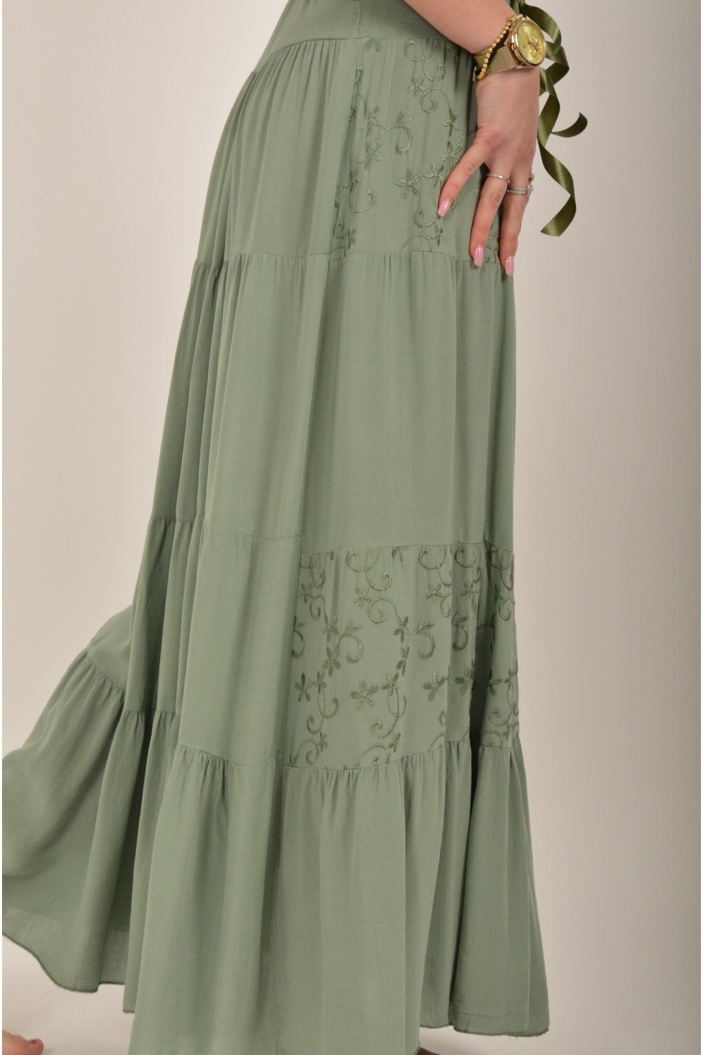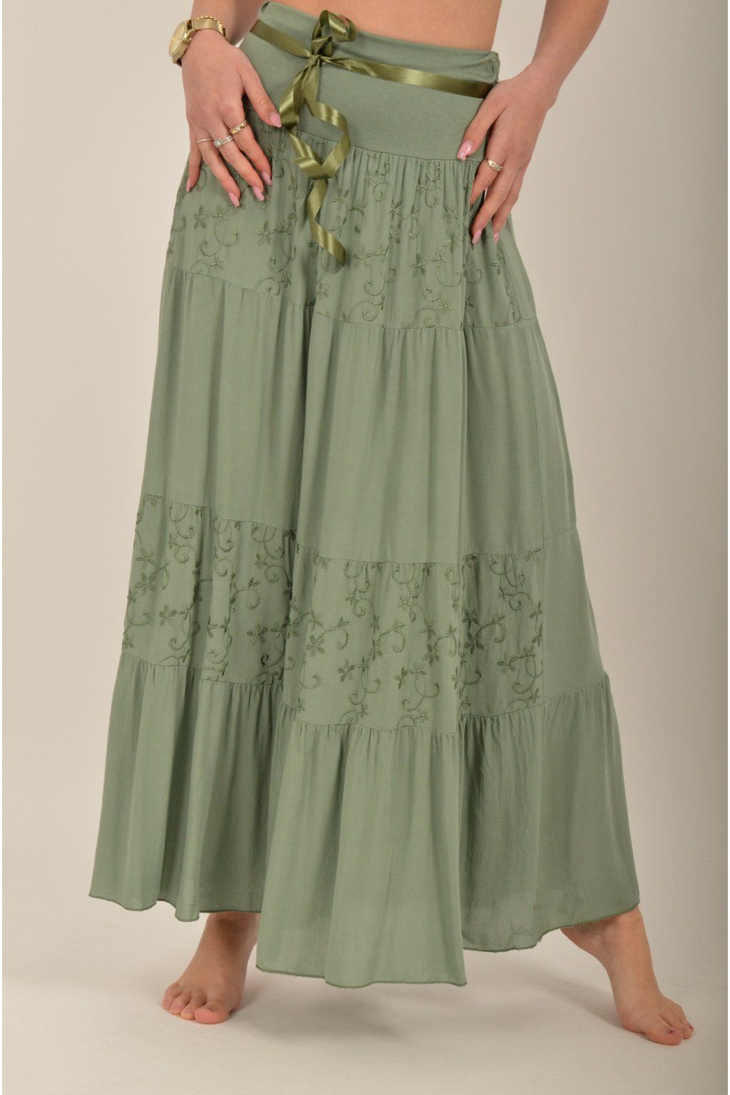 Sukně z velice příjemného a lehounkého materiálu s vyšívaným vzorem. V pase je zapracovaná guma a stužka pro libovolné stažení.
