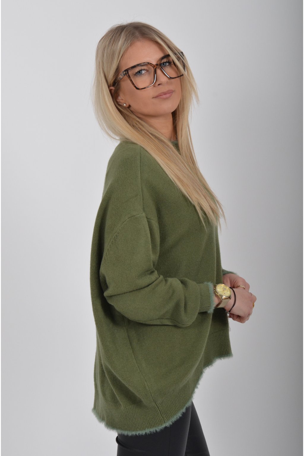 Svetr s dlouhým rukávem vyrobený z příjemného materiálu. Spodní část svetru má atypický střih