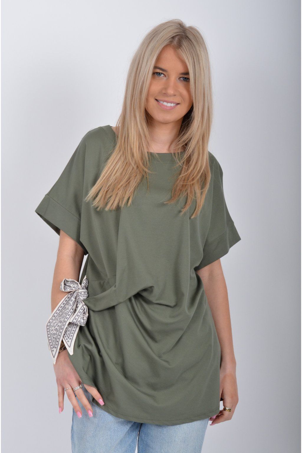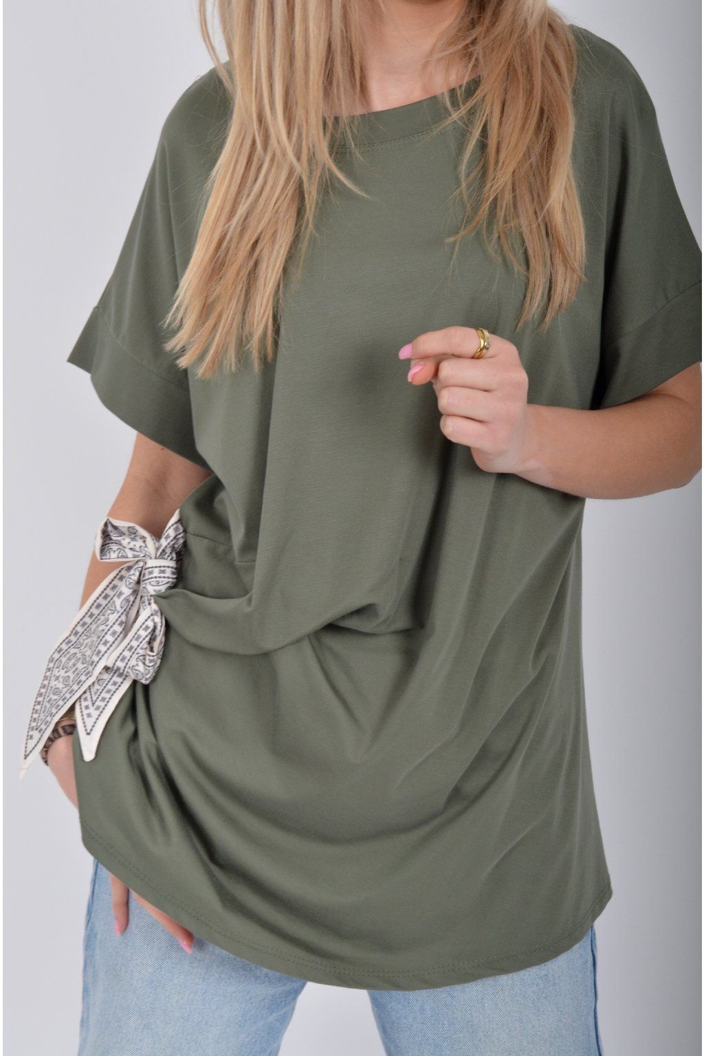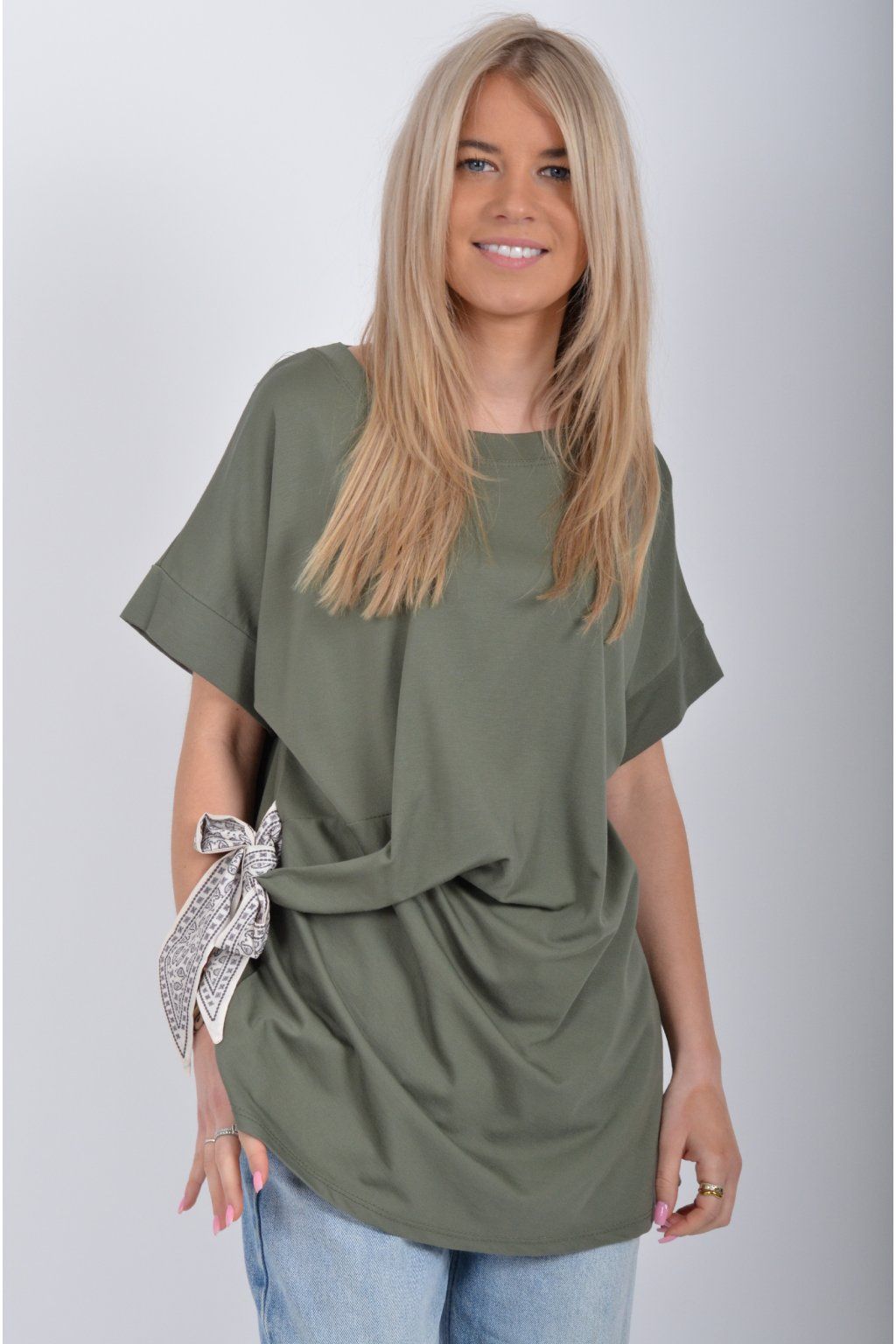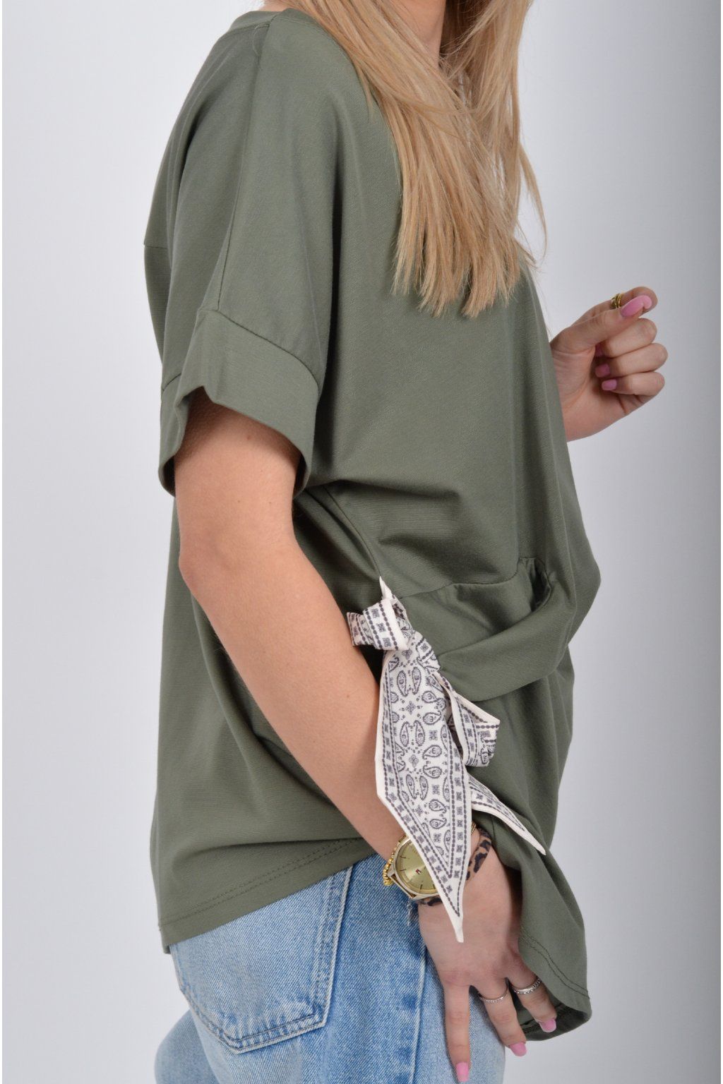Tričko s krátkým rukávem a vázáním na boku vyrobené z velice příjemného a elastické materiálu. Je ideální pro každodenní nošení.