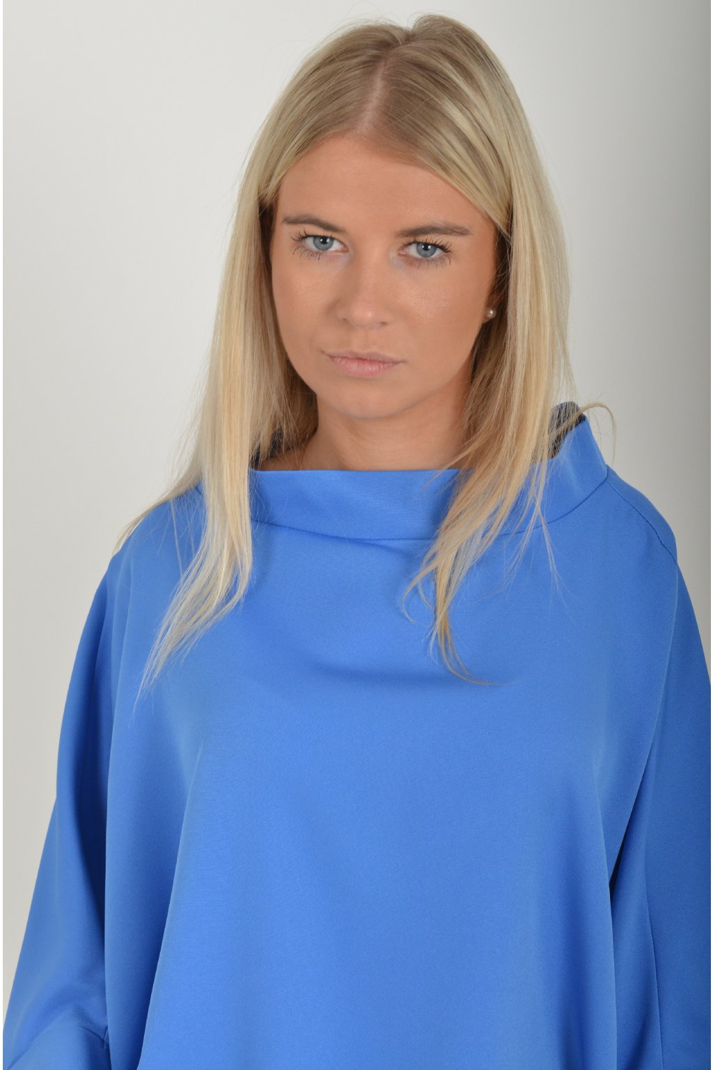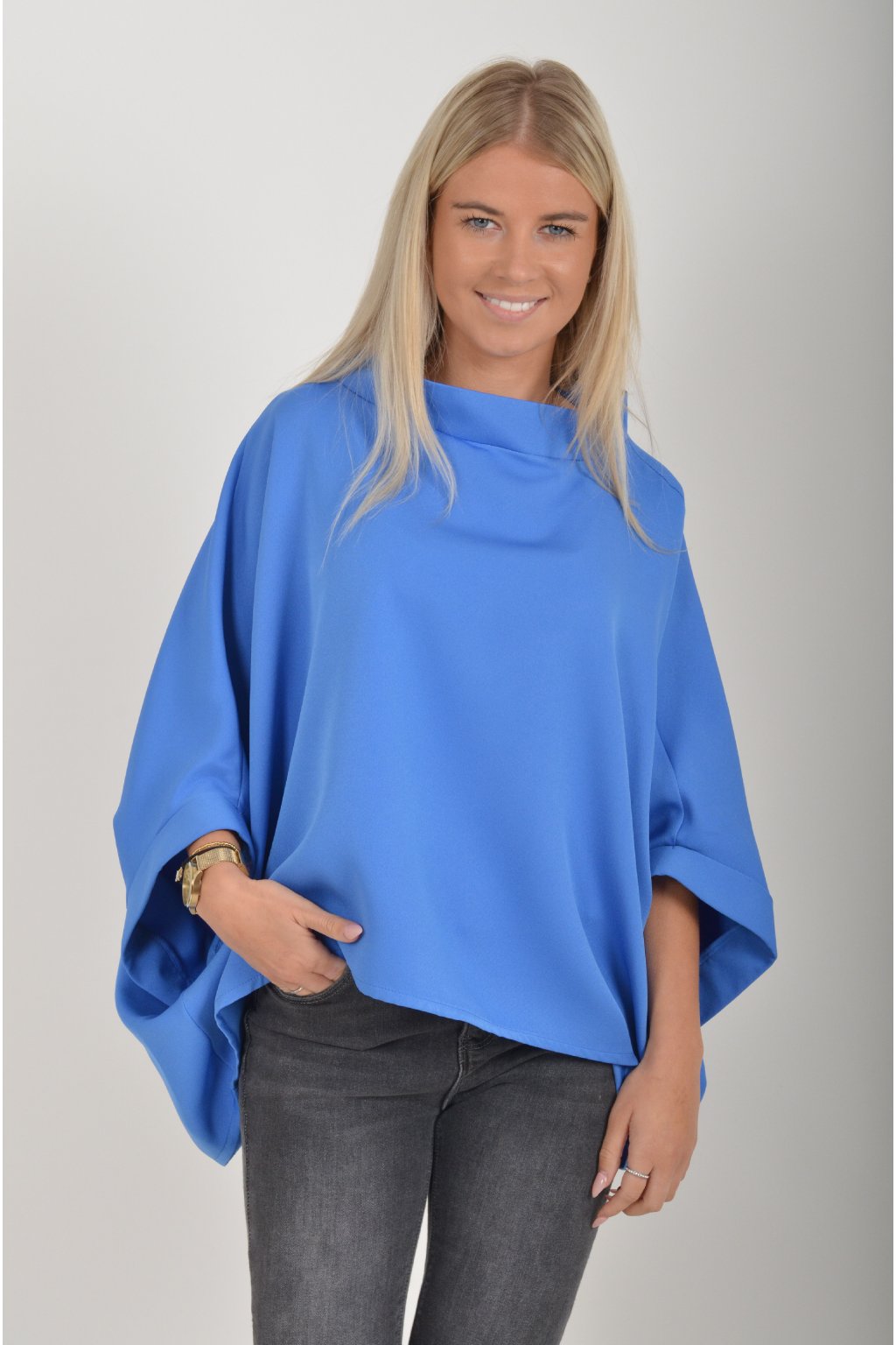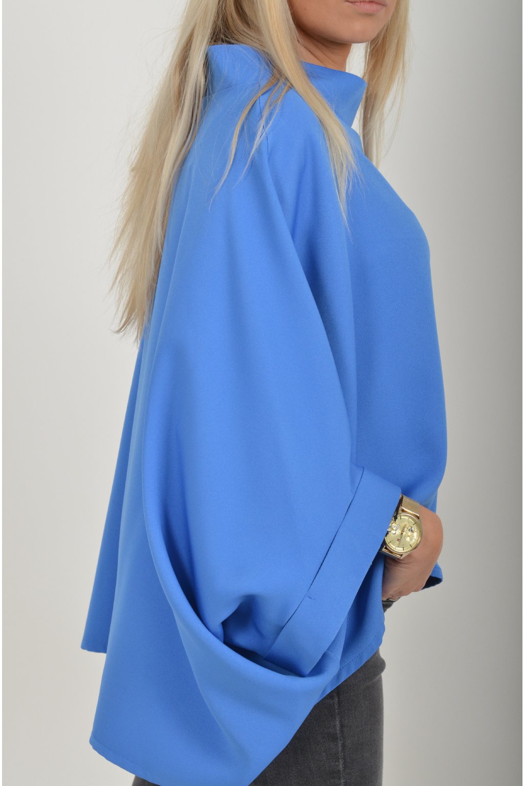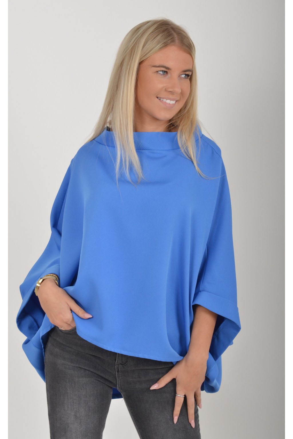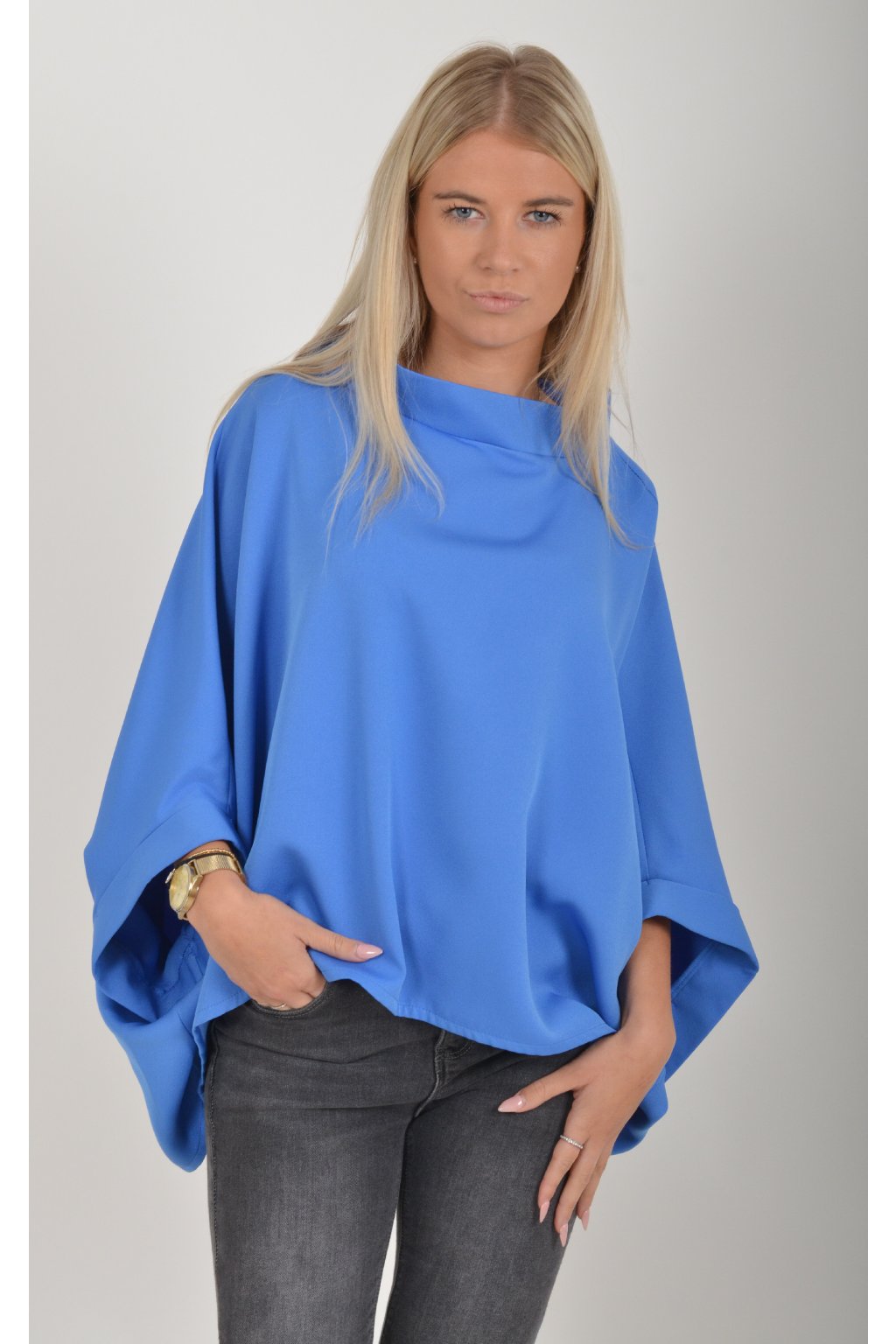 Halenka s netopýřím rukávem vhodná jak pro společenské události, tak i volnočasové nošení. Je vyrobena z velice příjemného a pevného materiálu. Přední část halenky je kratší než zadní. Je volnějšího střihu.