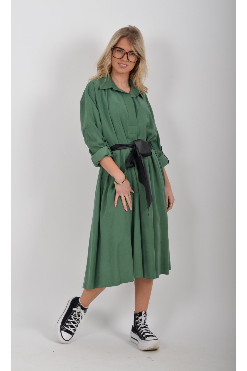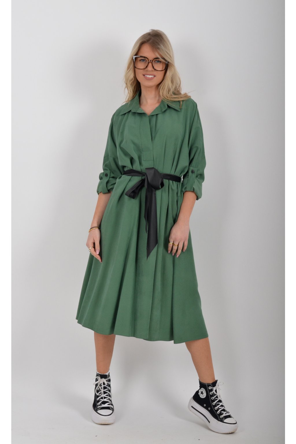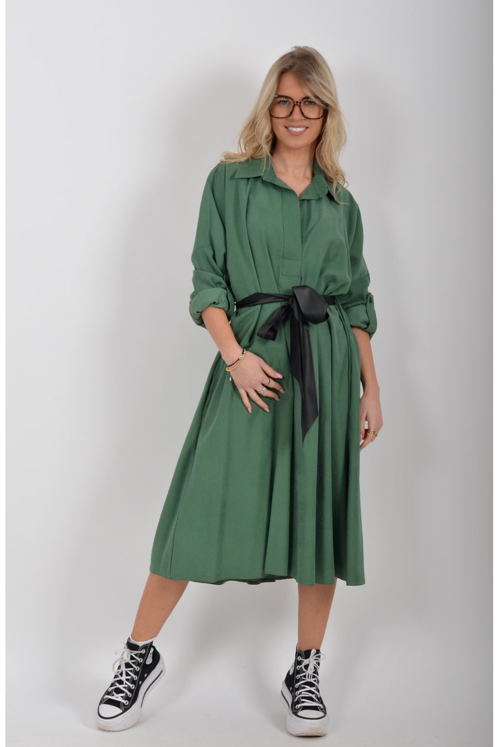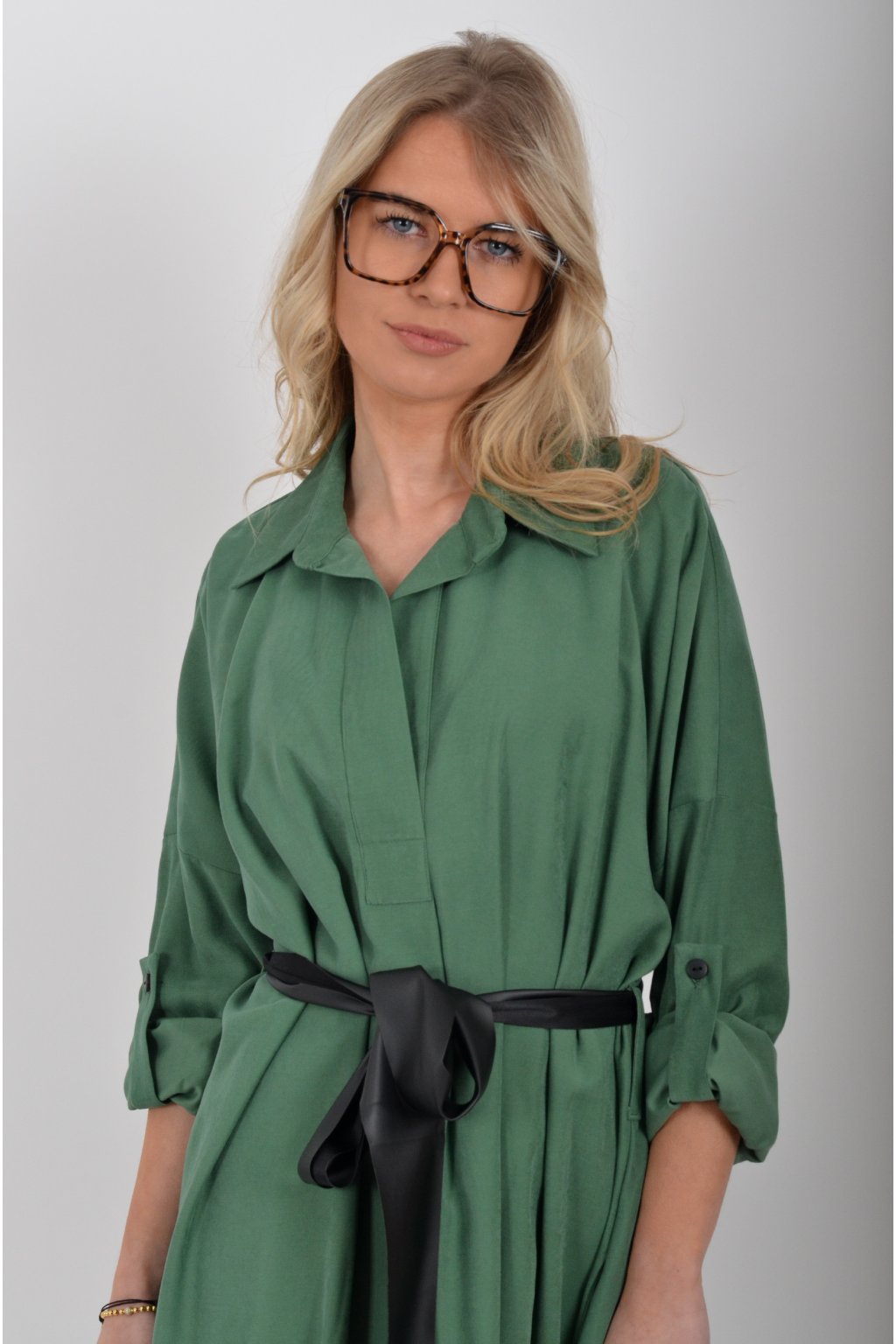 Jednou za dámu, jednou jen tak ven, tyto luxusní šaty od značky La Furia splní oboje. Mají košilový áčkový střih s rozevlátou sukní, která je v zadní části mírně delší. Šaty mají na bocích kapsy. Rukávy jsou dlouhé, ale dají se zkrátit na knoflíček. Výrazným doplňkem šatů je pásek s imitací kůže, který můžete jakkoliv vázat a kombinovat. K šatům doporučujeme ozdobnou brož nebo šperky z naší kolekce.