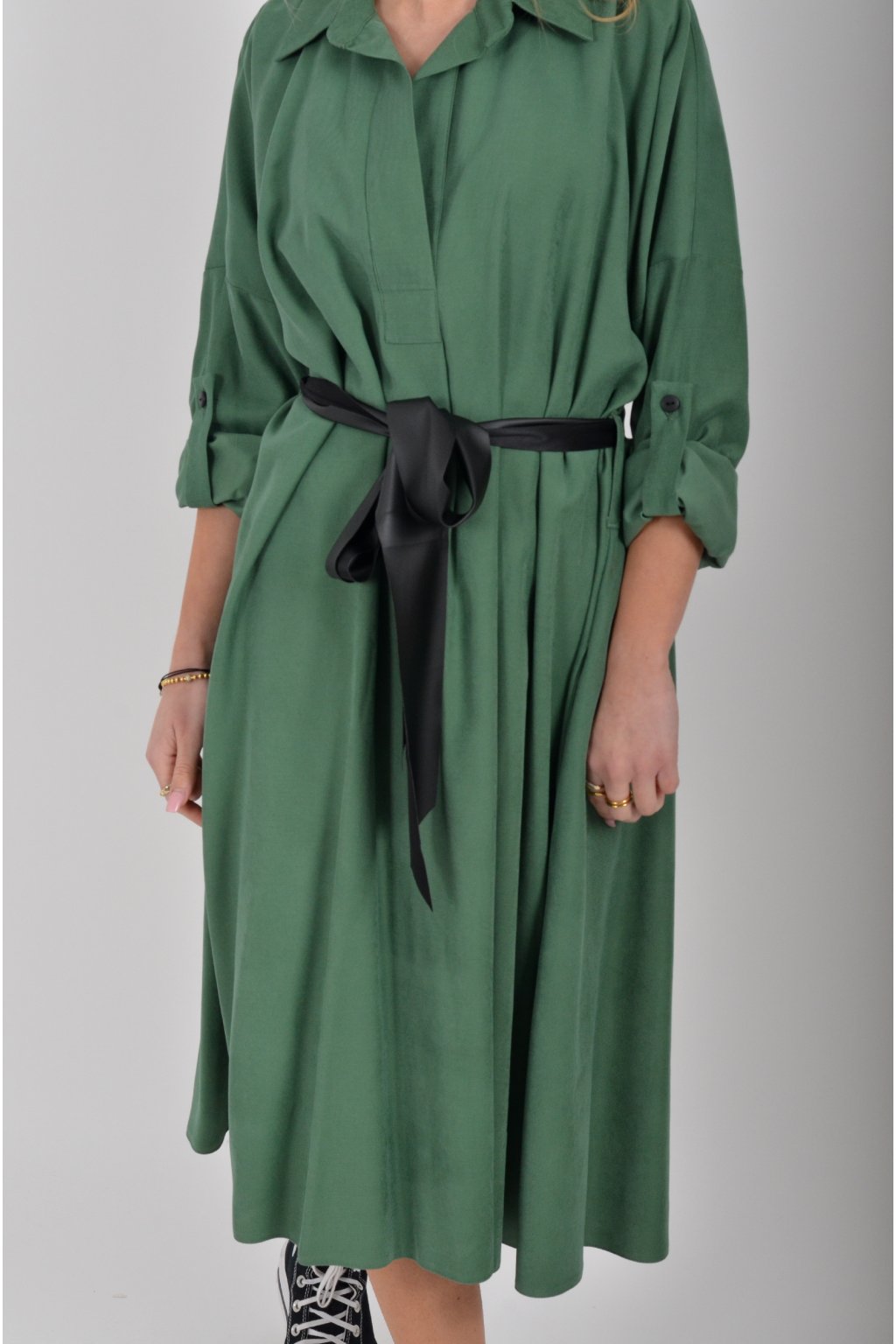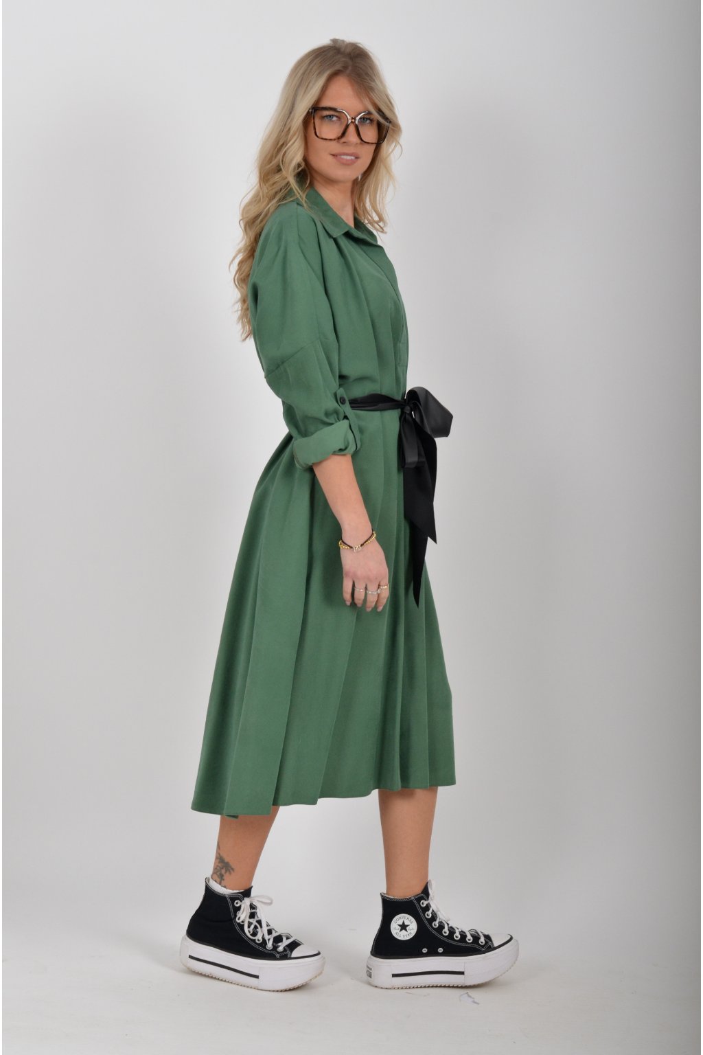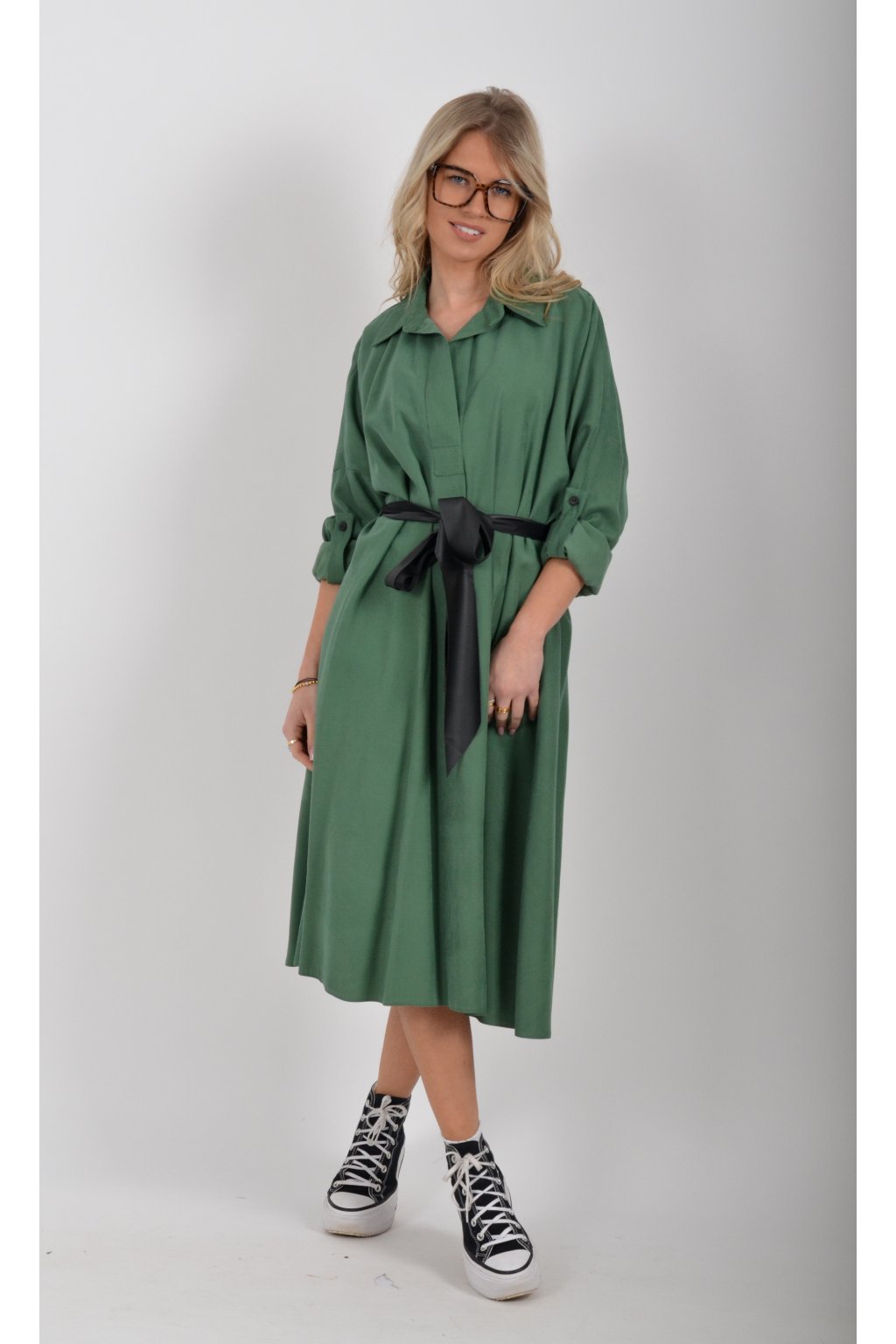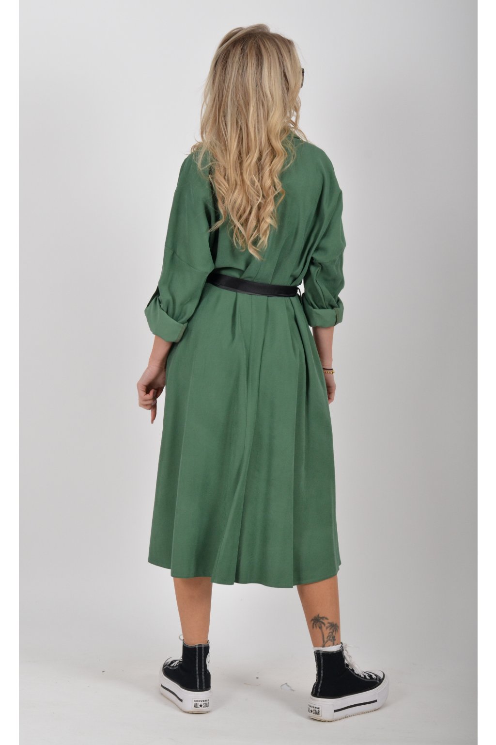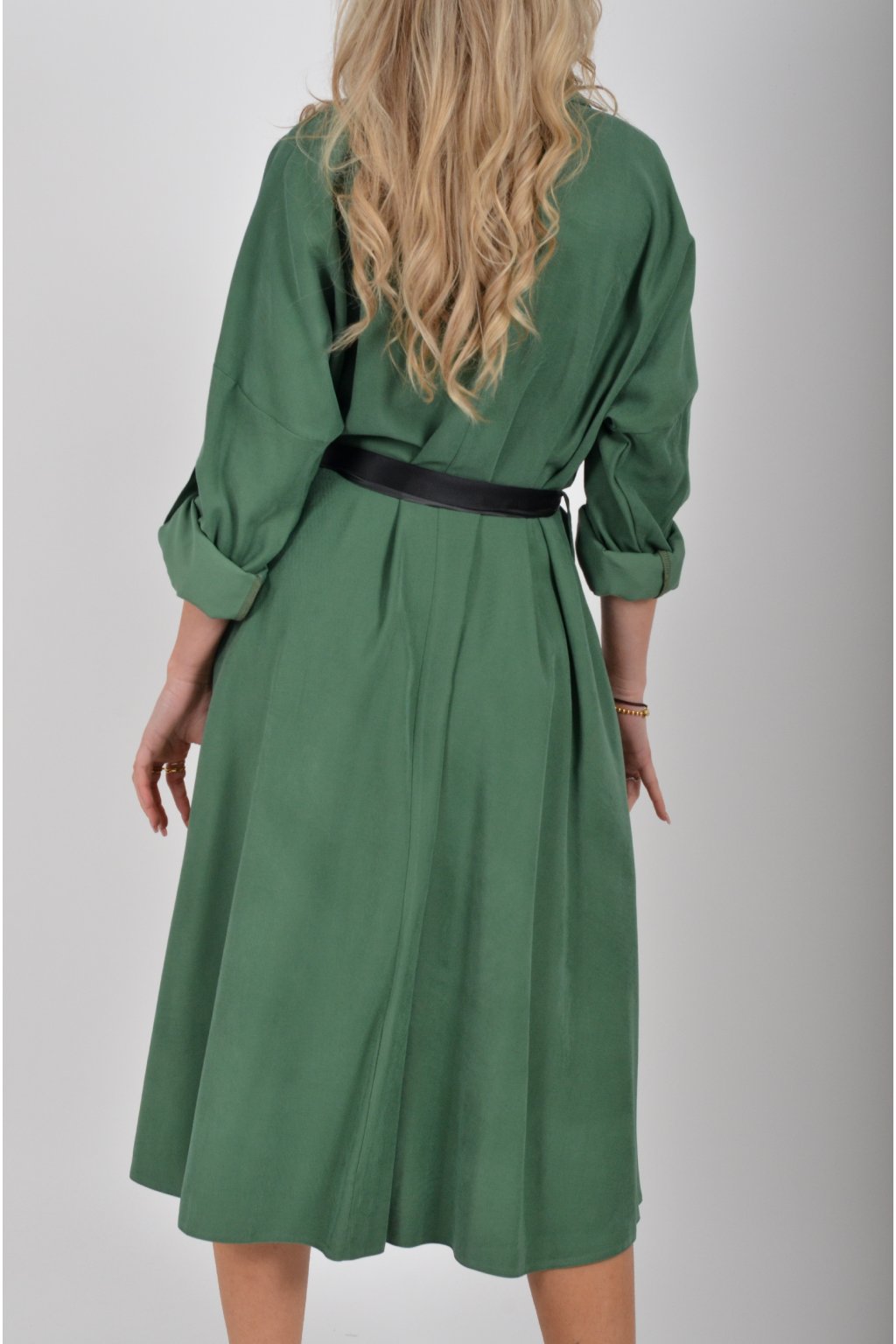 Jednou za dámu, jednou jen tak ven, tyto luxusní šaty od značky La Furia splní oboje. Mají košilový áčkový střih s rozevlátou sukní, která je v zadní části mírně delší. Šaty mají na bocích kapsy. Rukávy jsou dlouhé, ale dají se zkrátit na knoflíček. Výrazným doplňkem šatů je pásek s imitací kůže, který můžete jakkoliv vázat a kombinovat. K šatům doporučujeme ozdobnou brož nebo šperky z naší kolekce.
