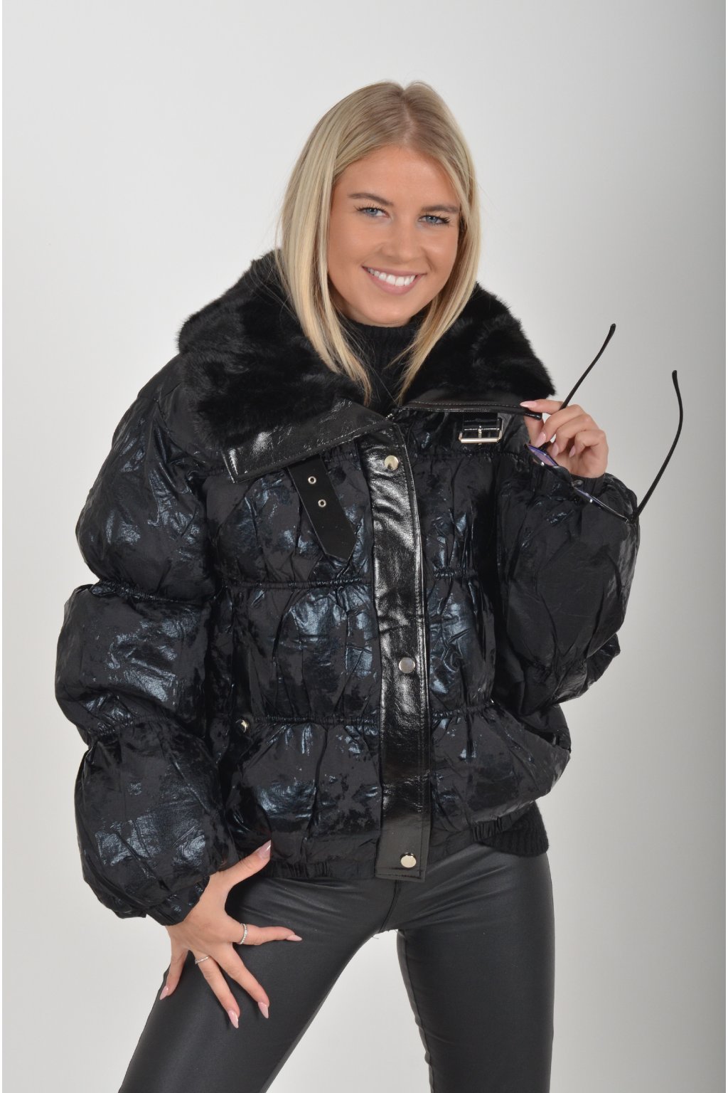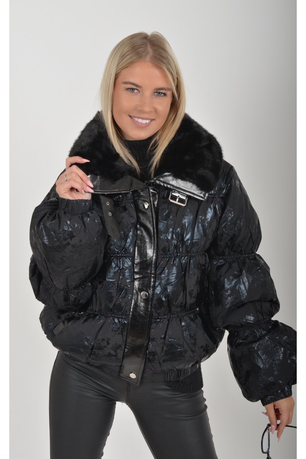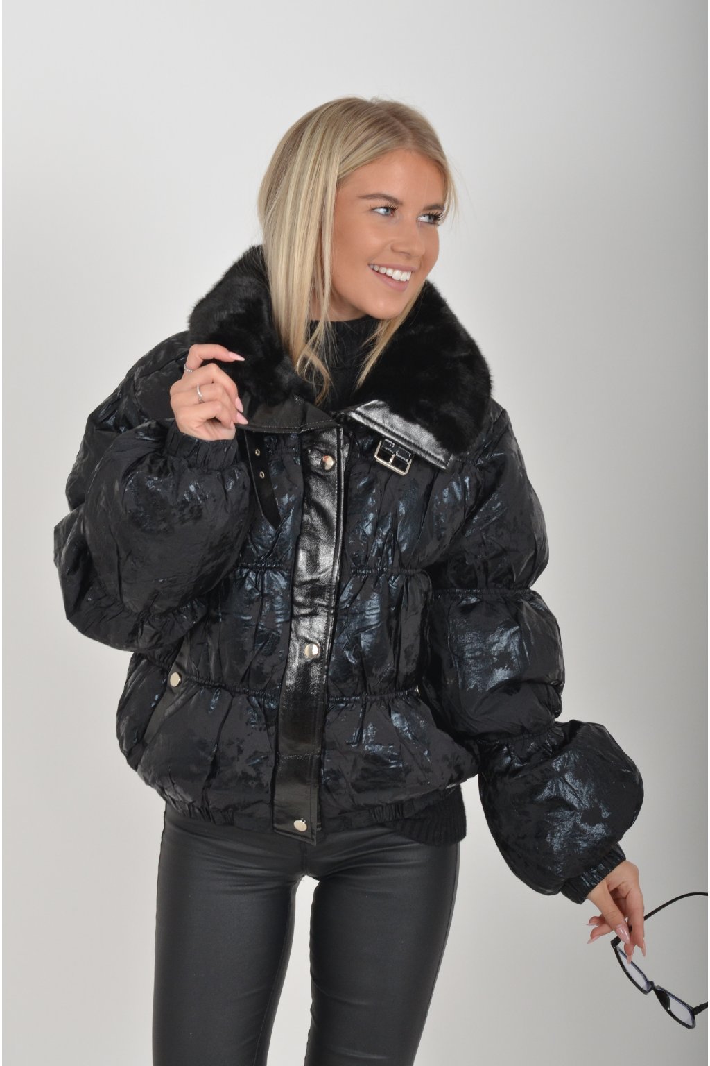 Lesklá, nadýchaná, stylová a příjemně hřejivá bunda s balonovými rukávy a elastickým pasem. Krátký střih zvýrazní postavu, hebký kožíšek u krku a koženkové detaily dodají bundě ten správný šmrnc. Skvěle se hodí k džínům, legínám i k zimním kozačkám.