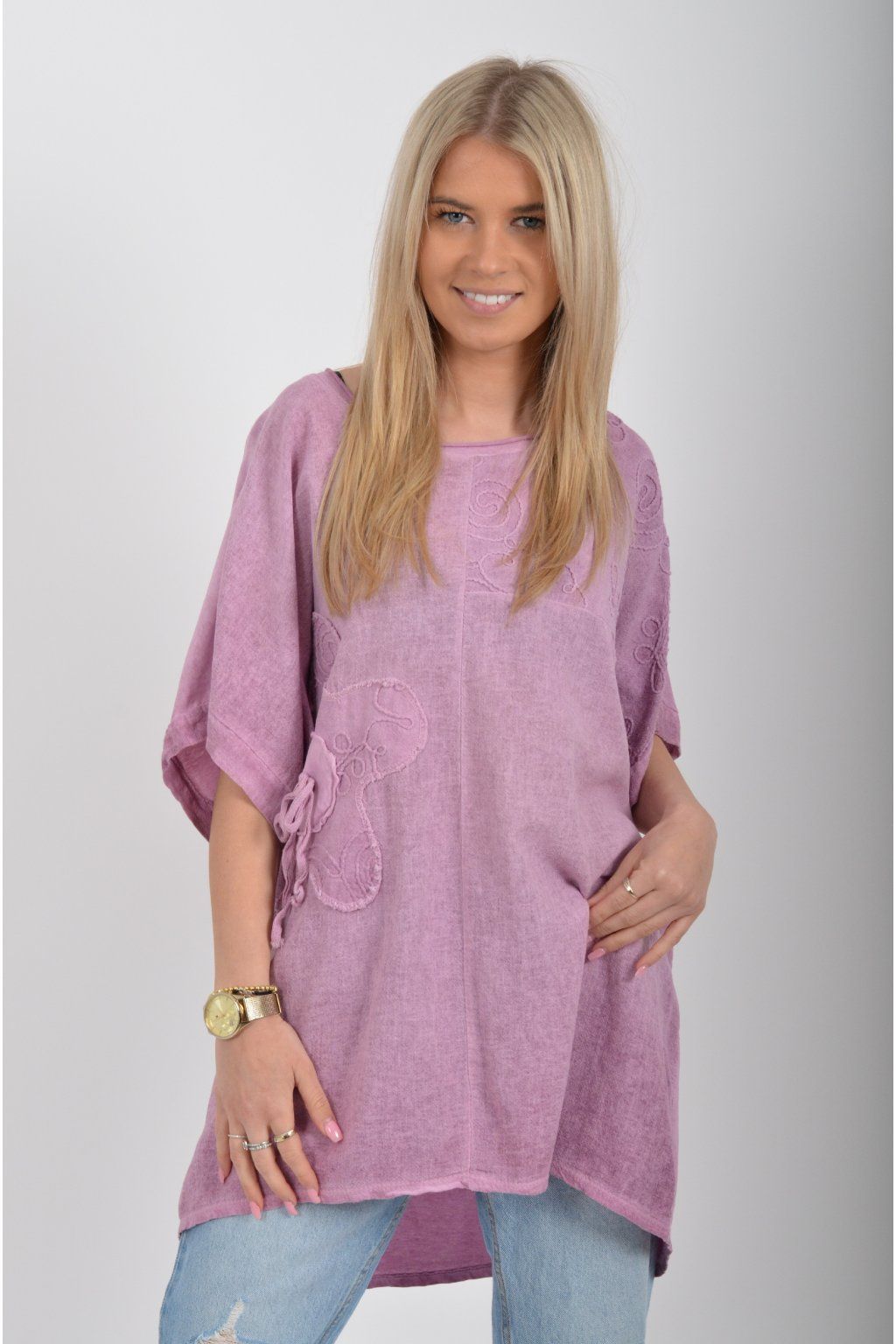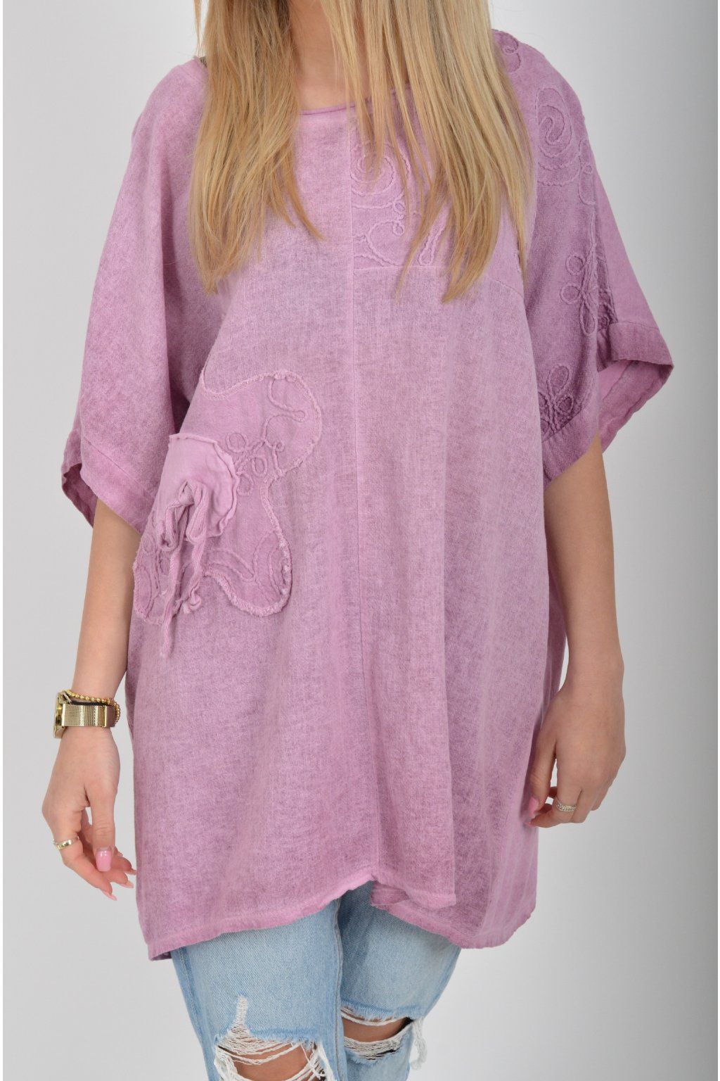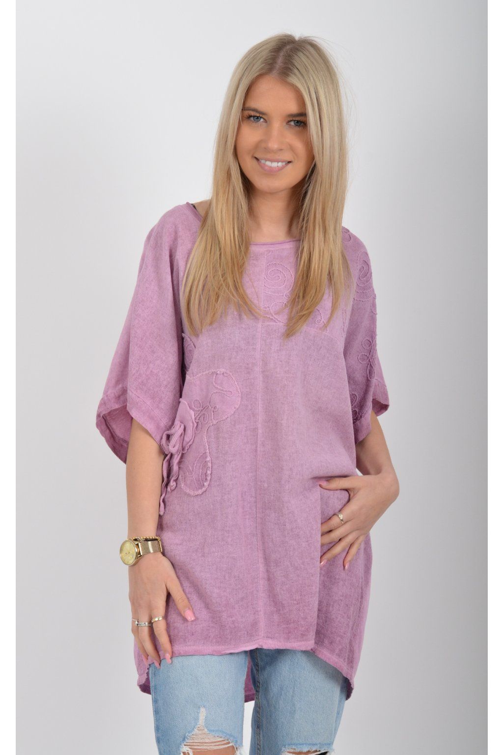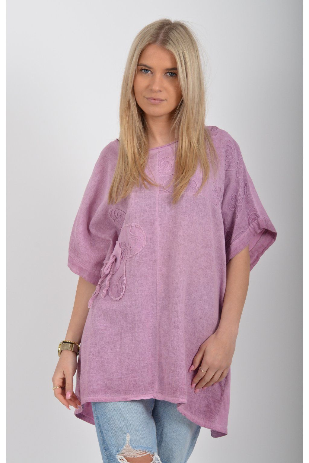 Oversize halenka s krátkým rukávem a vyšívaným vzorem vyrobená z velice příjemné bavlny. Materiál halenky je lehce pružný. Je volnějšího stylu nošení (není na tělo)