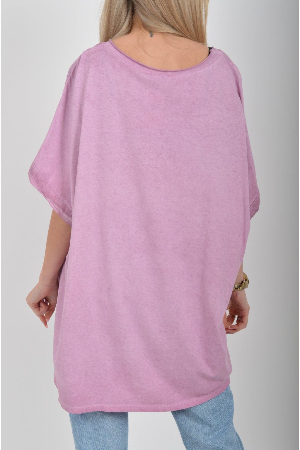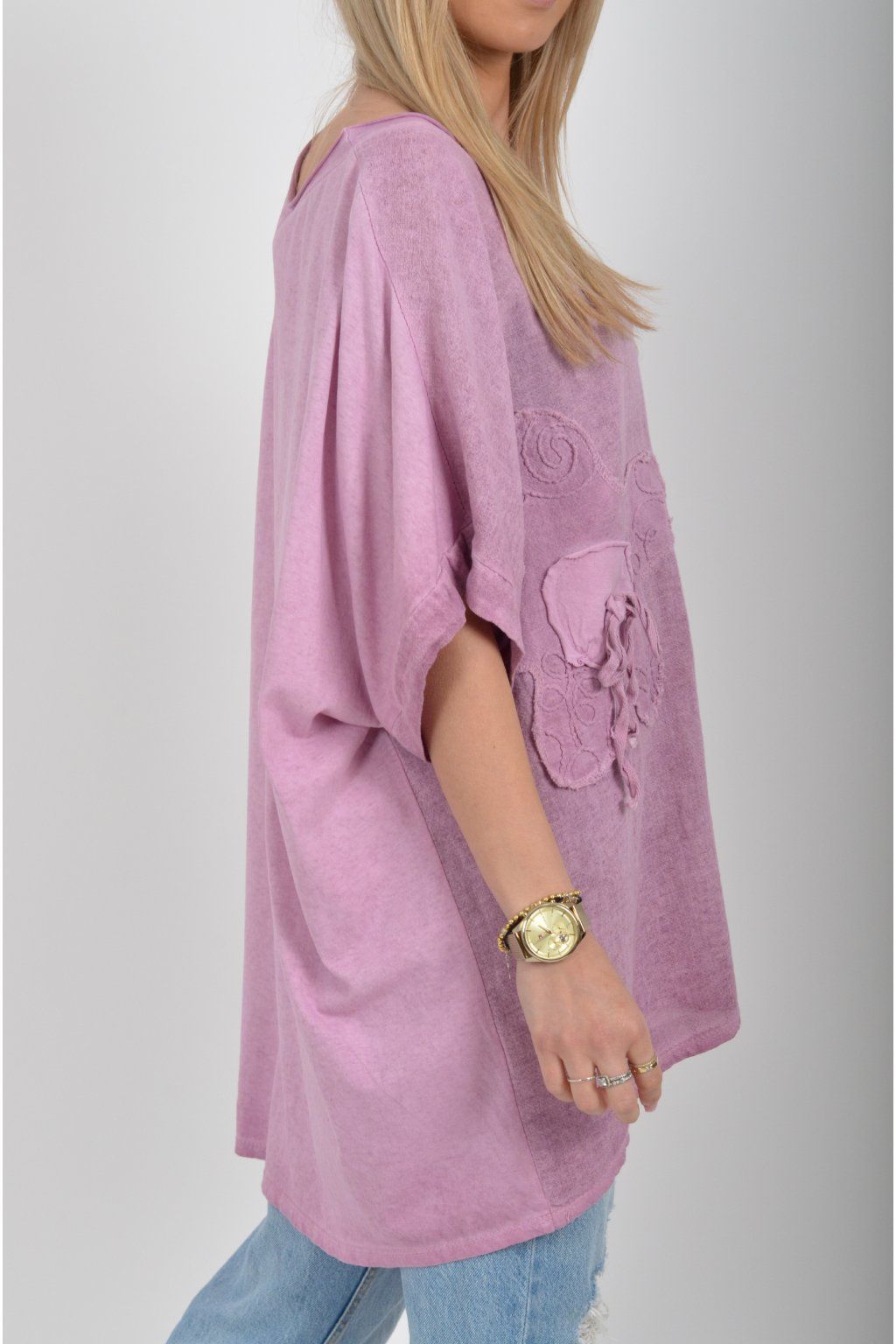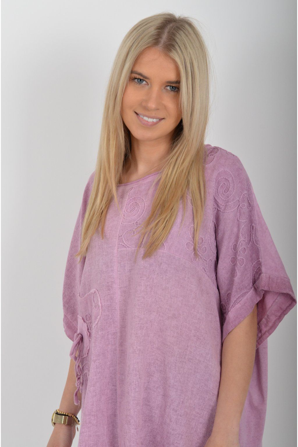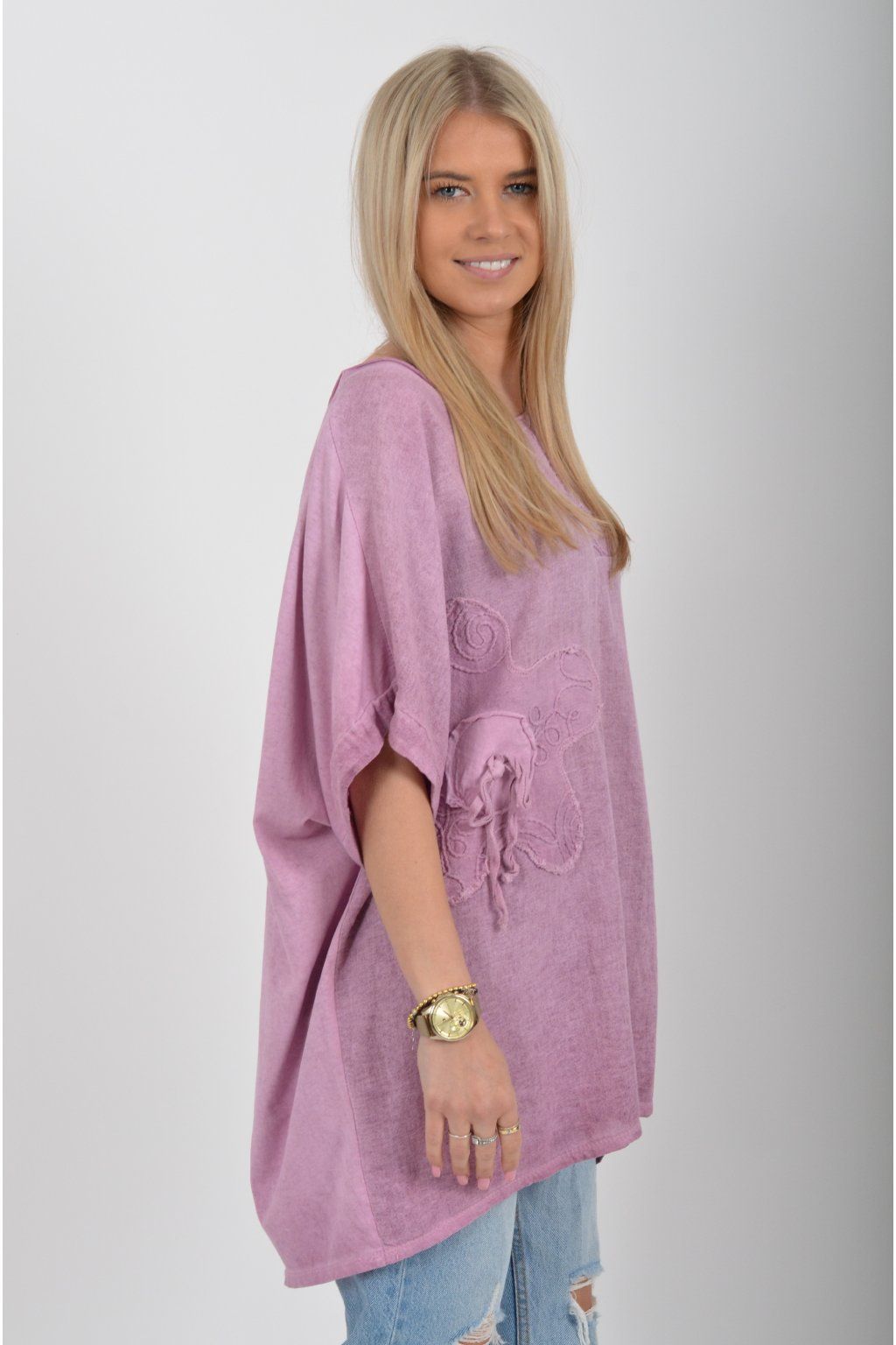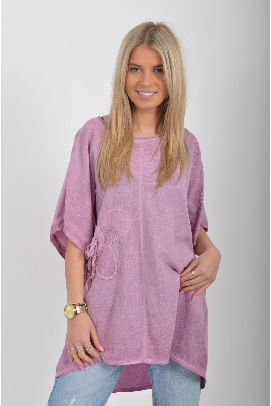 Oversize halenka s krátkým rukávem a vyšívaným vzorem vyrobená z velice příjemné bavlny. Materiál halenky je lehce pružný. Je volnějšího stylu nošení (není na tělo)