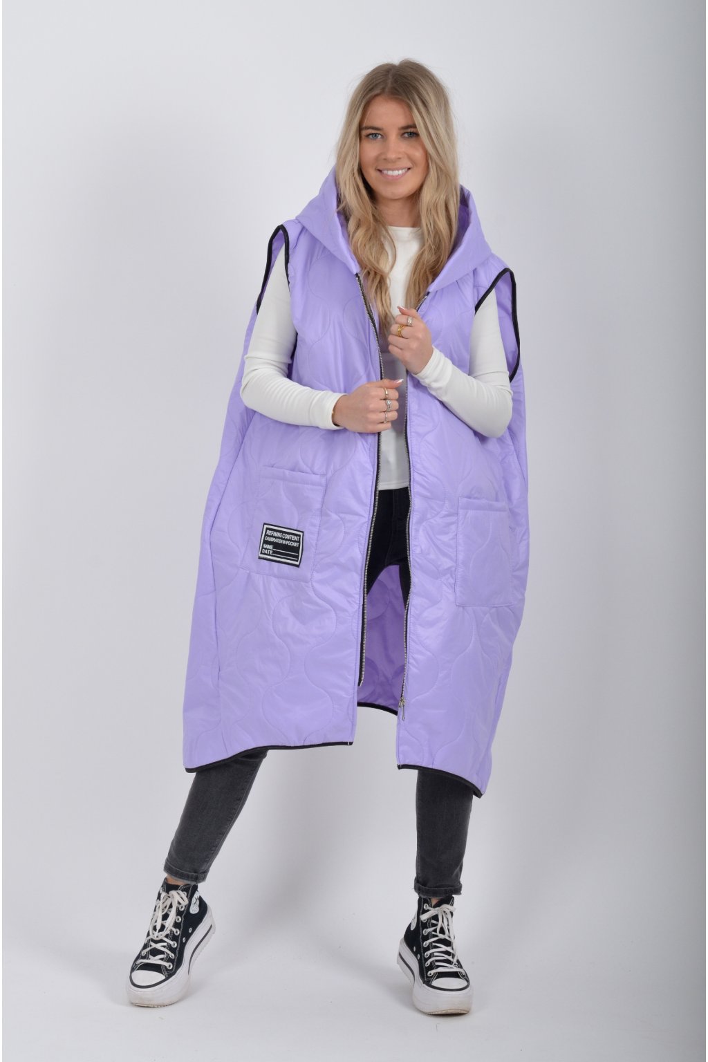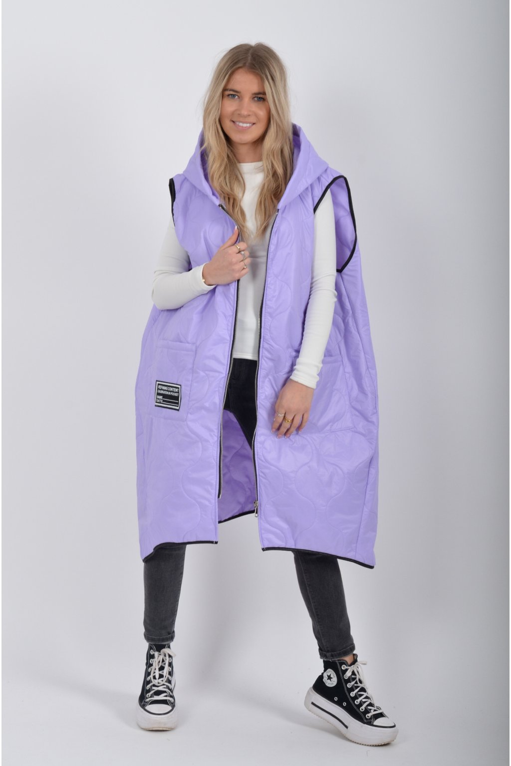 Prošívaná přechodová dlouhá vesta lehce áčkového střihu s kapucí a kapsami. Materiál vesty je z odlehčeného materiálu. Je ideální pro jarní nošení.