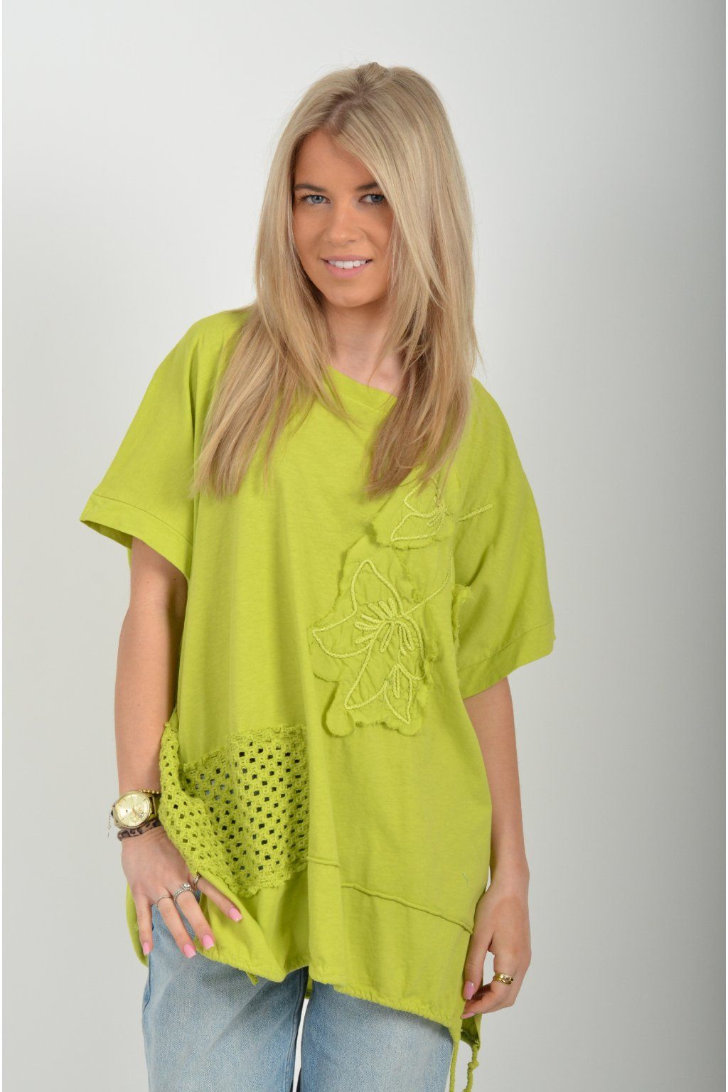 Oversize halenka s krátkým rukávem a vyšívaným vzorem vyrobená z velice příjemné bavlny. Materiál halenky je pružný. Ve spodní části na bocích má rozparky, a po celém spodním švu je zapracovaná tkanice pro libovolné stažení.