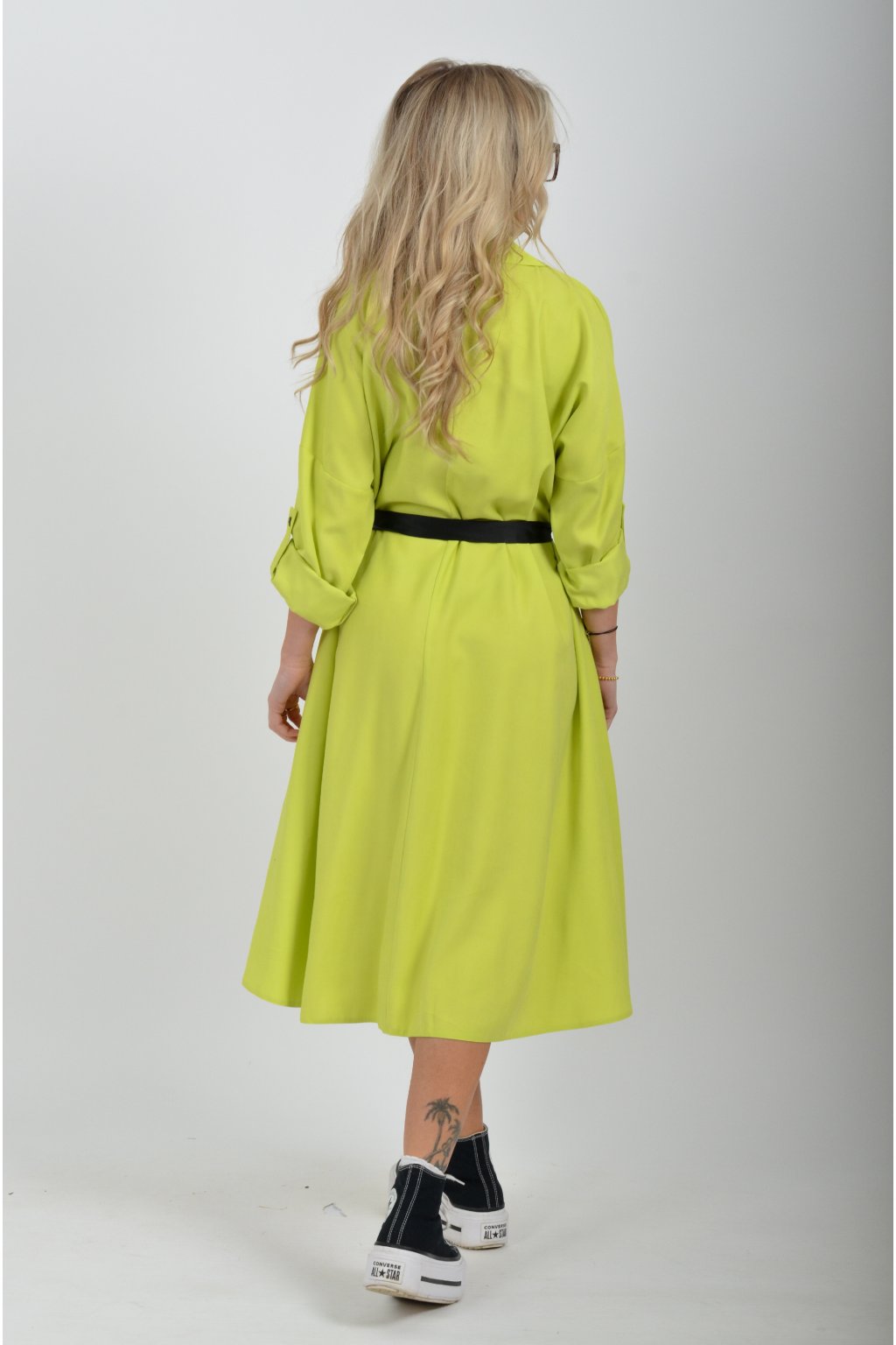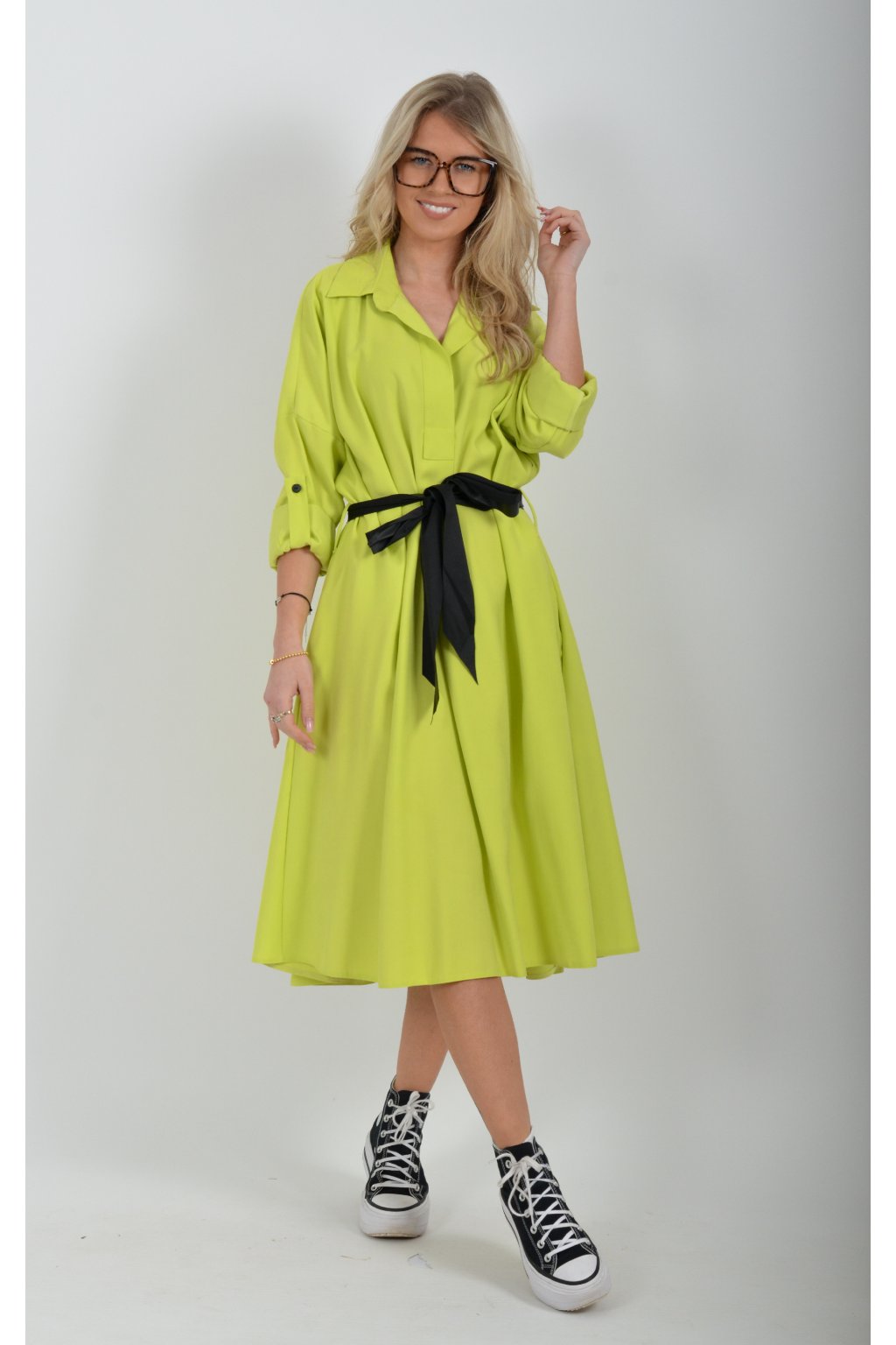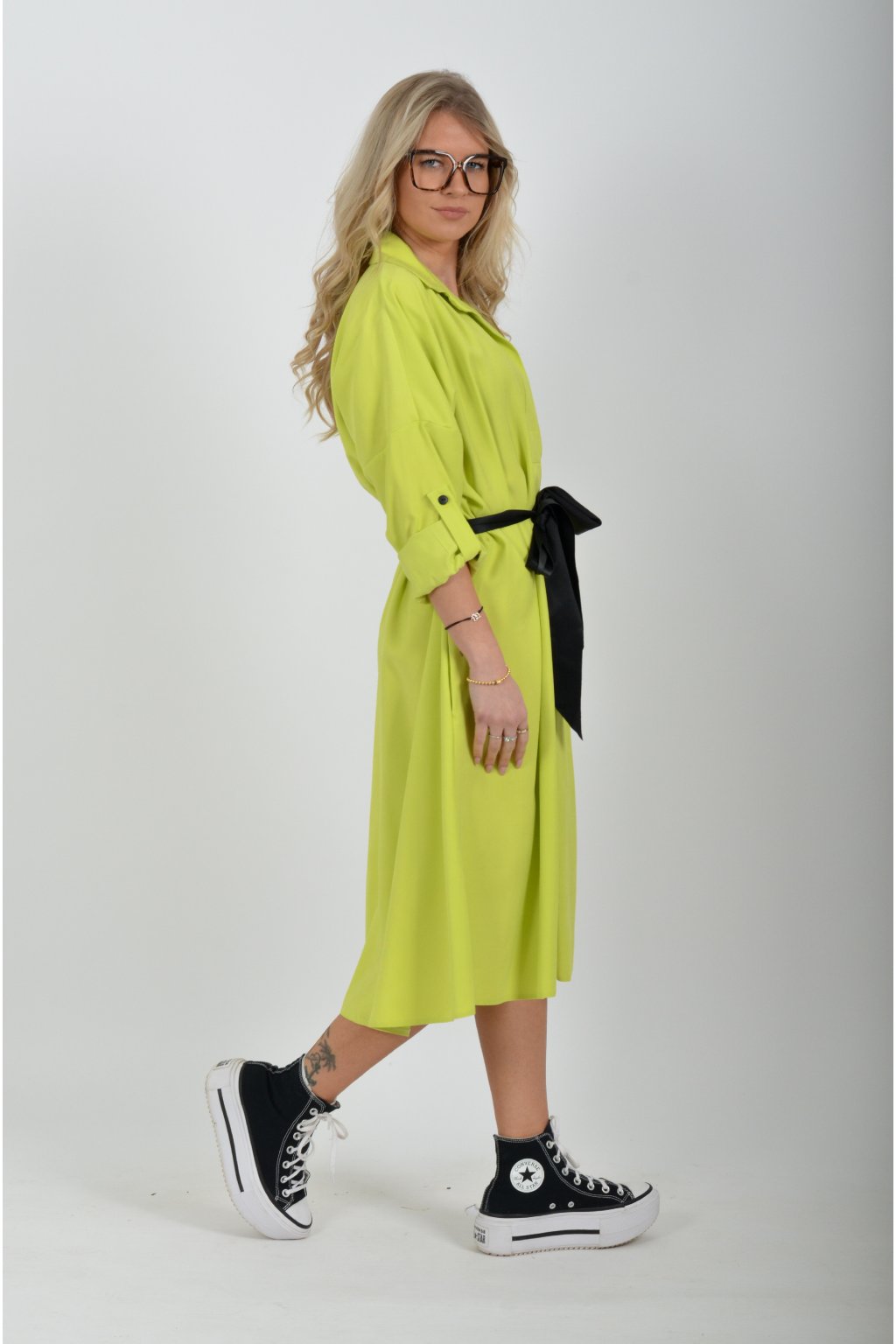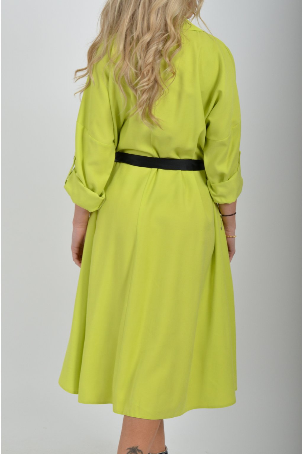 Jednou za dámu, jednou jen tak ven, tyto luxusní šaty od značky La Furia splní oboje. Mají košilový áčkový střih s rozevlátou sukní, která je v zadní části mírně delší. Šaty mají na bocích kapsy. Rukávy jsou dlouhé, ale dají se zkrátit na knoflíček. Výrazným doplňkem šatů je pásek s imitací kůže, který můžete jakkoliv vázat a kombinovat. K šatům doporučujeme ozdobnou brož nebo šperky z naší kolekce.