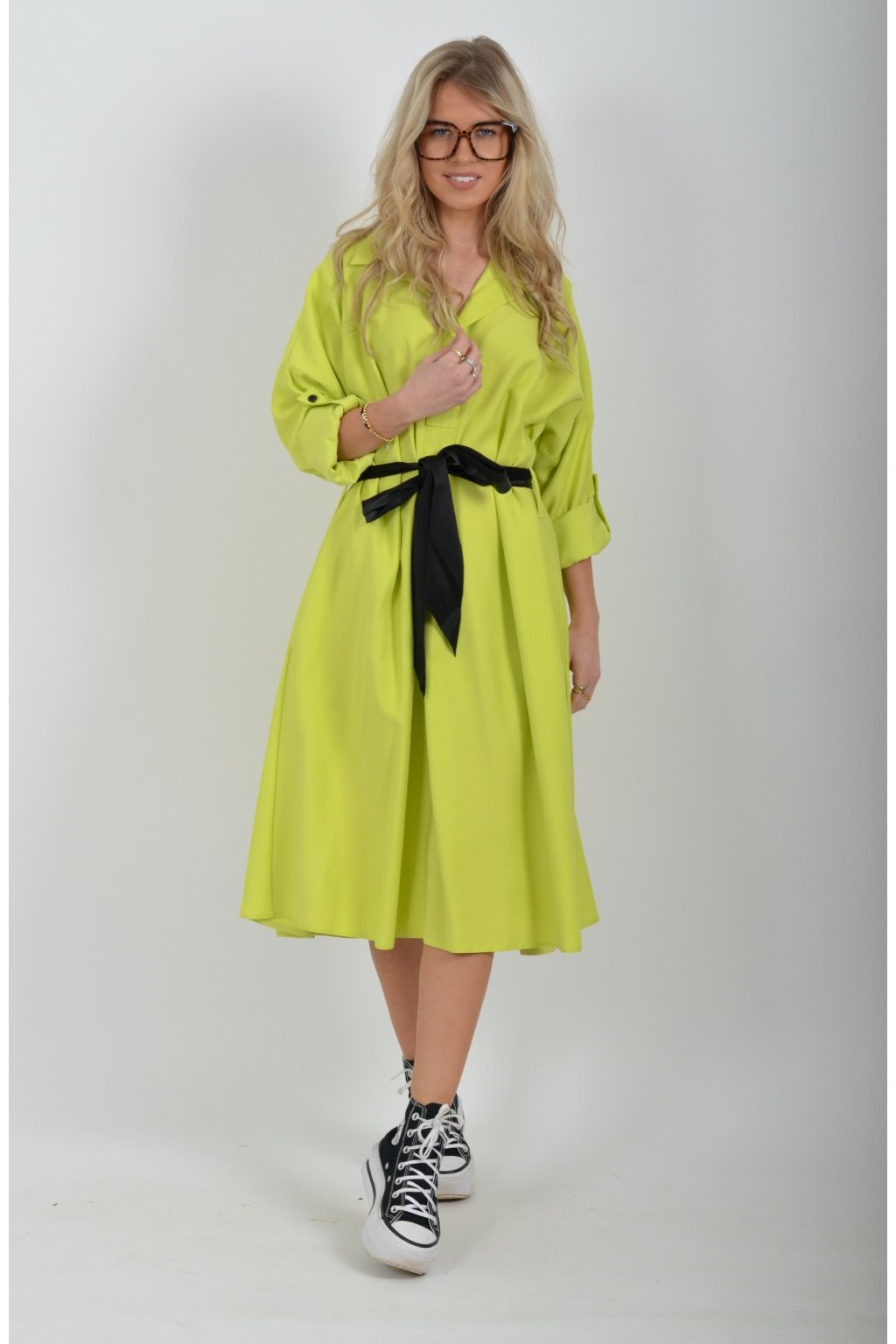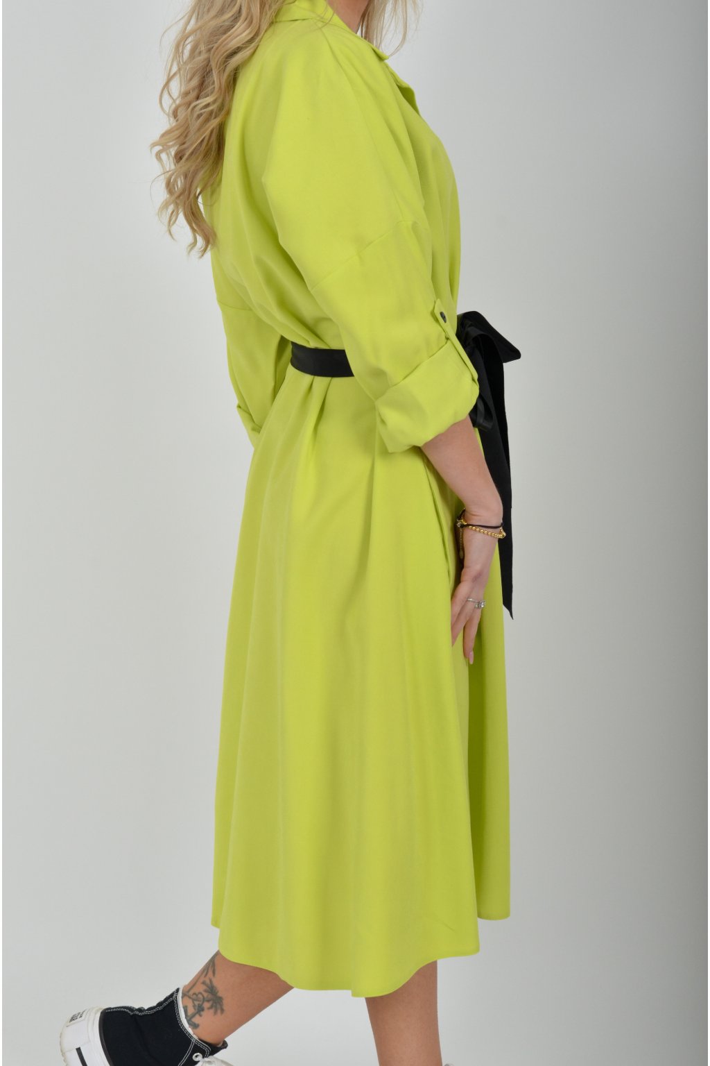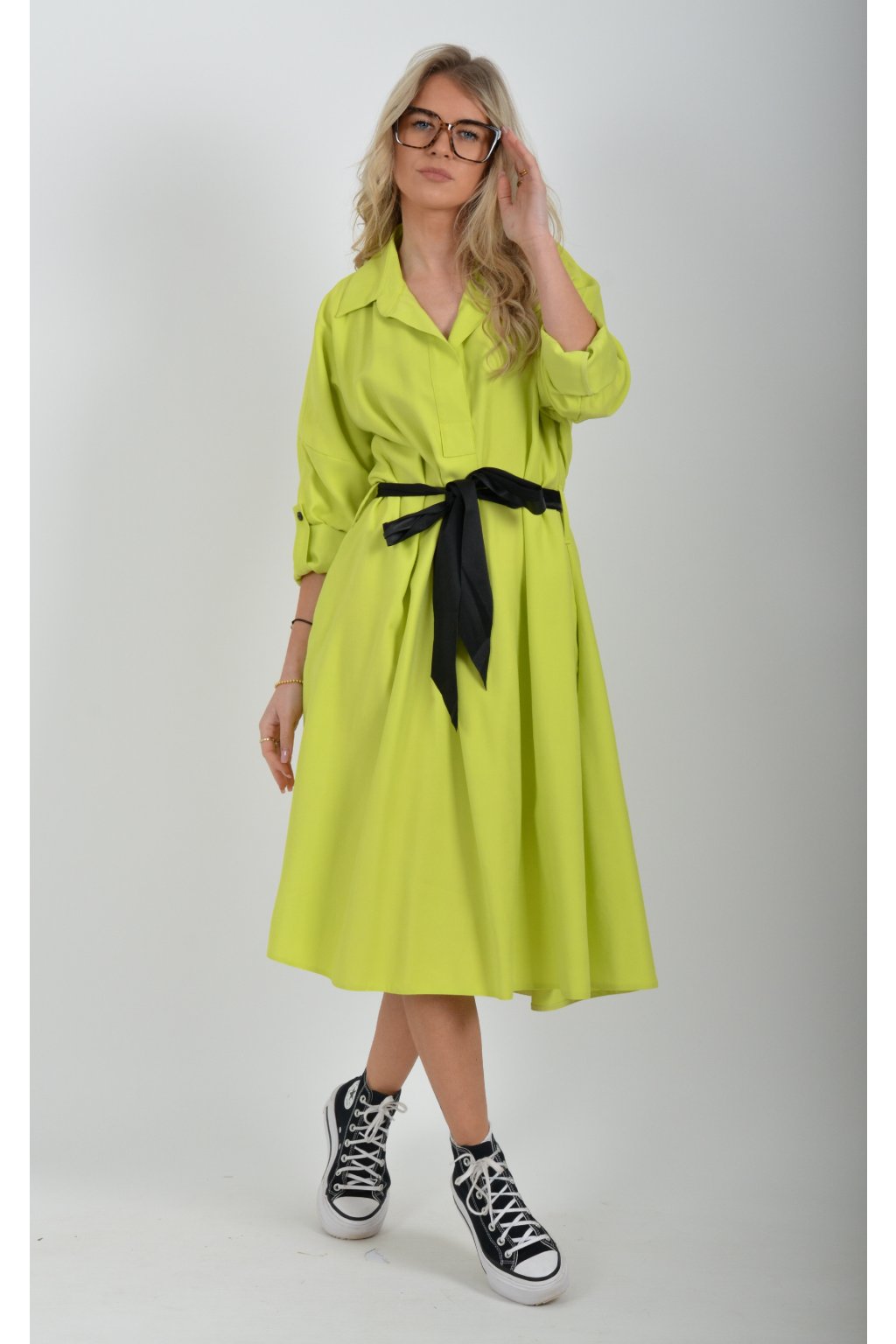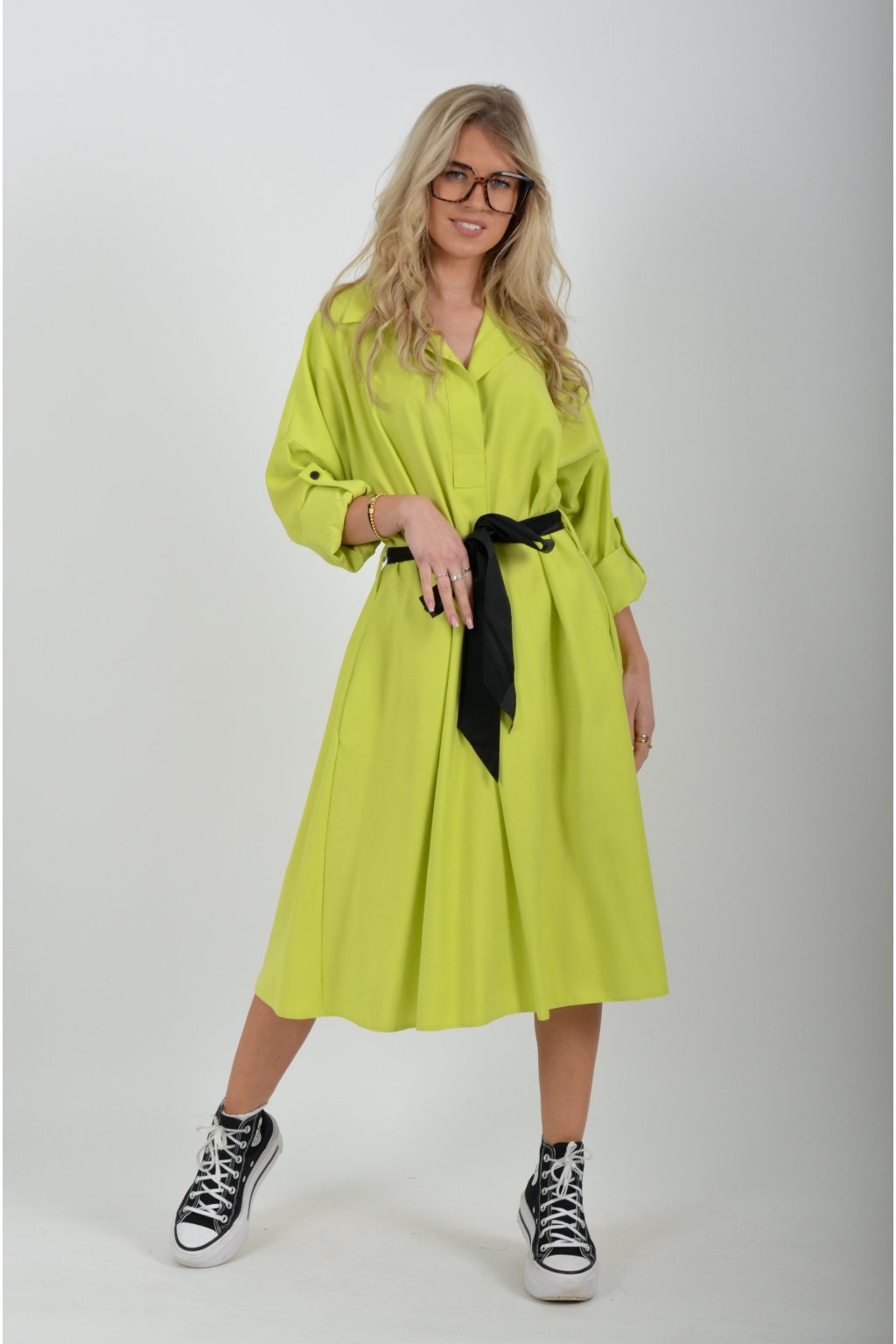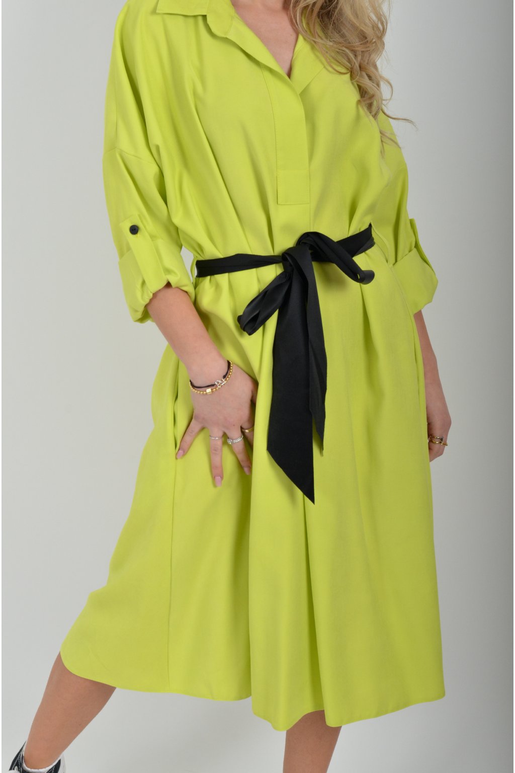Jednou za dámu, jednou jen tak ven, tyto luxusní šaty od značky La Furia splní oboje. Mají košilový áčkový střih s rozevlátou sukní, která je v zadní části mírně delší. Šaty mají na bocích kapsy. Rukávy jsou dlouhé, ale dají se zkrátit na knoflíček. Výrazným doplňkem šatů je pásek s imitací kůže, který můžete jakkoliv vázat a kombinovat. K šatům doporučujeme ozdobnou brož nebo šperky z naší kolekce.