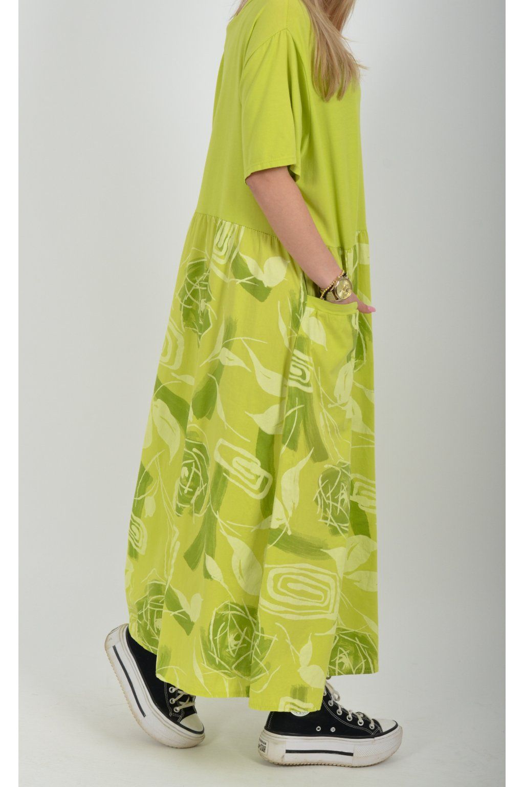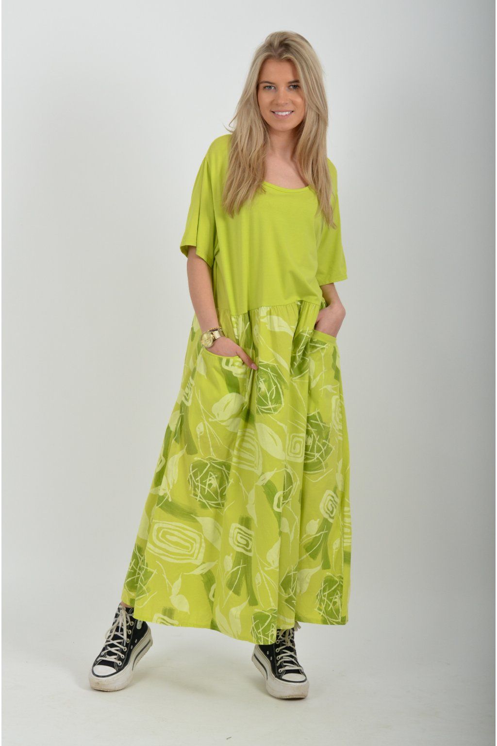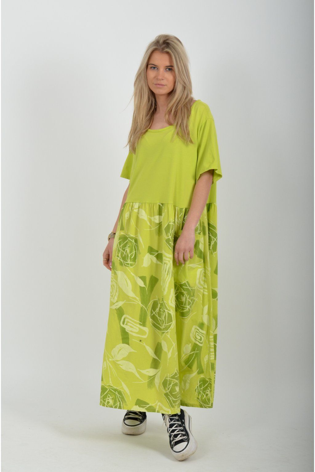 Bavlněné šaty s krátkým rukávem áčkového střihu vyrobené z velice příjemné a jemné bavlny. Šaty mají kapsy na bocích, jsou potištěné a vhodné na každodenní letní nošení. Spodní část šatů je střižen do cípů.