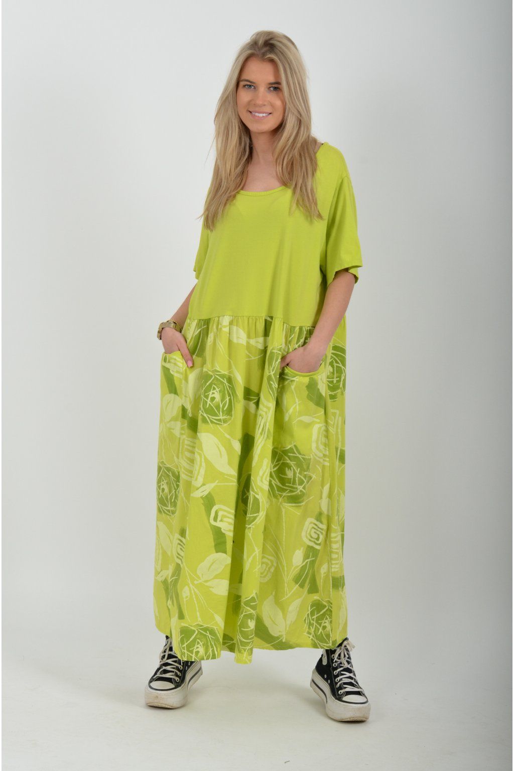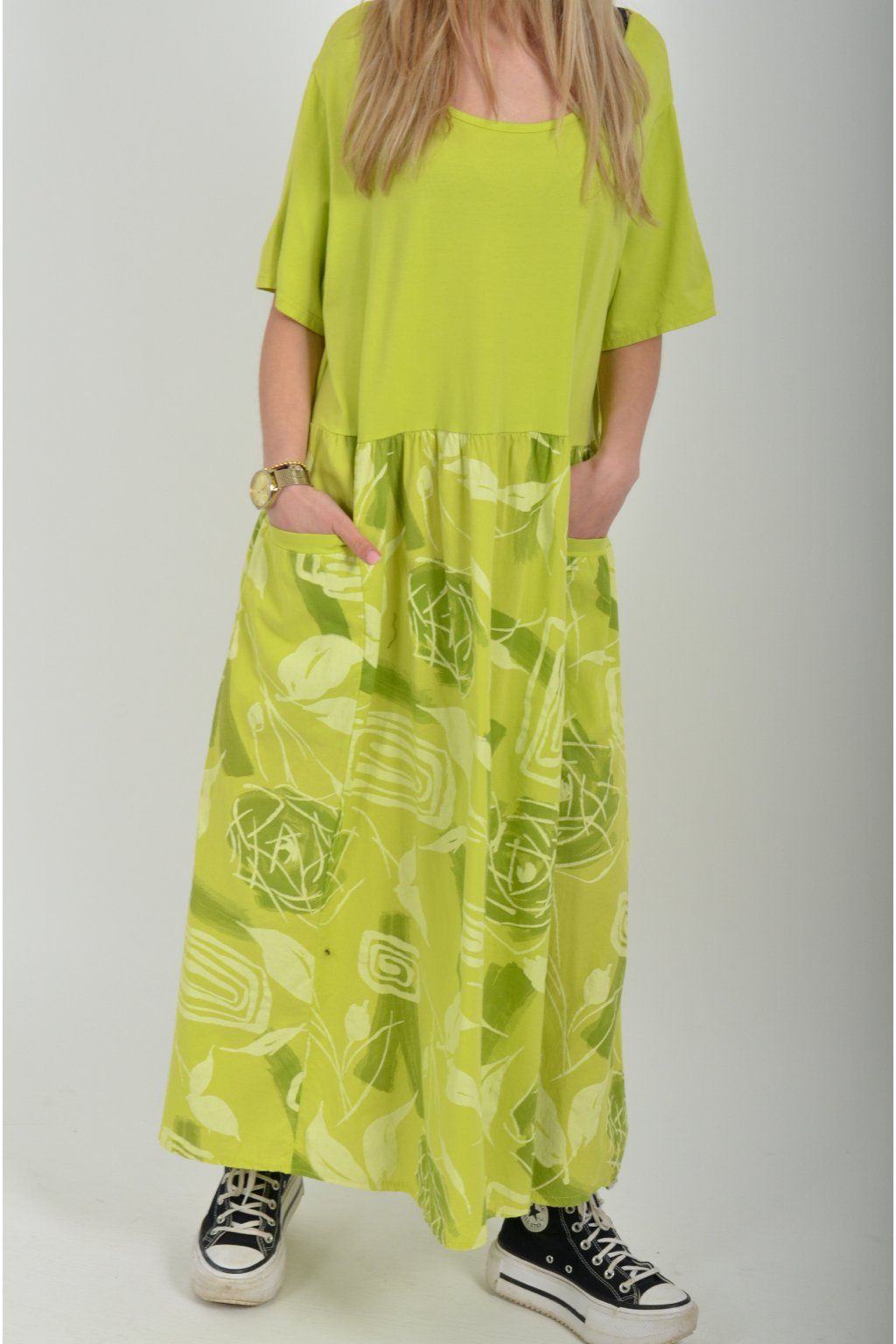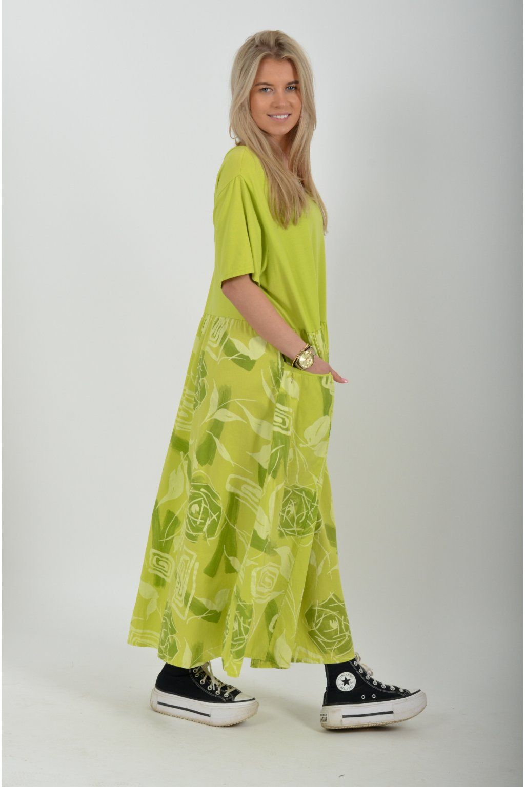 Bavlněné šaty s krátkým rukávem áčkového střihu vyrobené z velice příjemné a jemné bavlny. Šaty mají kapsy na bocích, jsou potištěné a vhodné na každodenní letní nošení. Spodní část šatů je střižen do cípů.
