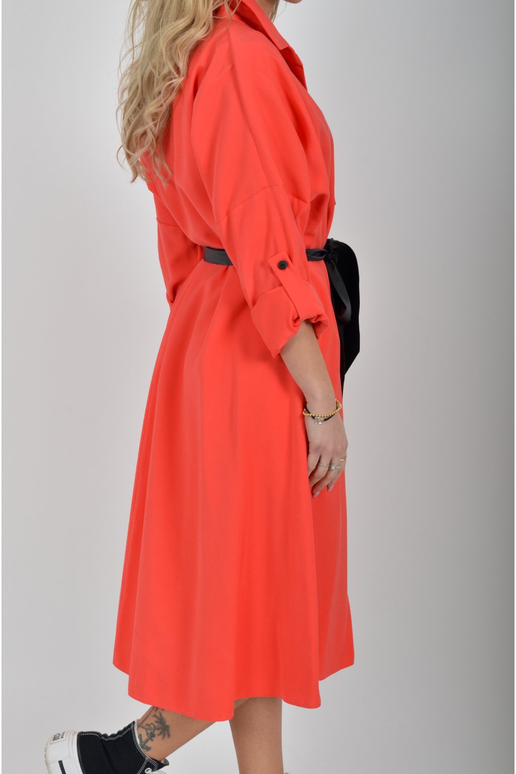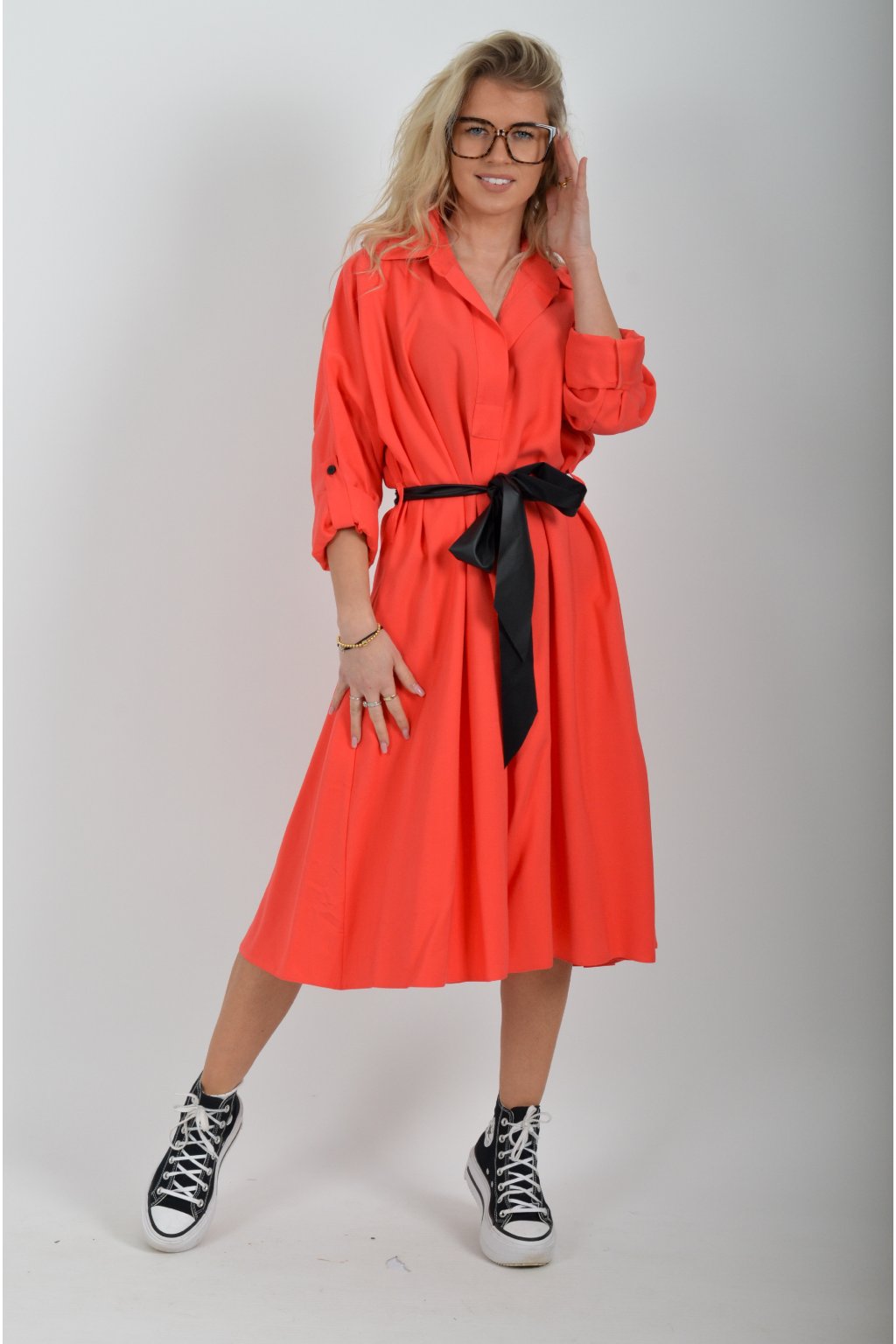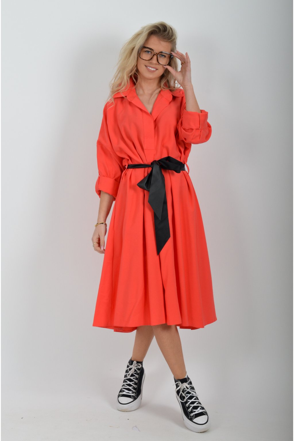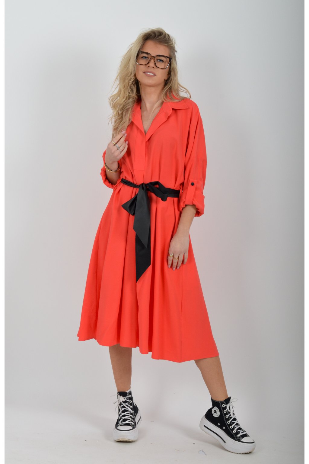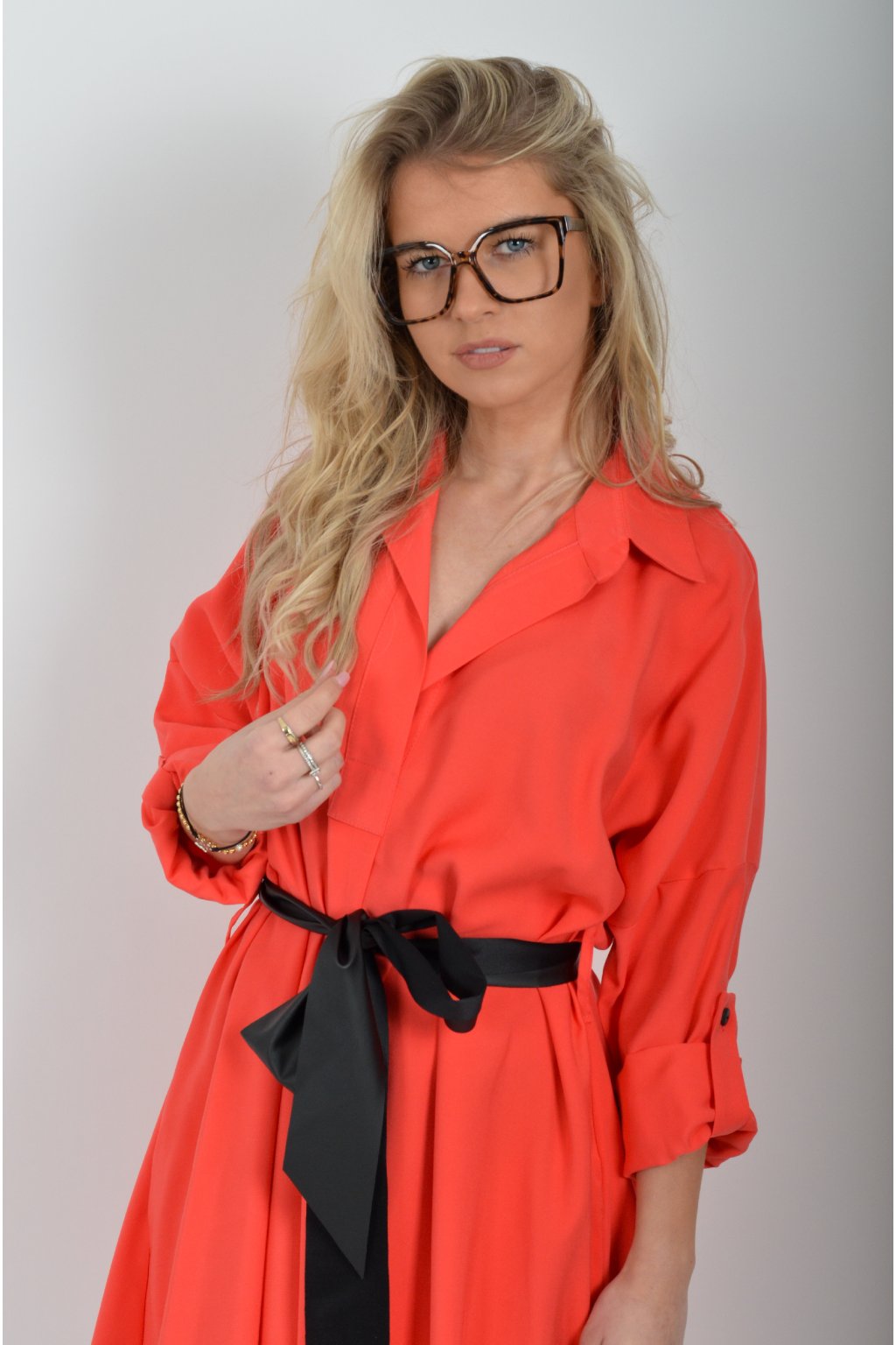 Jednou za dámu, jednou jen tak ven, tyto luxusní šaty od značky La Furia splní oboje. Mají košilový áčkový střih s rozevlátou sukní, která je v zadní části mírně delší. Šaty mají na bocích kapsy. Rukávy jsou dlouhé, ale dají se zkrátit na knoflíček. Výrazným doplňkem šatů je pásek s imitací kůže, který můžete jakkoliv vázat a kombinovat. K šatům doporučujeme ozdobnou brož nebo šperky z naší kolekce.