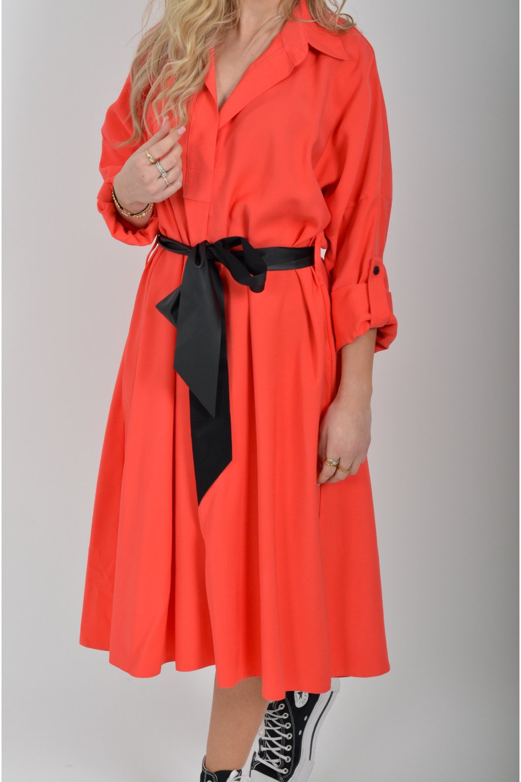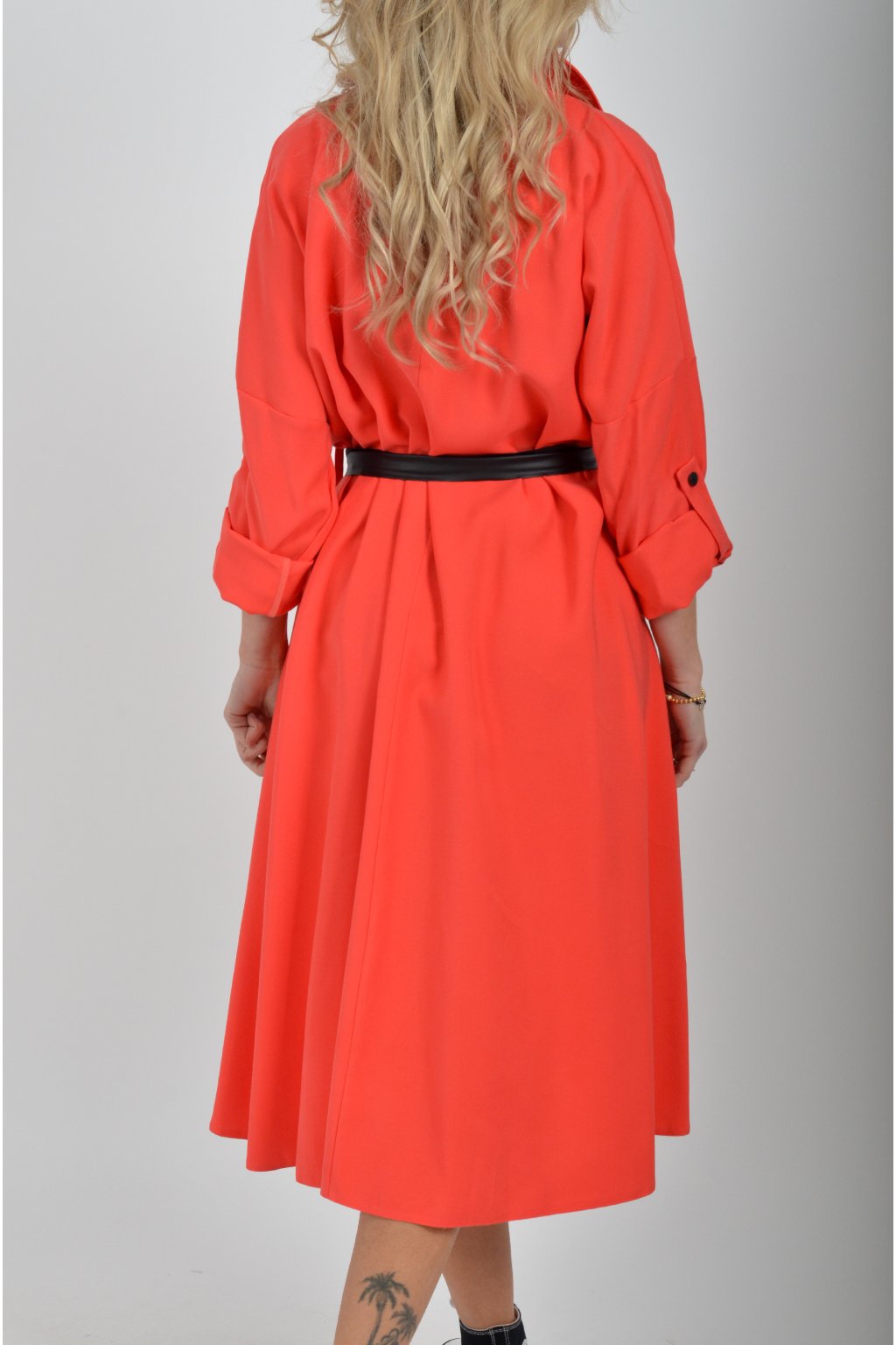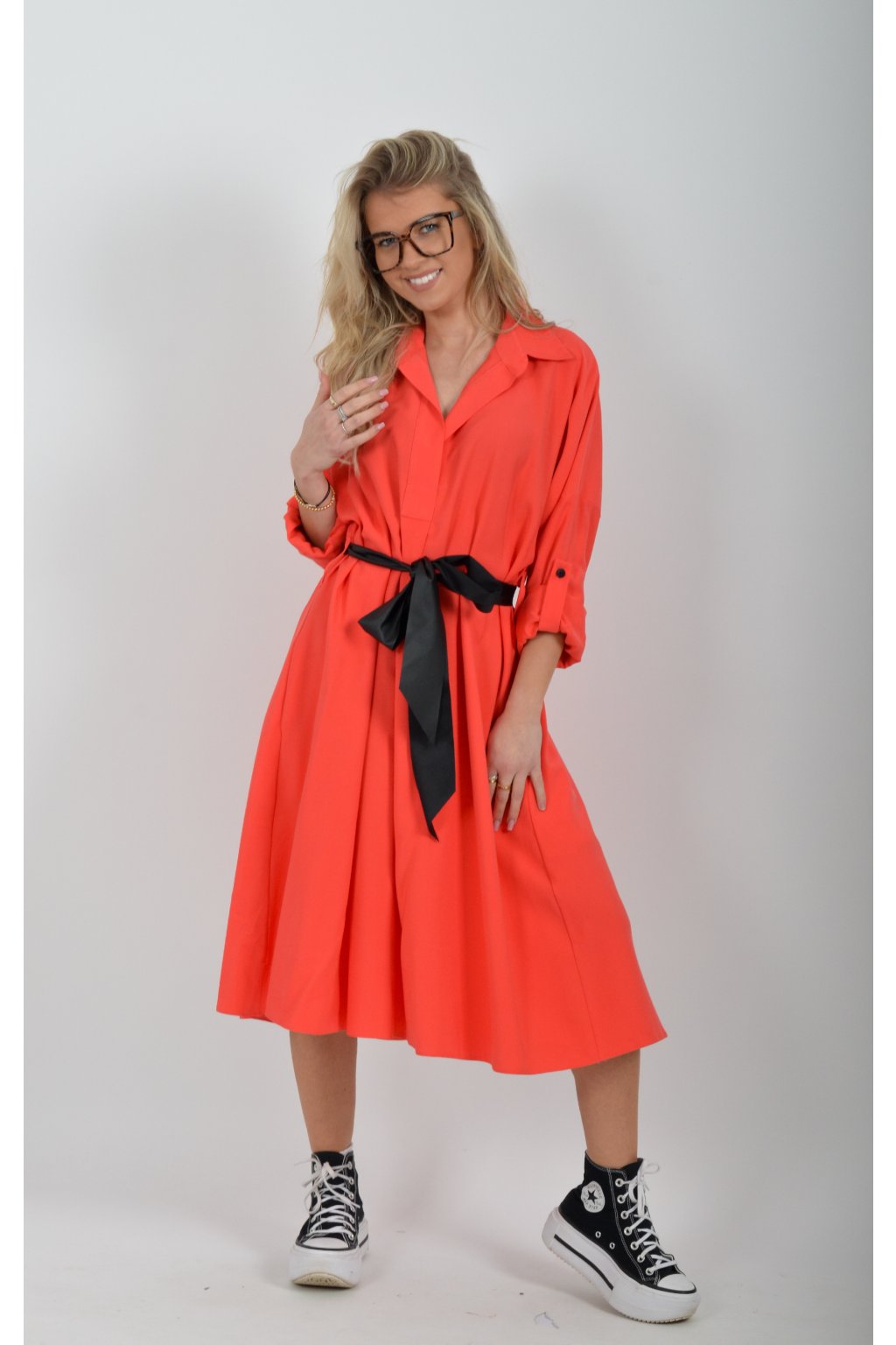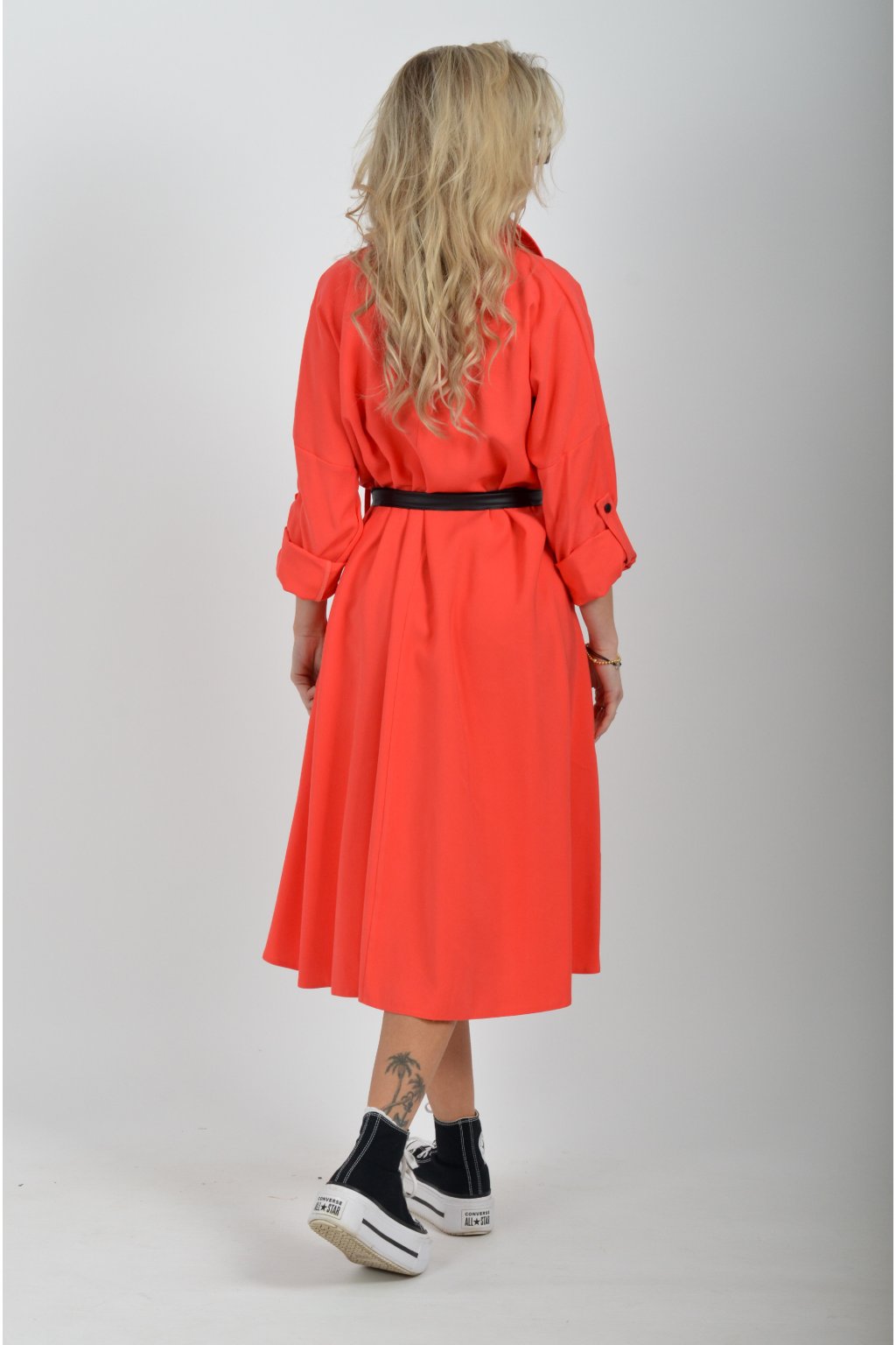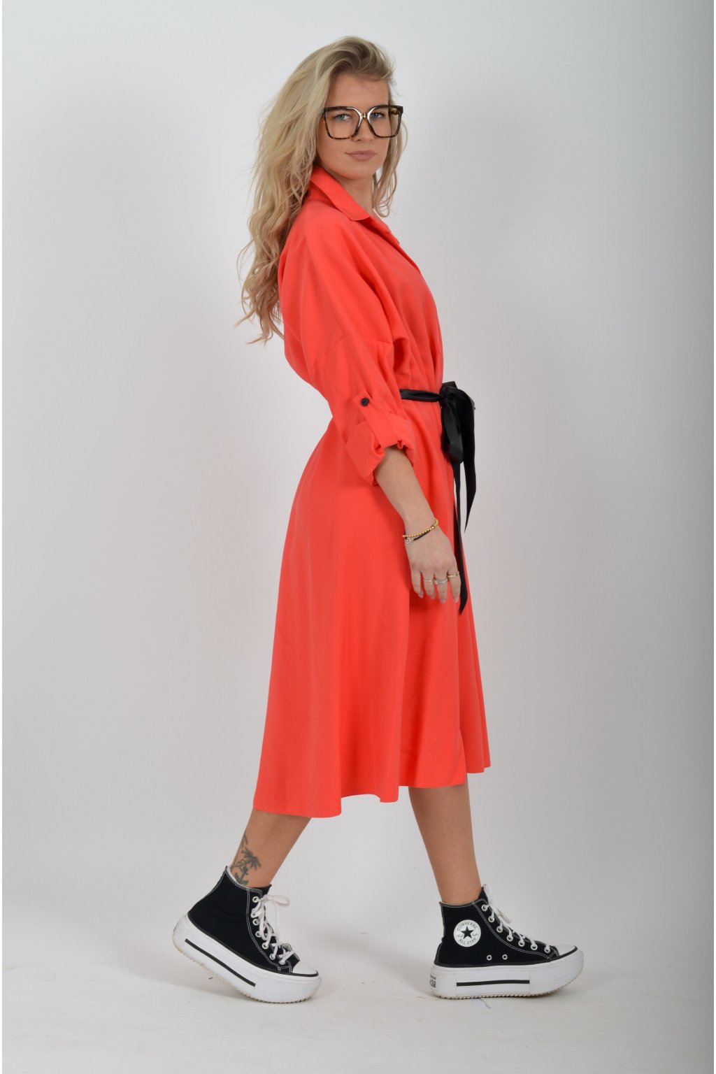 Jednou za dámu, jednou jen tak ven, tyto luxusní šaty od značky La Furia splní oboje. Mají košilový áčkový střih s rozevlátou sukní, která je v zadní části mírně delší. Šaty mají na bocích kapsy. Rukávy jsou dlouhé, ale dají se zkrátit na knoflíček. Výrazným doplňkem šatů je pásek s imitací kůže, který můžete jakkoliv vázat a kombinovat. K šatům doporučujeme ozdobnou brož nebo šperky z naší kolekce.