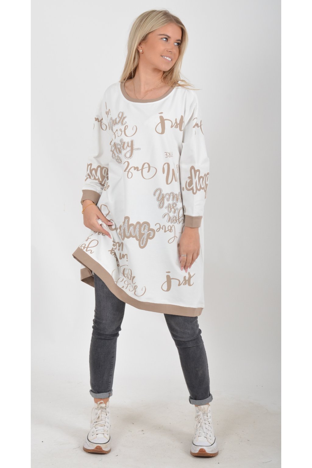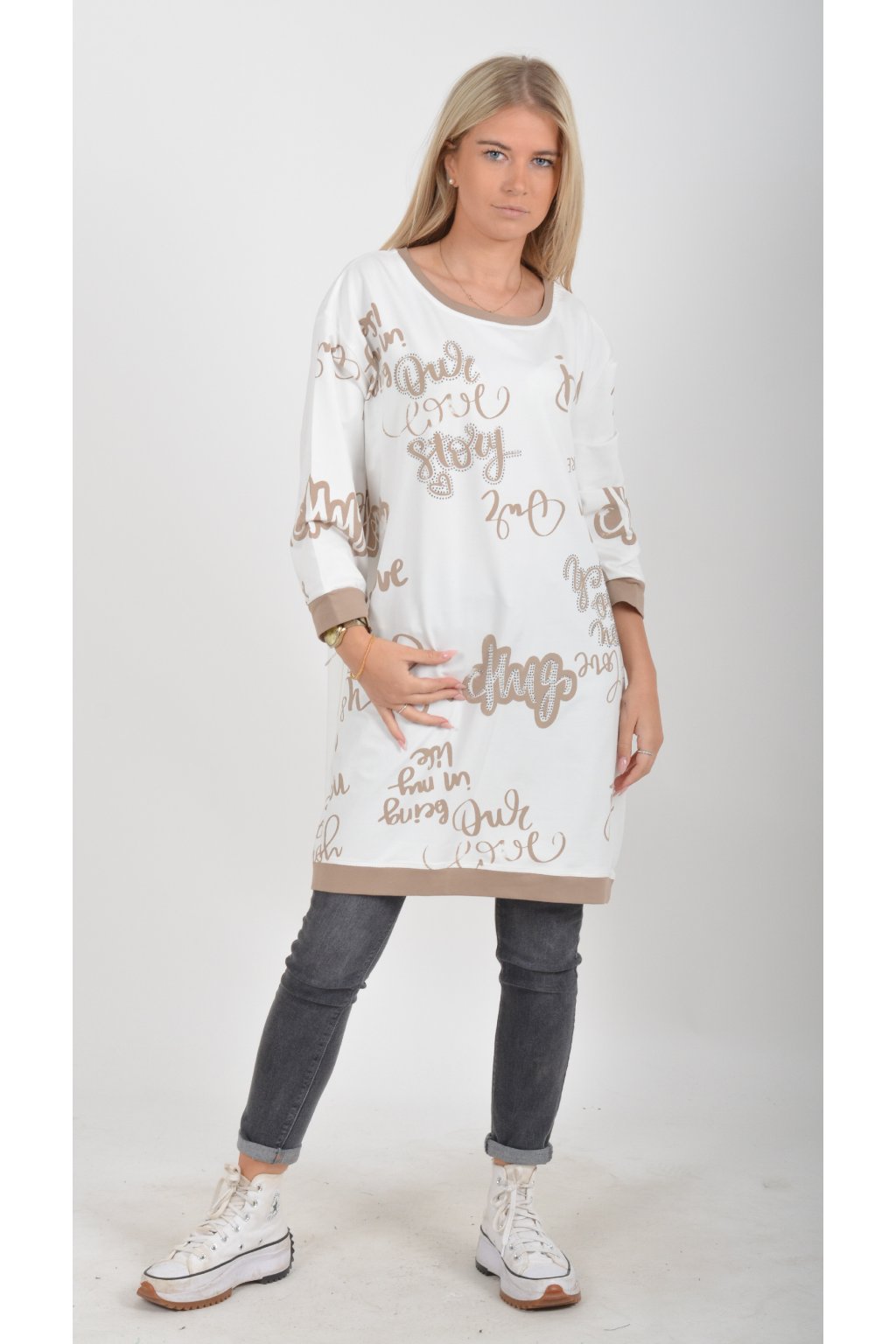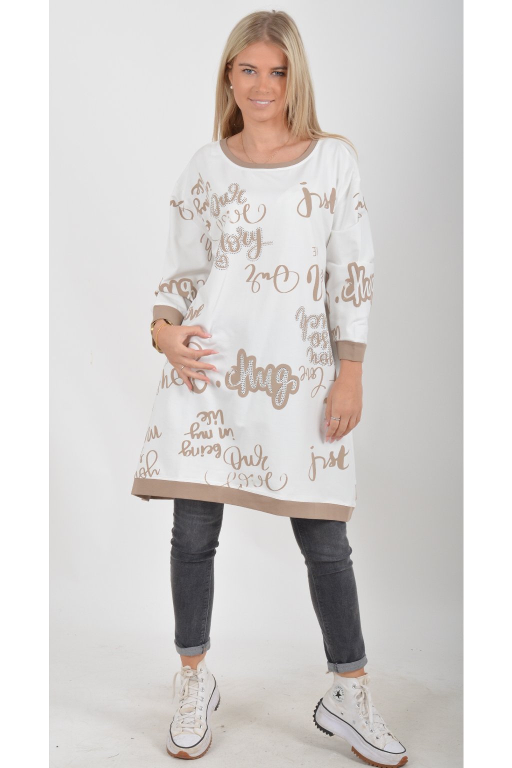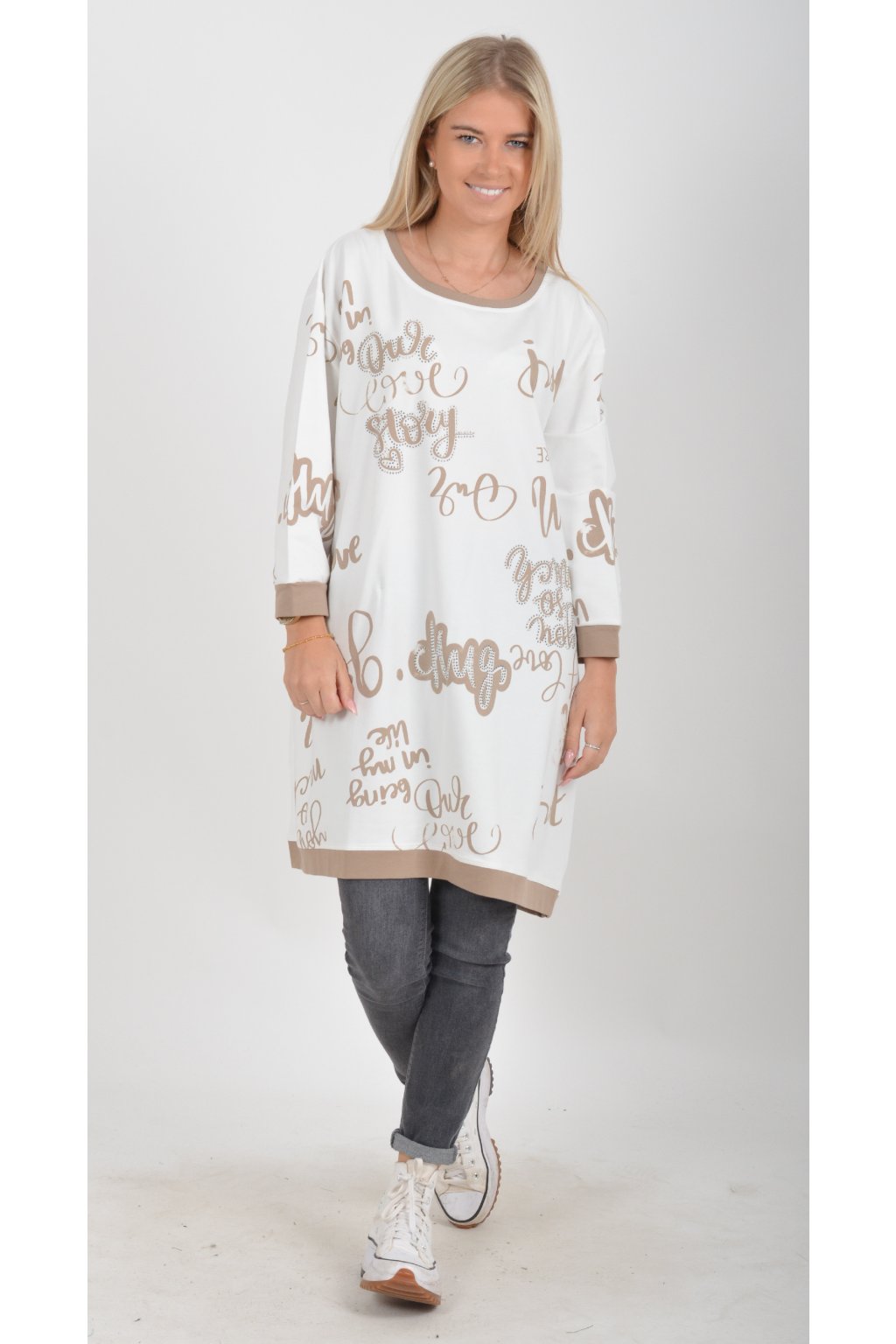 Mikinová tunika áčkového střihu s tříčtvtečním rukávem. Je vyrobená z velice příjemné a kvalitní turecké bavlny. Tunika je potištěná a lehce zdobená černými kamínky. Je vhodná pro nošení jak džínům, tak i k legínám.