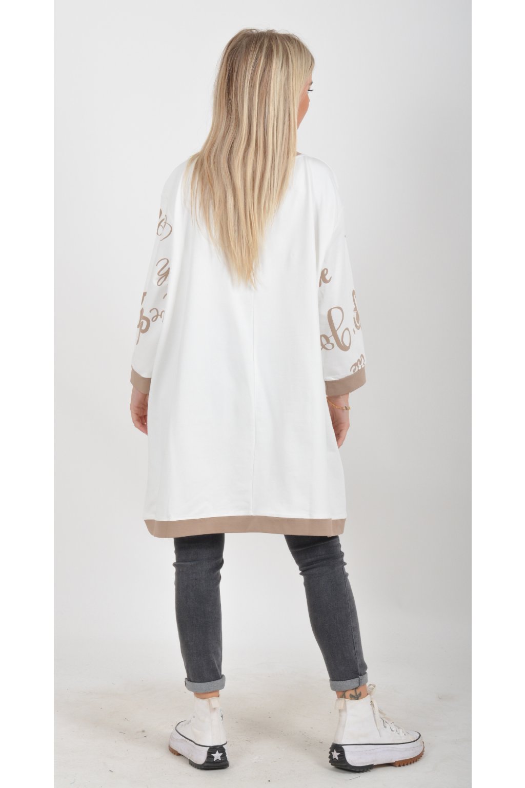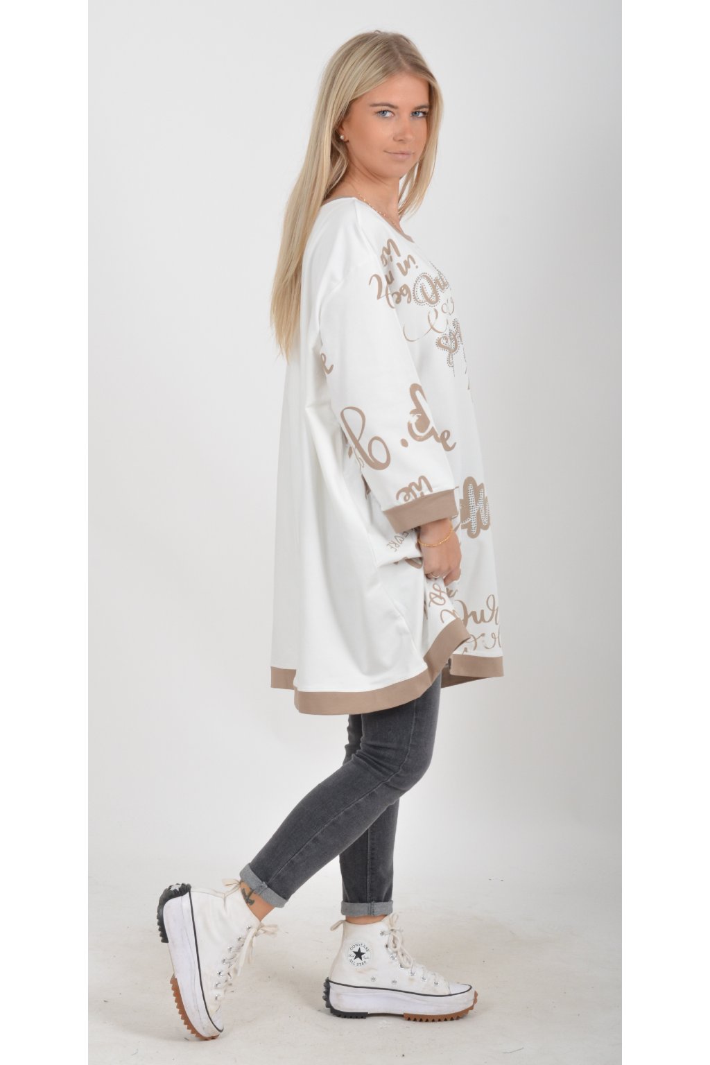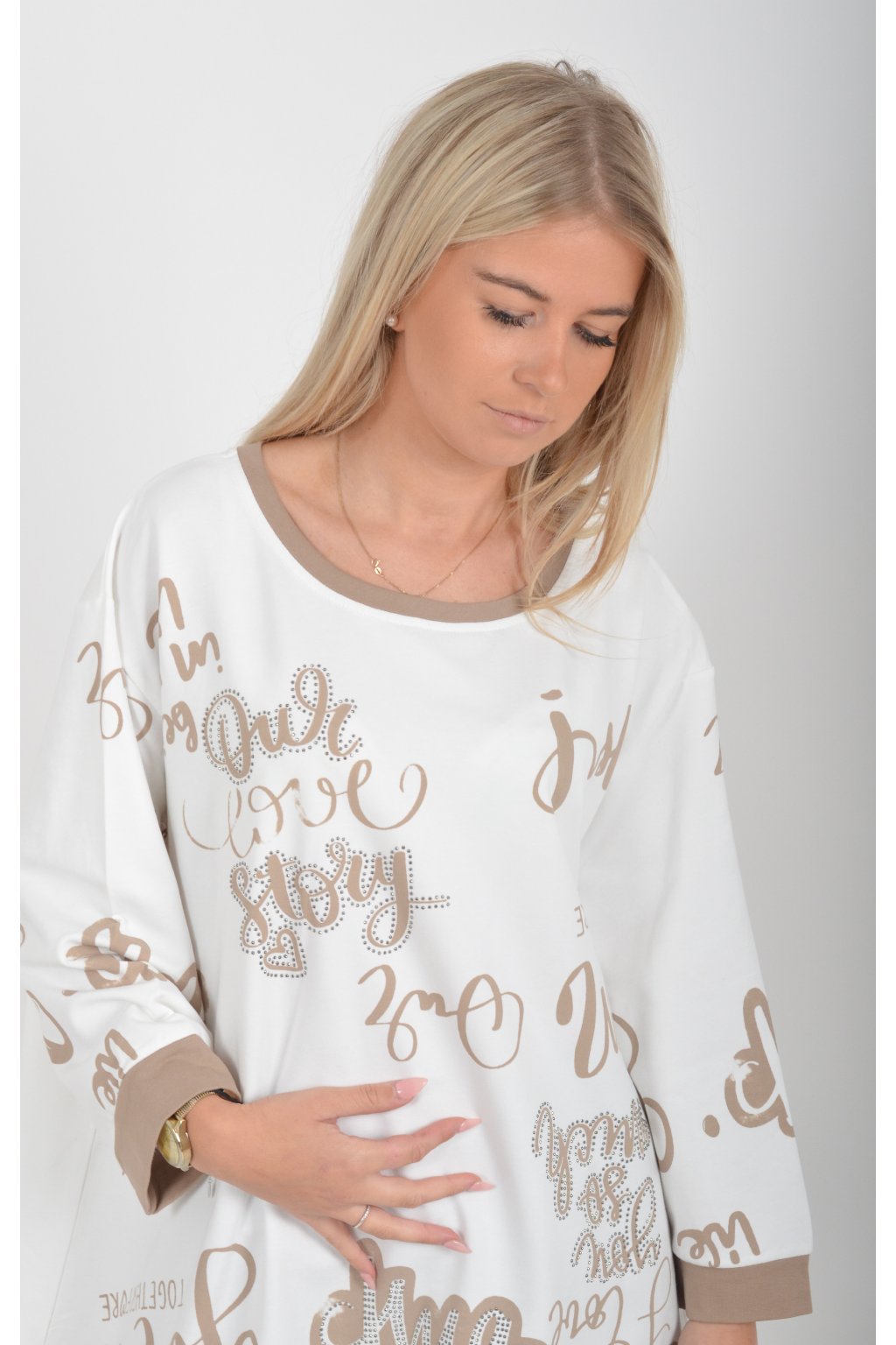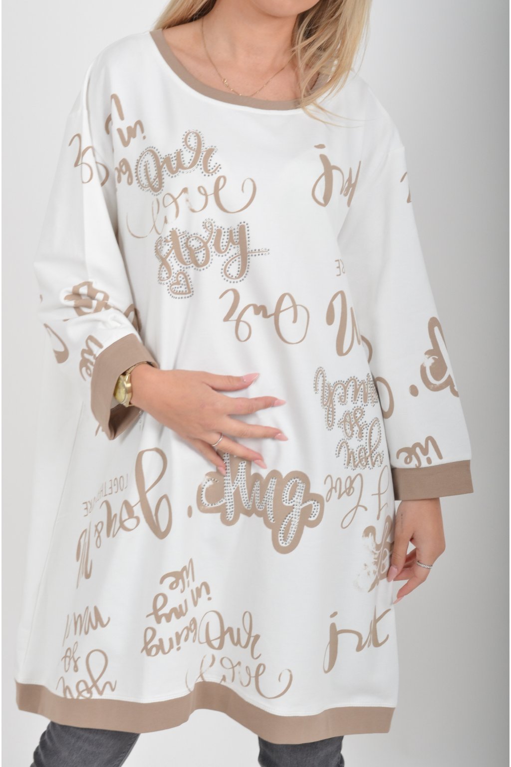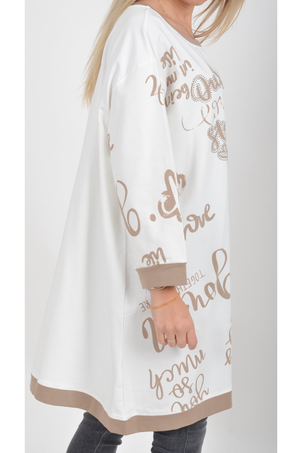 Mikinová tunika áčkového střihu s tříčtvtečním rukávem. Je vyrobená z velice příjemné a kvalitní turecké bavlny. Tunika je potištěná a lehce zdobená černými kamínky. Je vhodná pro nošení jak džínům, tak i k legínám.