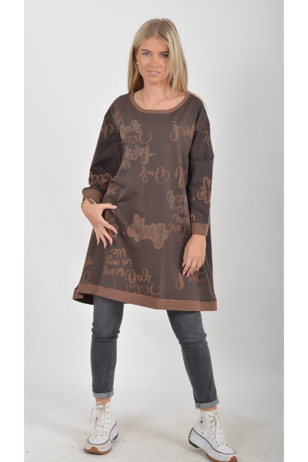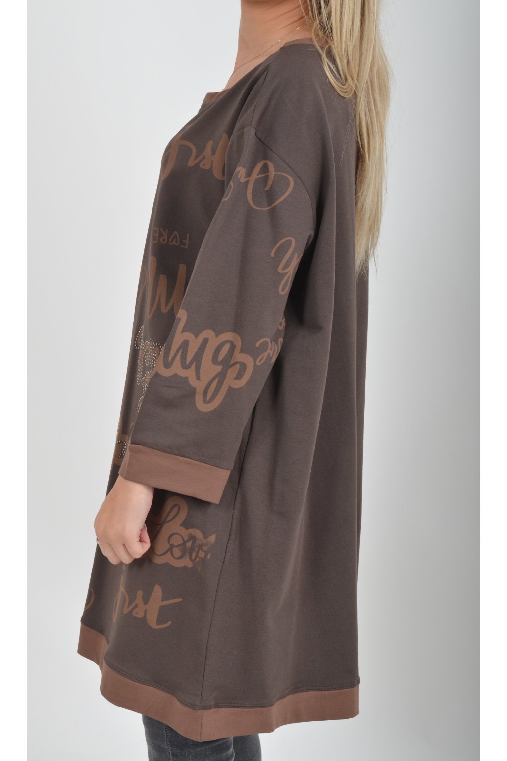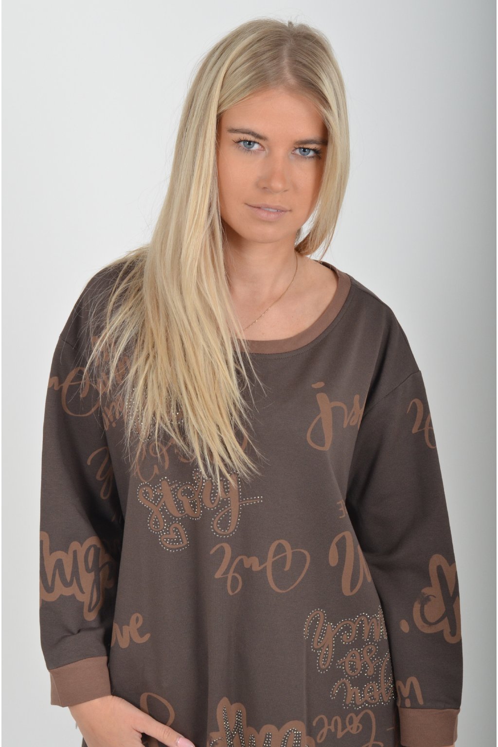 Mikinová tunika áčkového střihu s tříčtvtečním rukávem. Je vyrobená z velice příjemné a kvalitní turecké bavlny. Tunika je potištěná a lehce zdobená černými kamínky. Je vhodná pro nošení jak džínům, tak i k legínám.