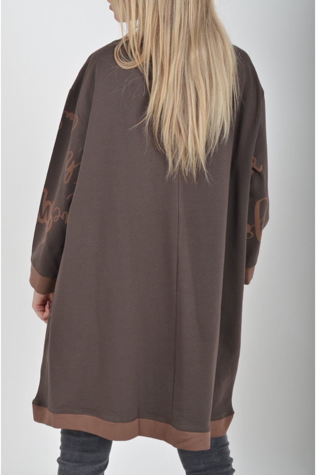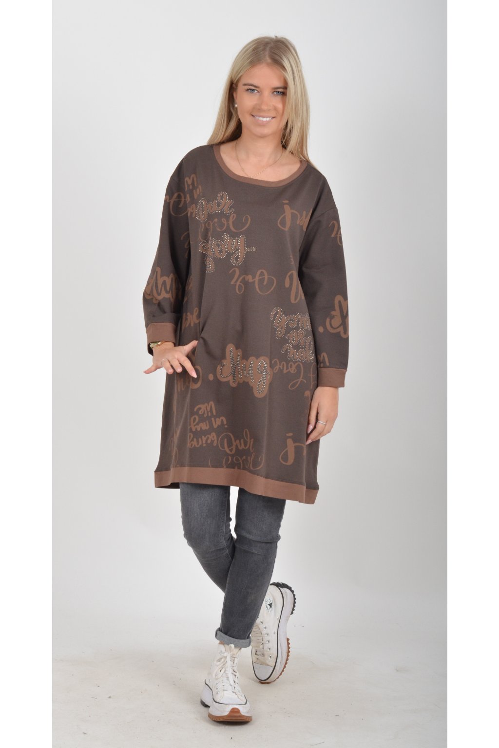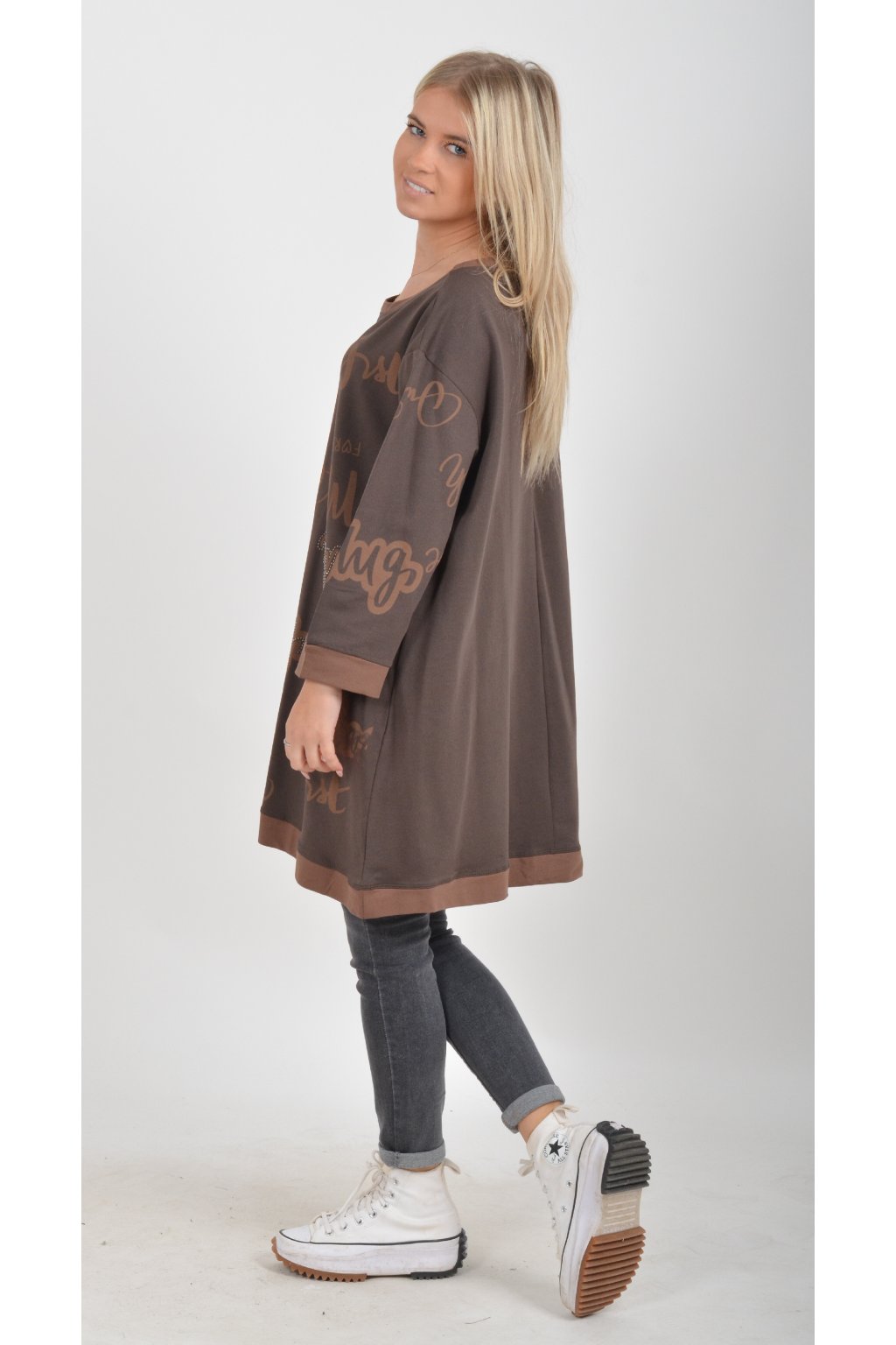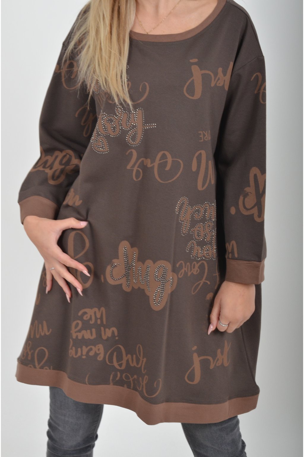 Mikinová tunika áčkového střihu s tříčtvtečním rukávem. Je vyrobená z velice příjemné a kvalitní turecké bavlny. Tunika je potištěná a lehce zdobená černými kamínky. Je vhodná pro nošení jak džínům, tak i k legínám.