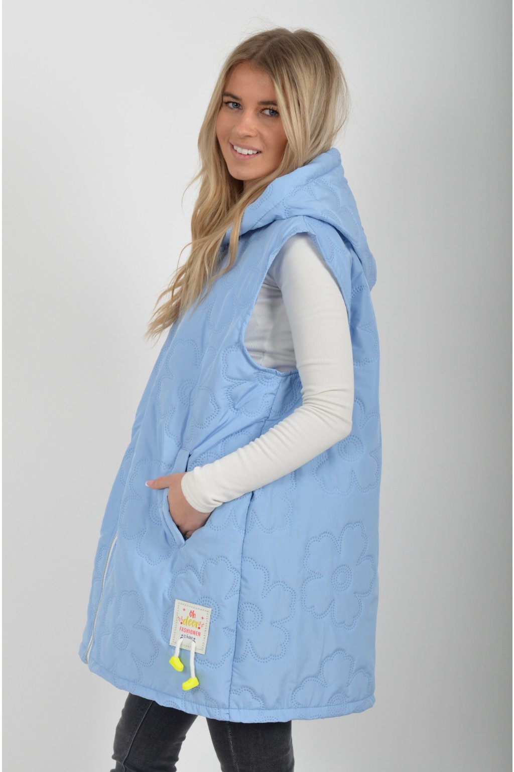 Prošívaná přechodová vesta rovného střihu s kapucí. Materiál vesty je z odlehčeného materiálu. Vesta nemá kapsy.