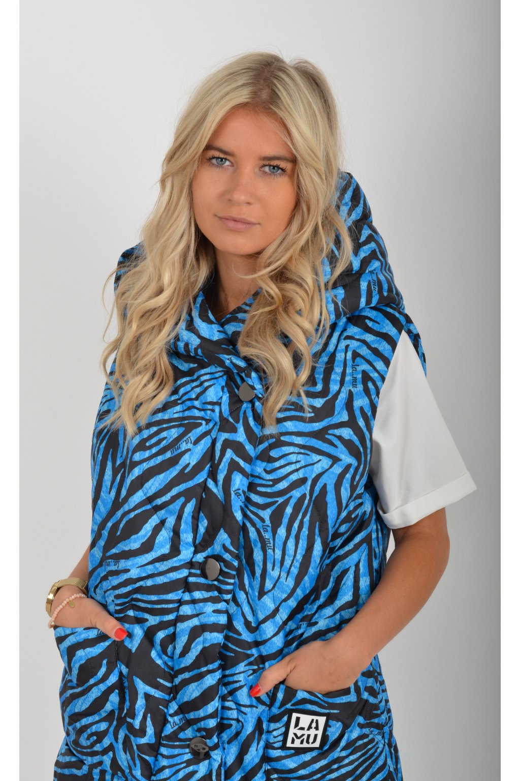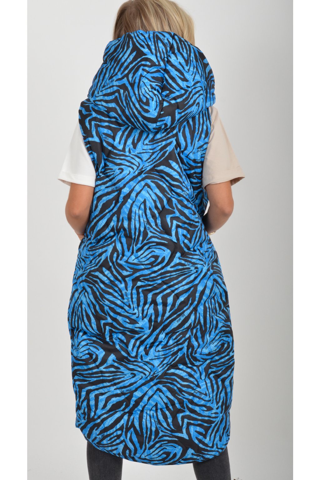 Dlouhá prošívaná vesta na zip s kapucí, podšívkou a kapsami v předu. Je z příjemného a měkkého materiálu. Přes zip je klopa na patenty.