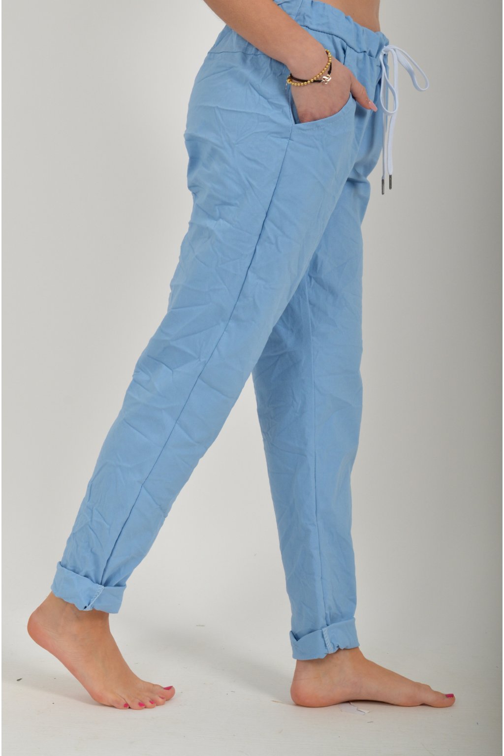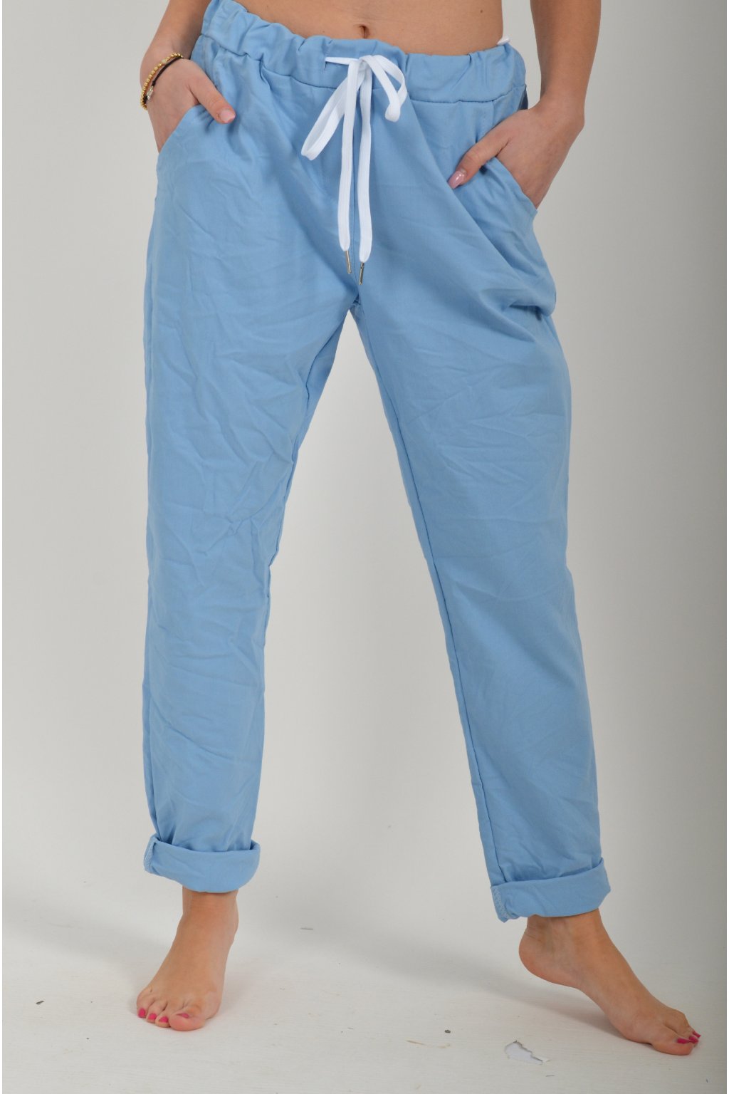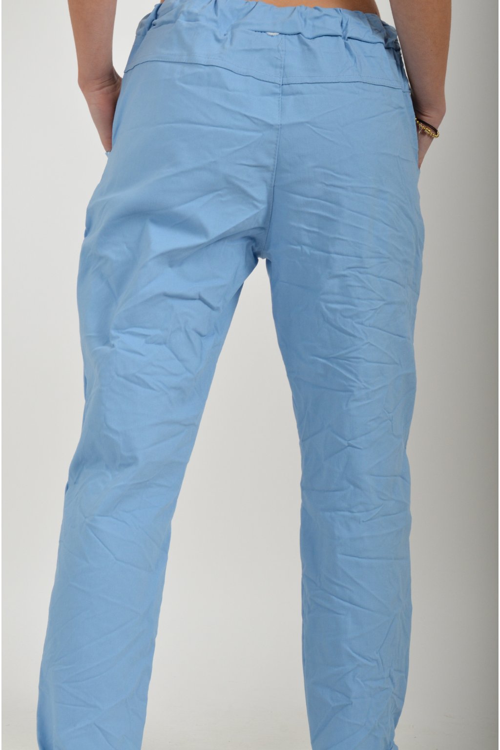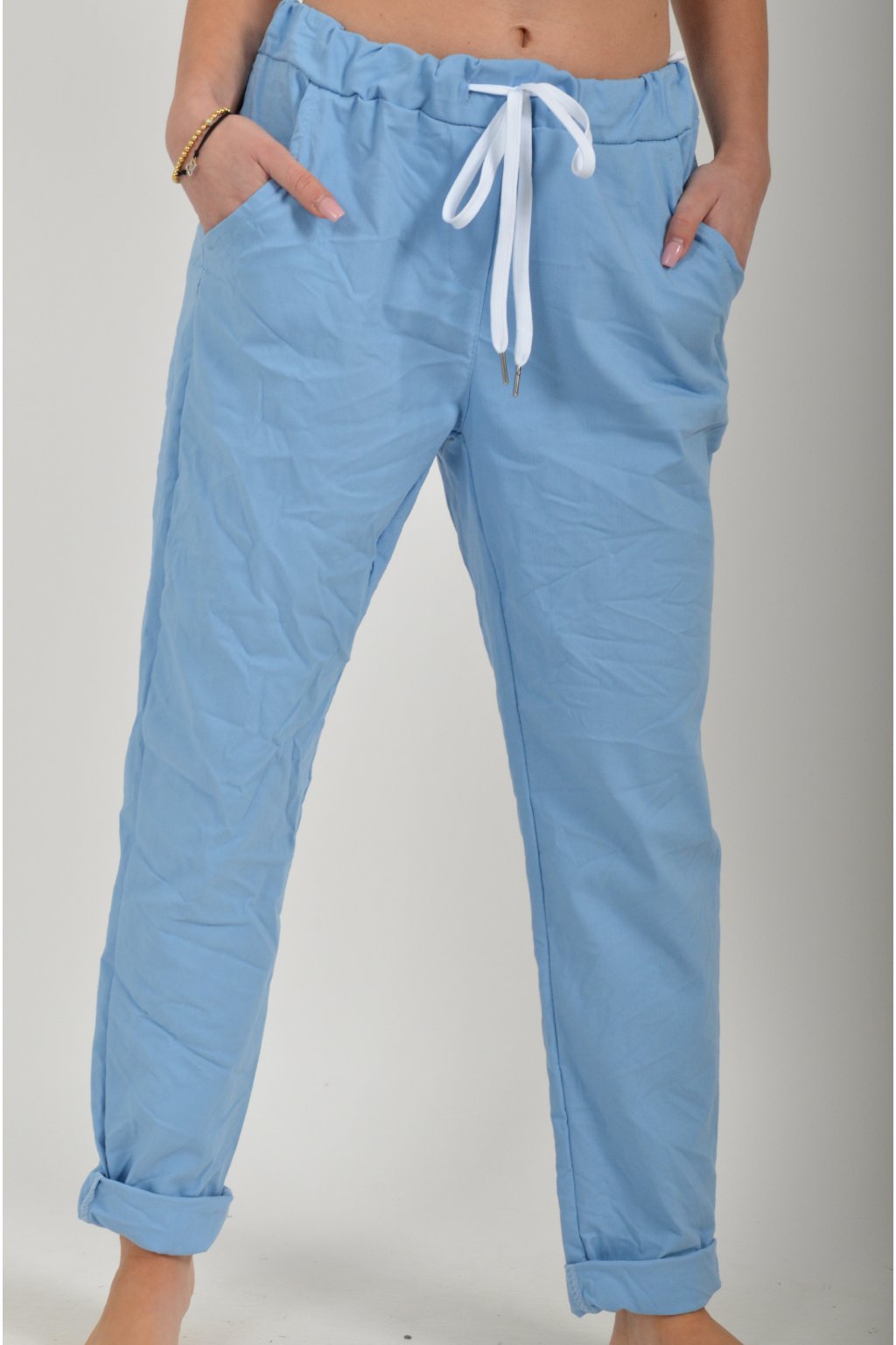 Jednobarevné kalhoty s kapsami na bocích, které se krásně přizpůsobí postavě, díky podílu elastanu. Jsou vhodné pro každodenní nošení. V pase je zapracovaná guma a tkanička pro libovolné stažení.