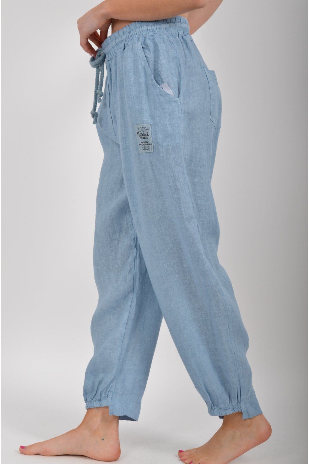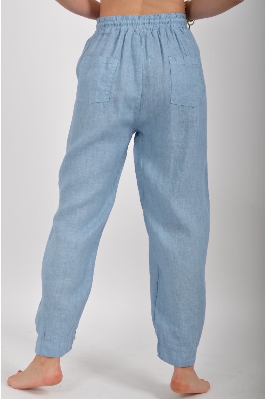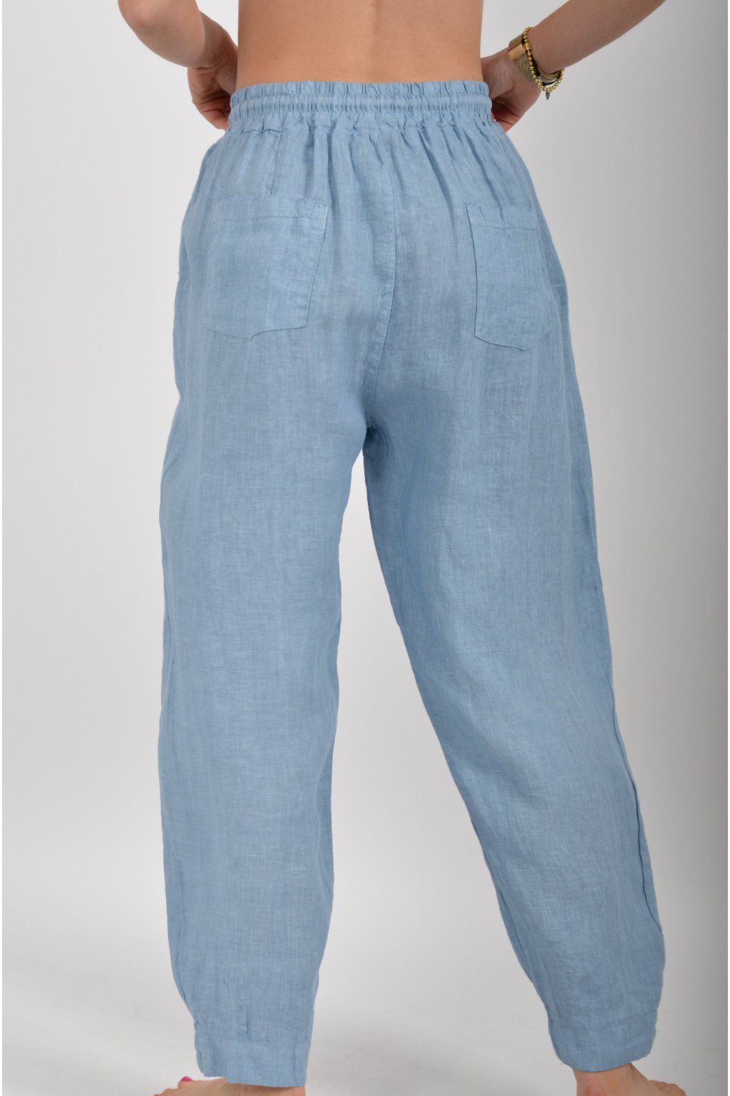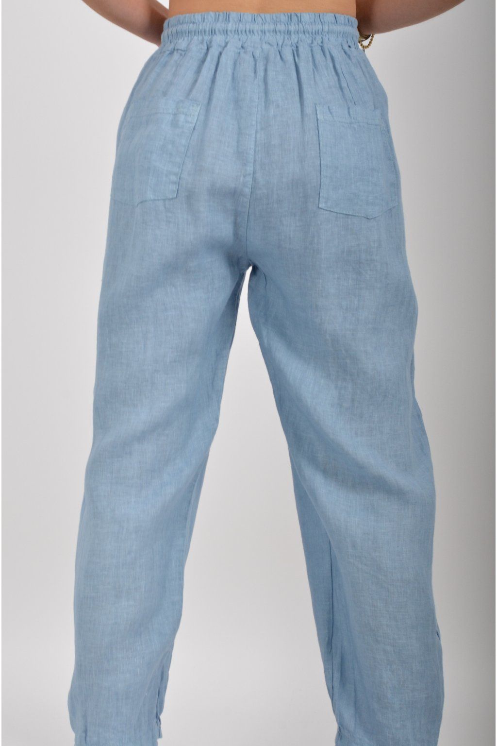 Lněné kalhoty s kapsami na bocích. Jsou vhodné pro každodenní nošení. V pase je zapracovaná guma a tkanice pro libovolné stažení.