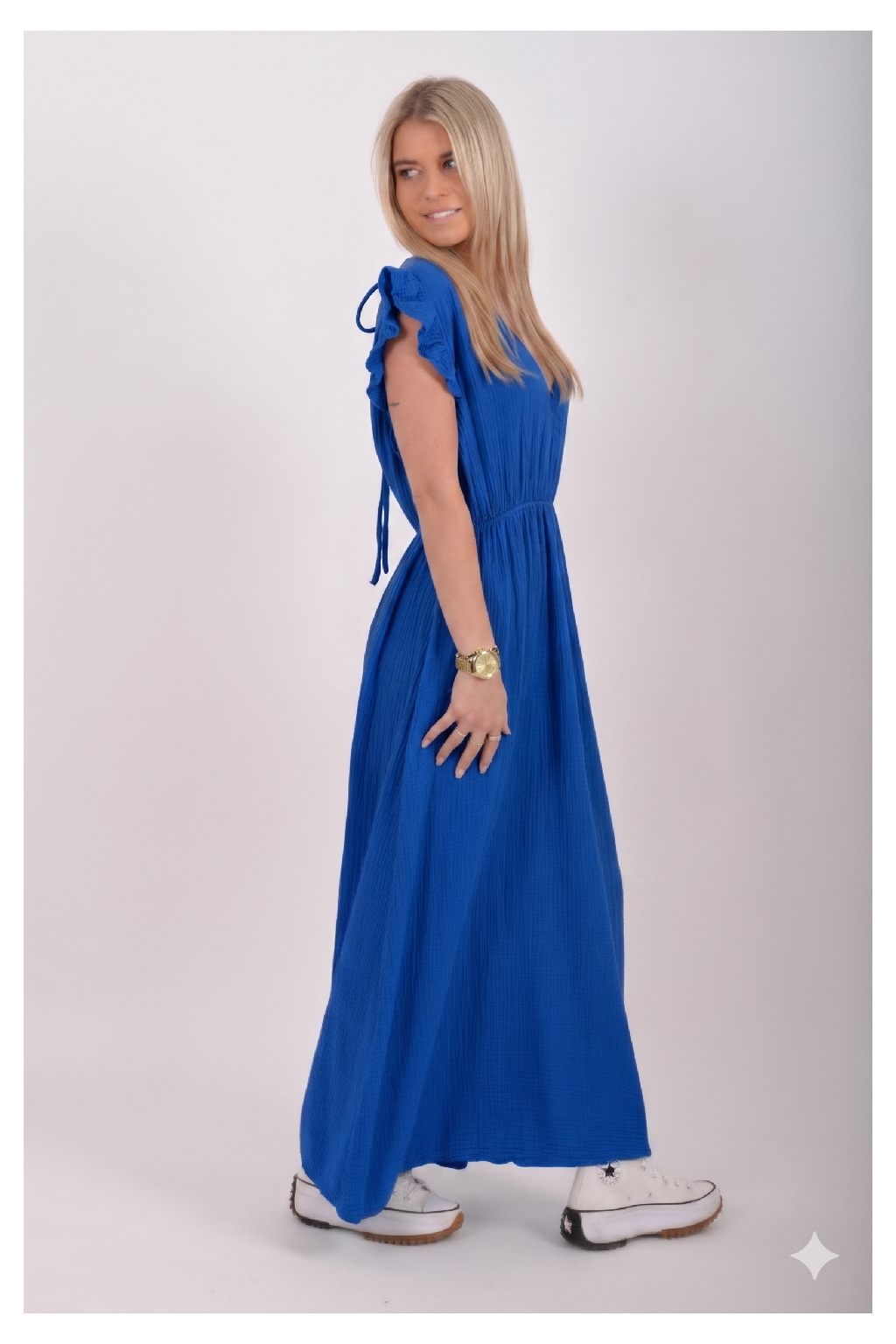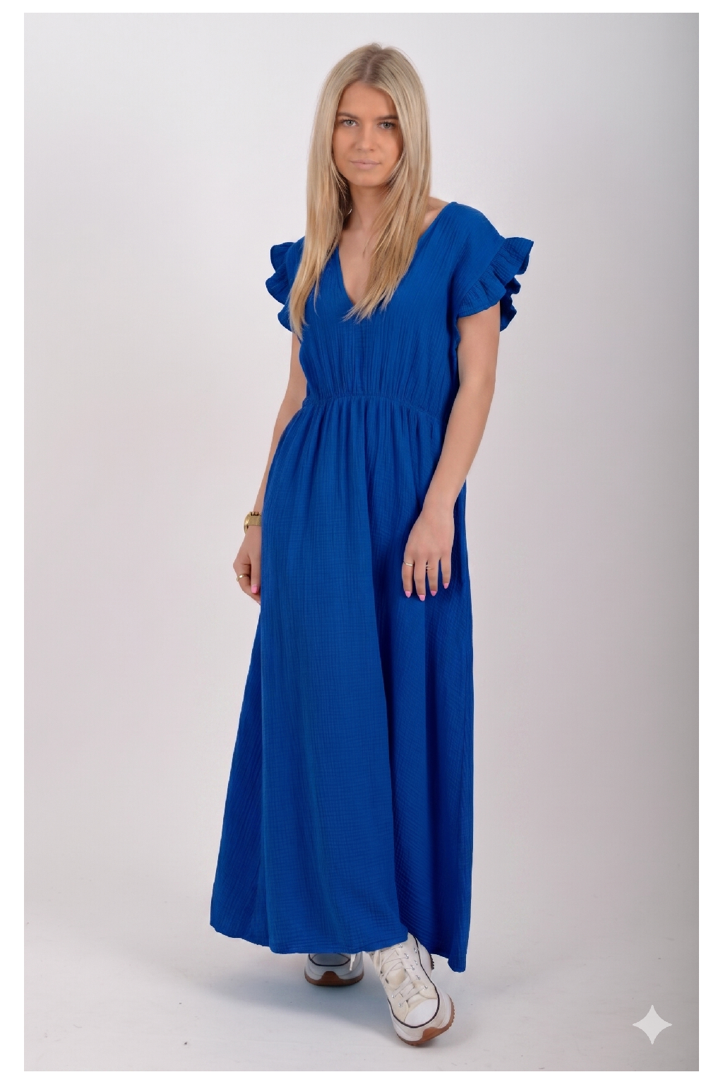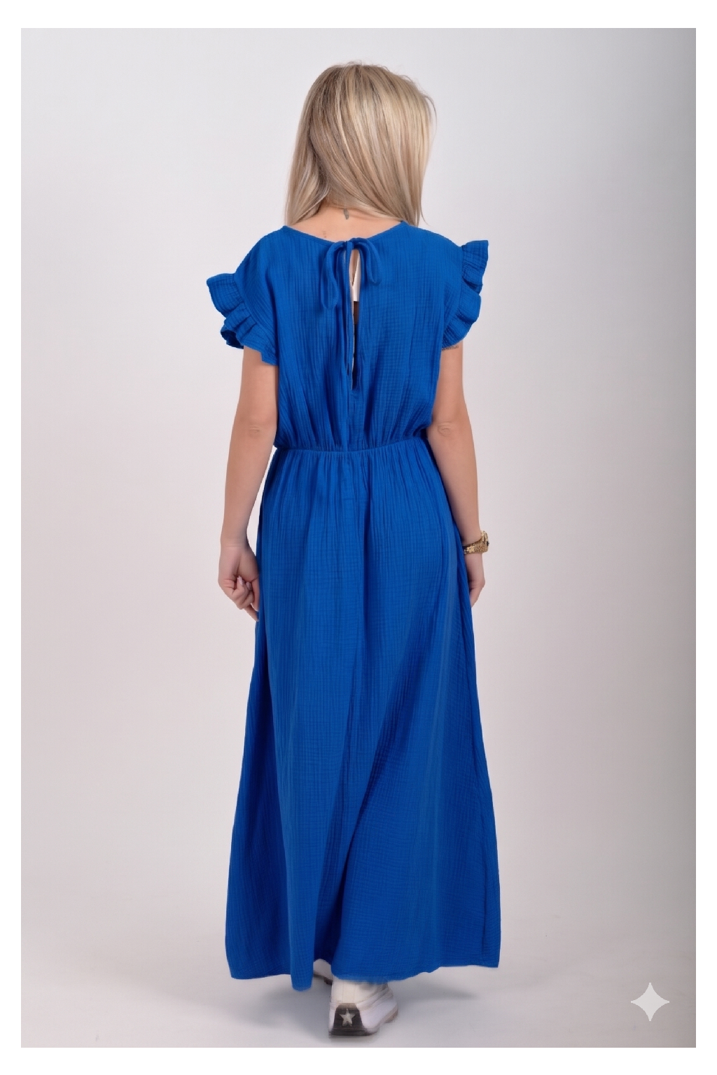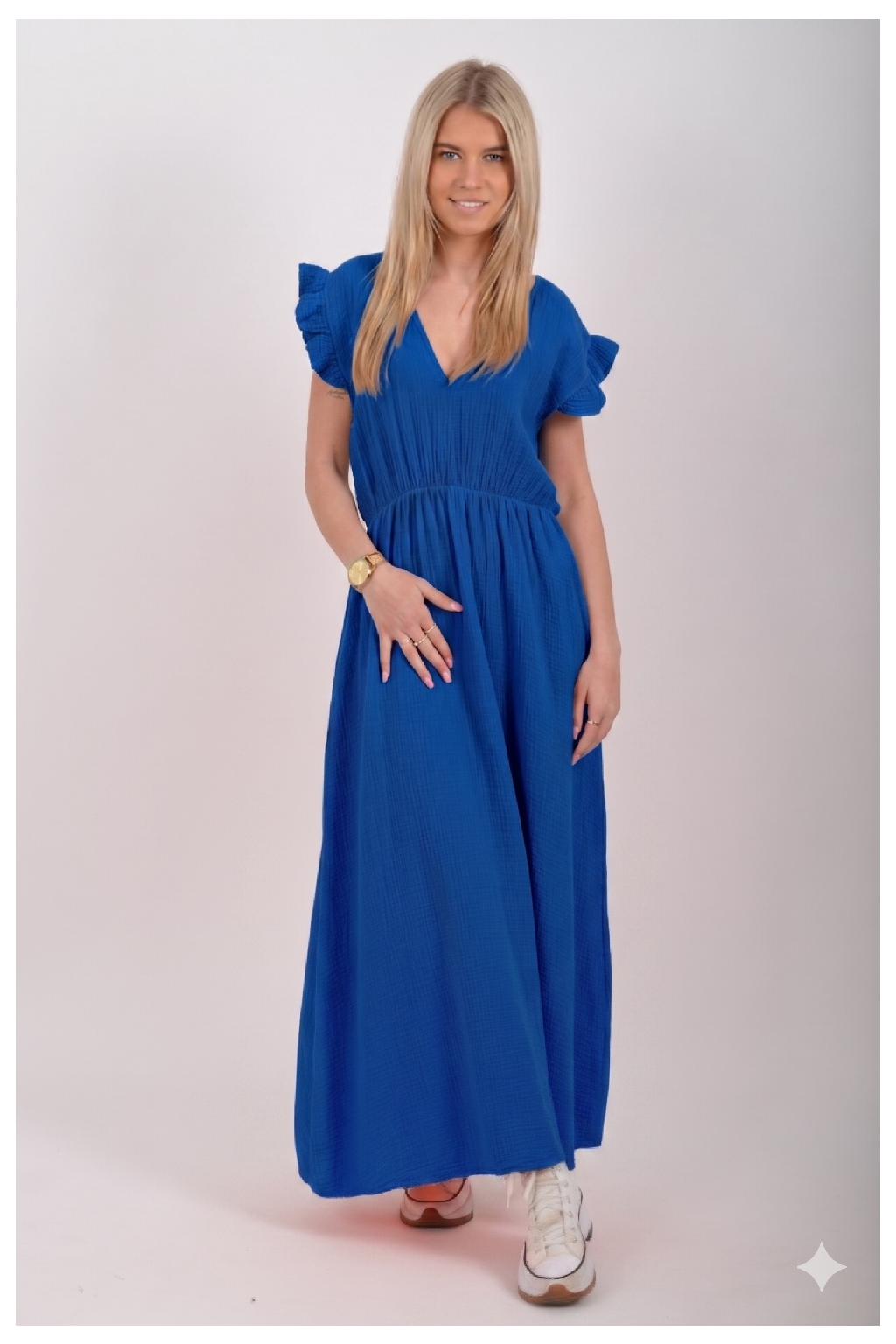 Maxi šaty vyrobené z velice příjemného mušelínu. Šaty mají áčkový střih, jsou střižené pod prsy, kde je také zapracovaná guma. V zadní části u krku mají vázání na tkaničku. Šaty krátký rukáv s volánkem.