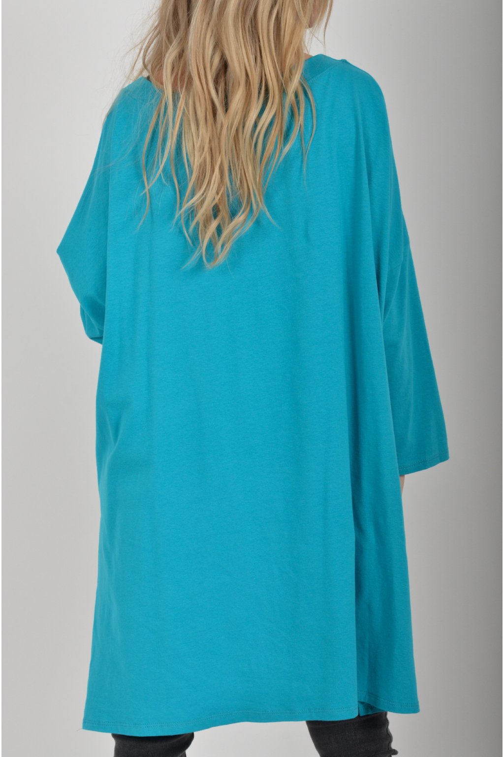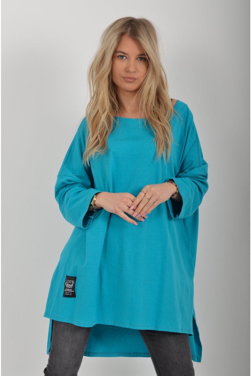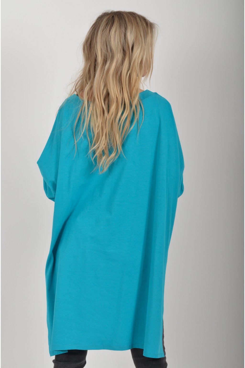Jednobarevné oversize tričko s 3/4rukávem vyrobené z velice lehké, měkké a příjemné bavlny. Zadní část trička je delší než přední.