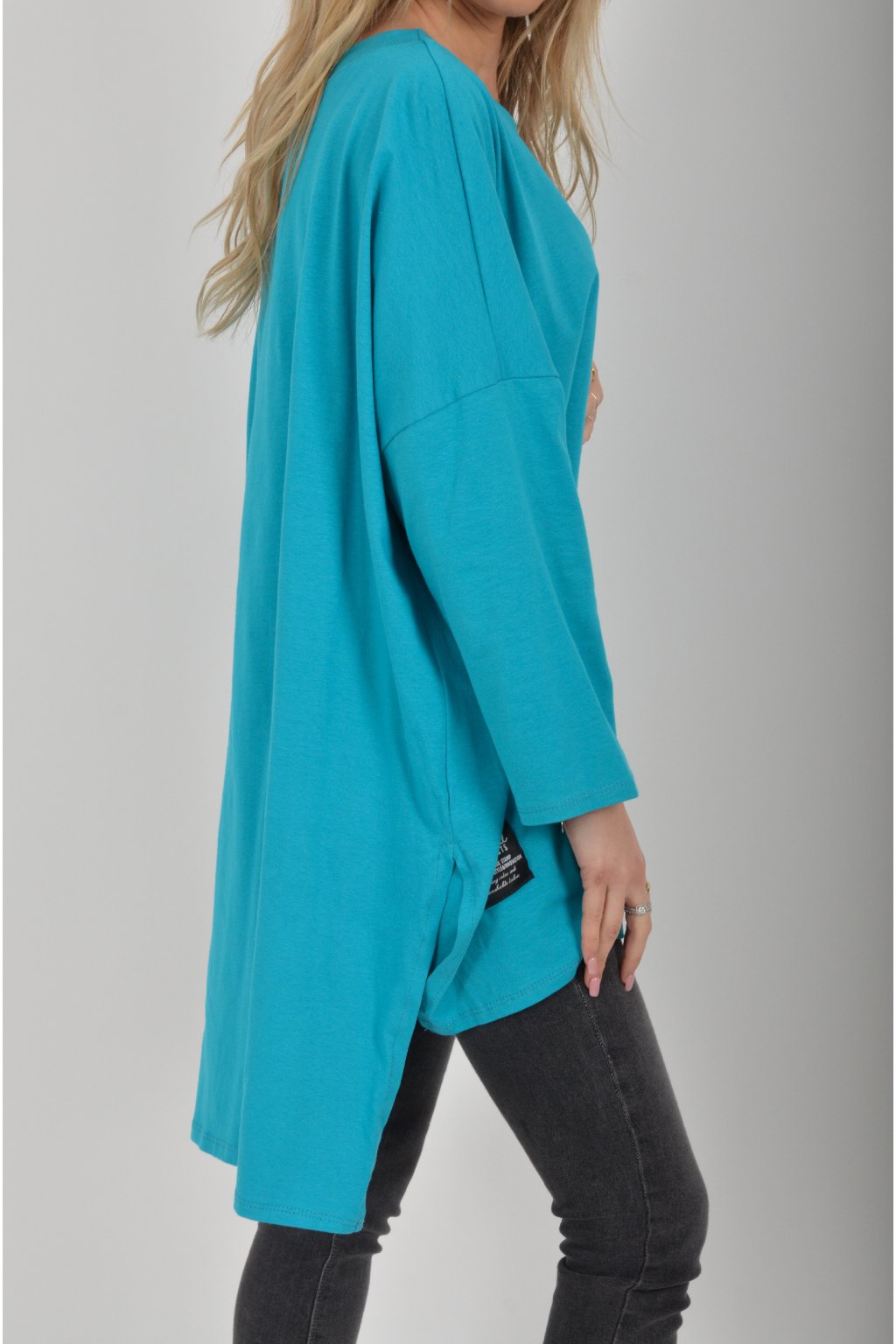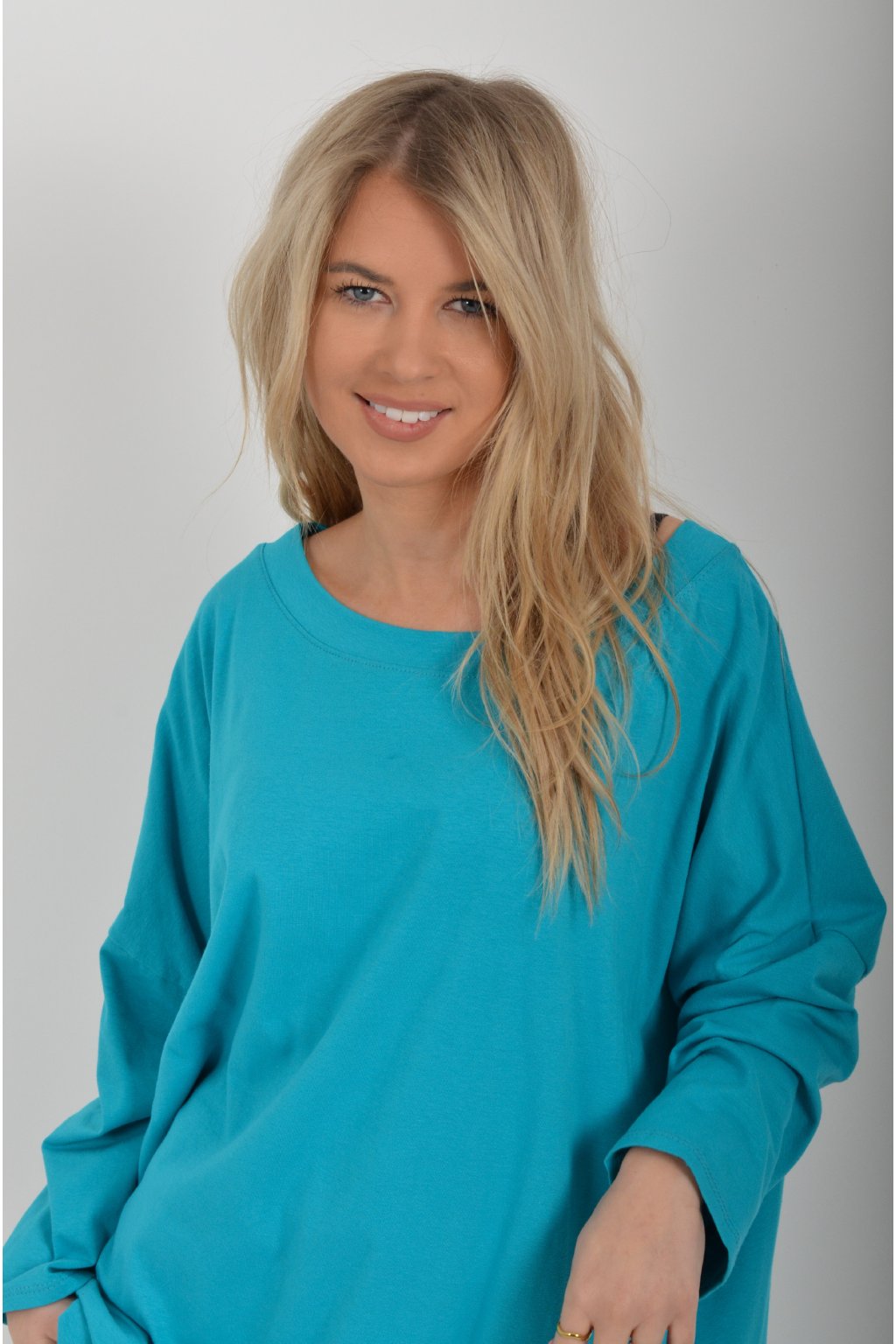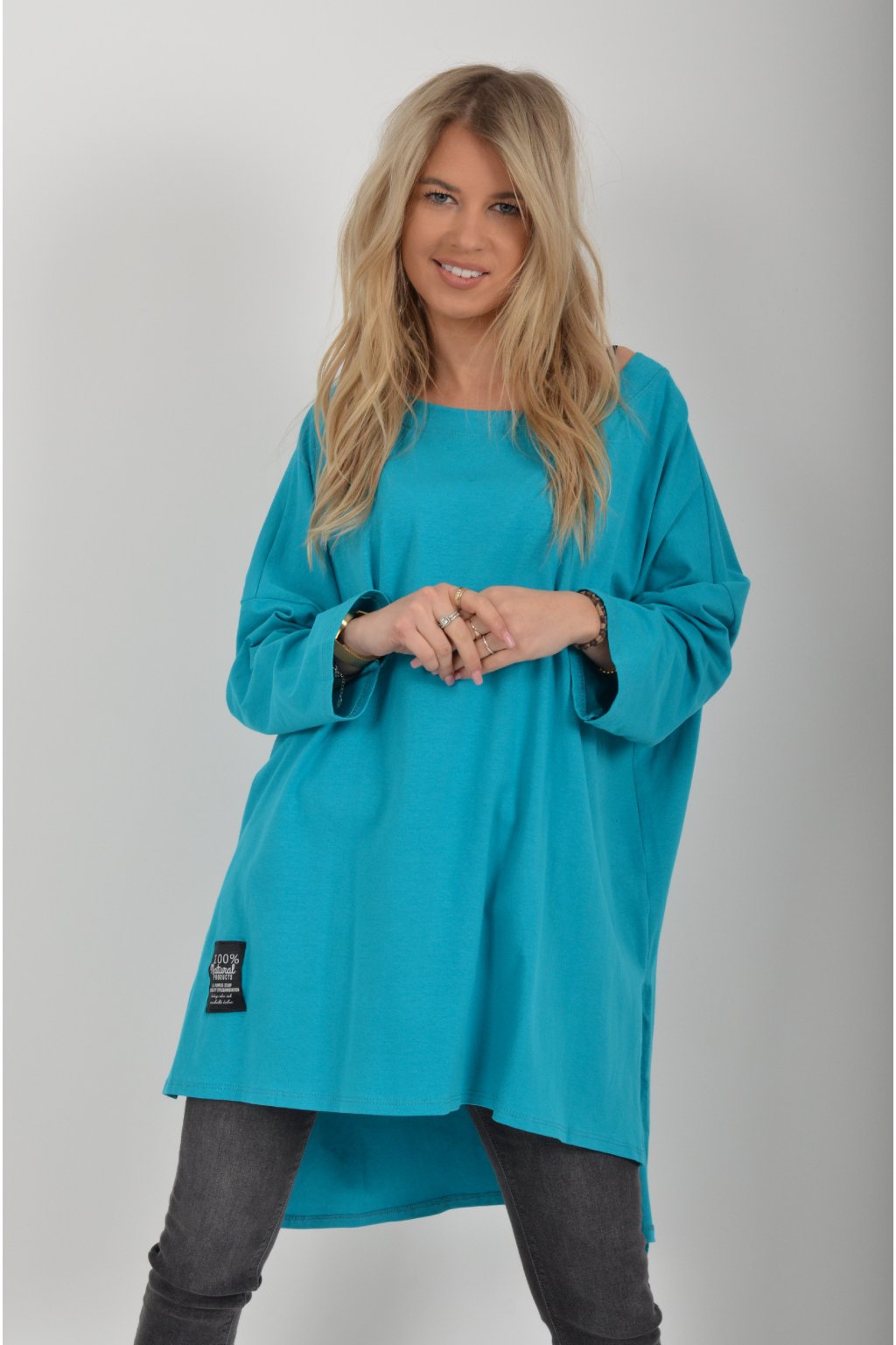 Jednobarevné oversize tričko s 3/4rukávem vyrobené z velice lehké, měkké a příjemné bavlny. Zadní část trička je delší než přední.