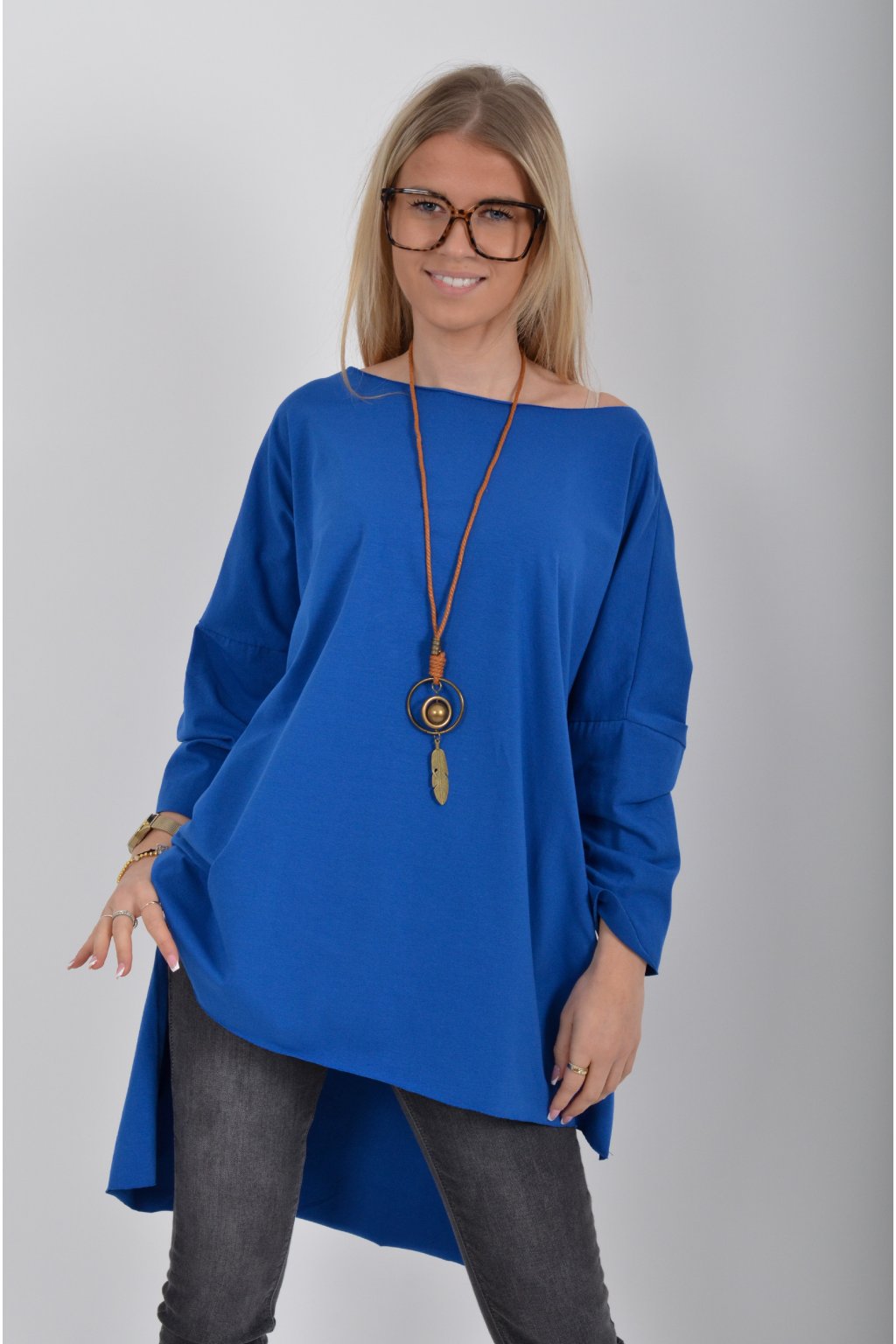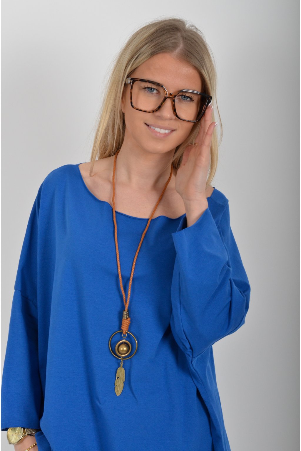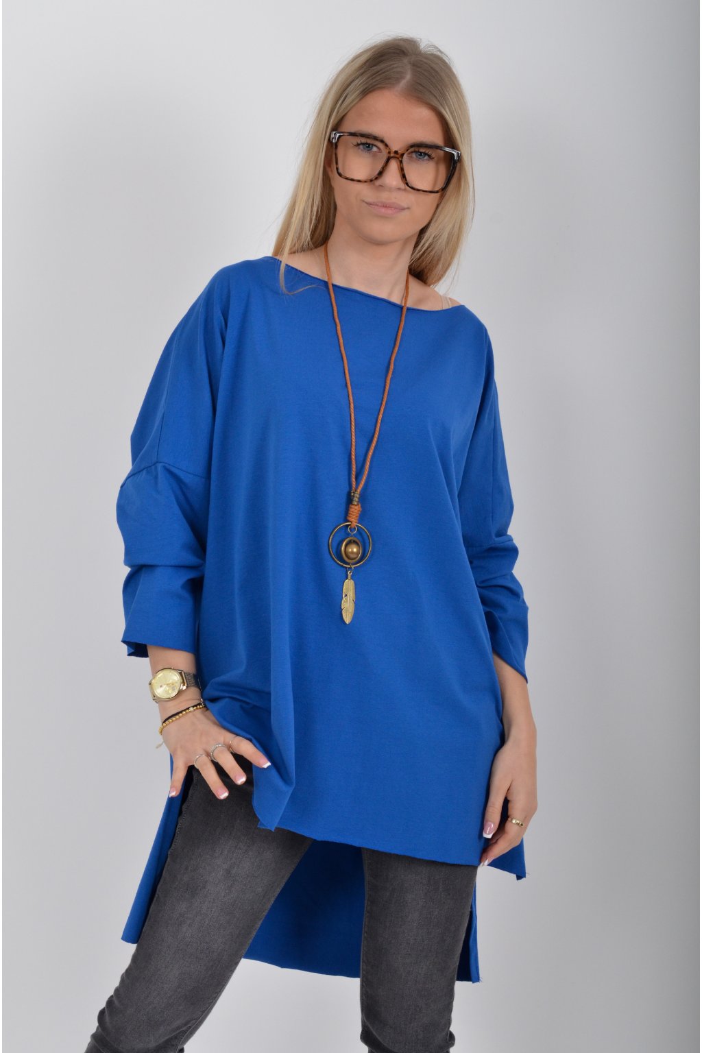 Jednobarevné oversize tričko s 3/4rukávem vyrobené z velice lehké, měkké a příjemné bavlny. Zadní část trička je delší než přední. K tričku je náhrdelník jako dárek.